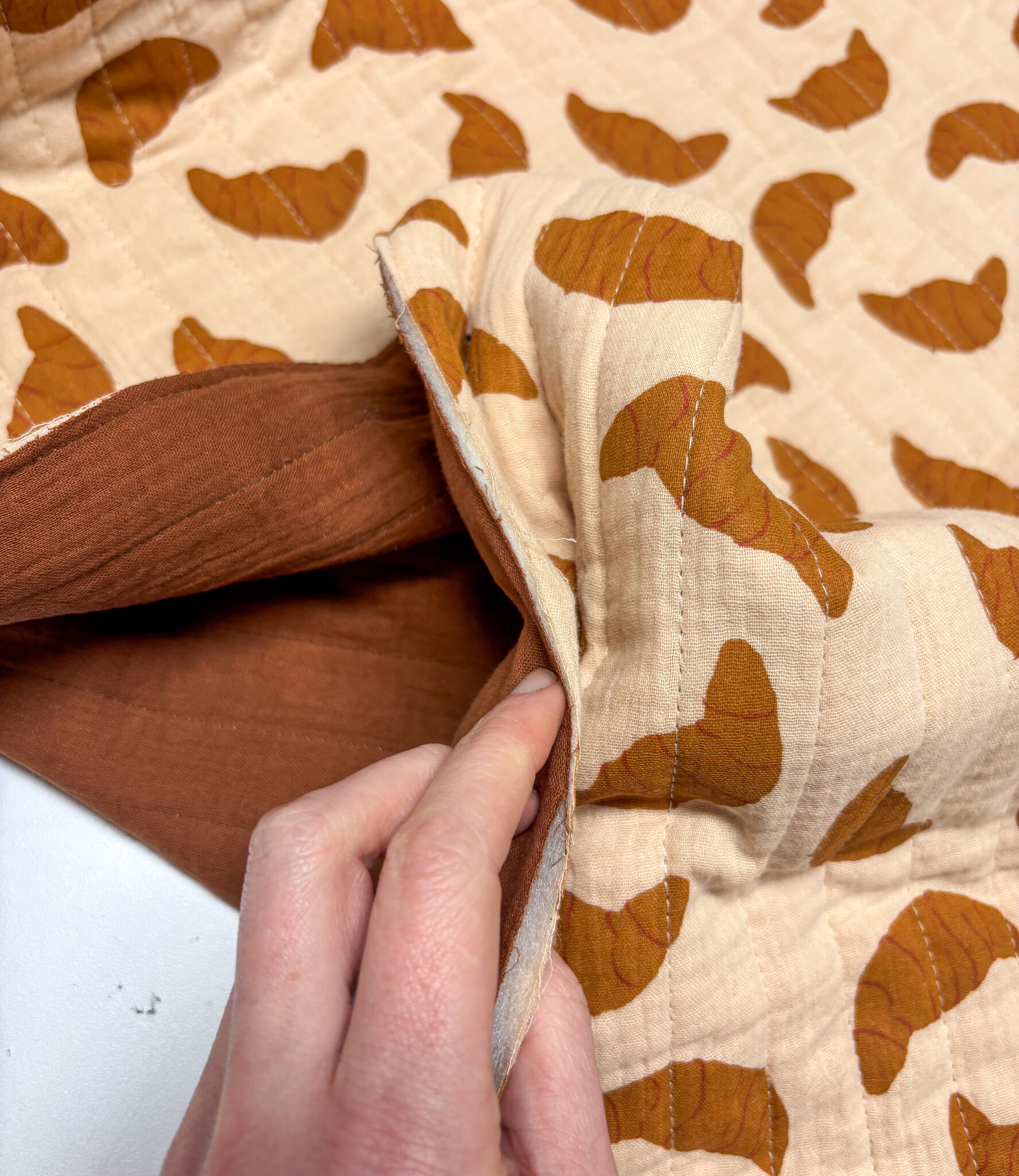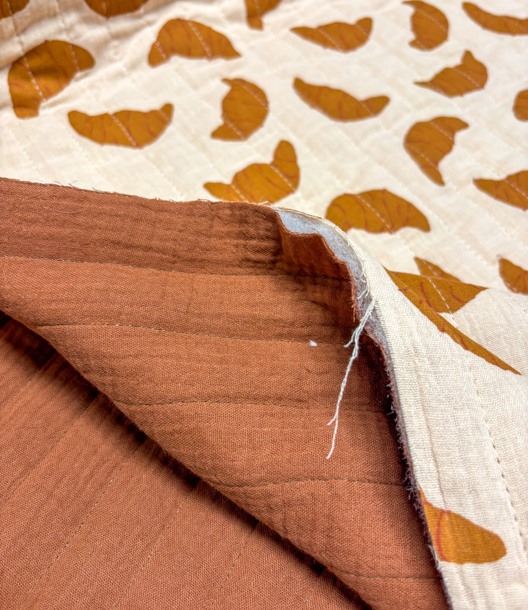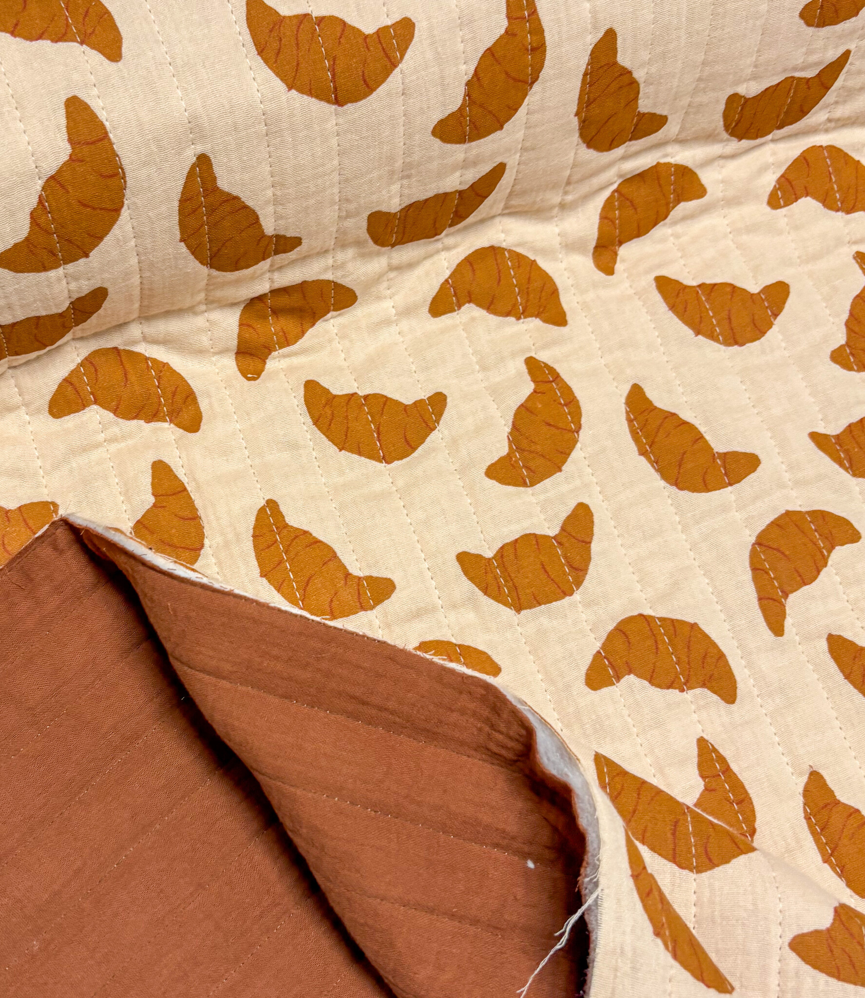 Een zachte gewatteerde double gauze tetra met croissants. Double face, dus deze stof is bruikbaar langs beide kanten. Perfect voor jasjes, bodywarmers, dekentjes, ... Perfect voor de Junna vest van Bel 'Etoile. Ook perfect voor de Junna Bodywarmer (ritsvest) van Bel 'Etoile.
