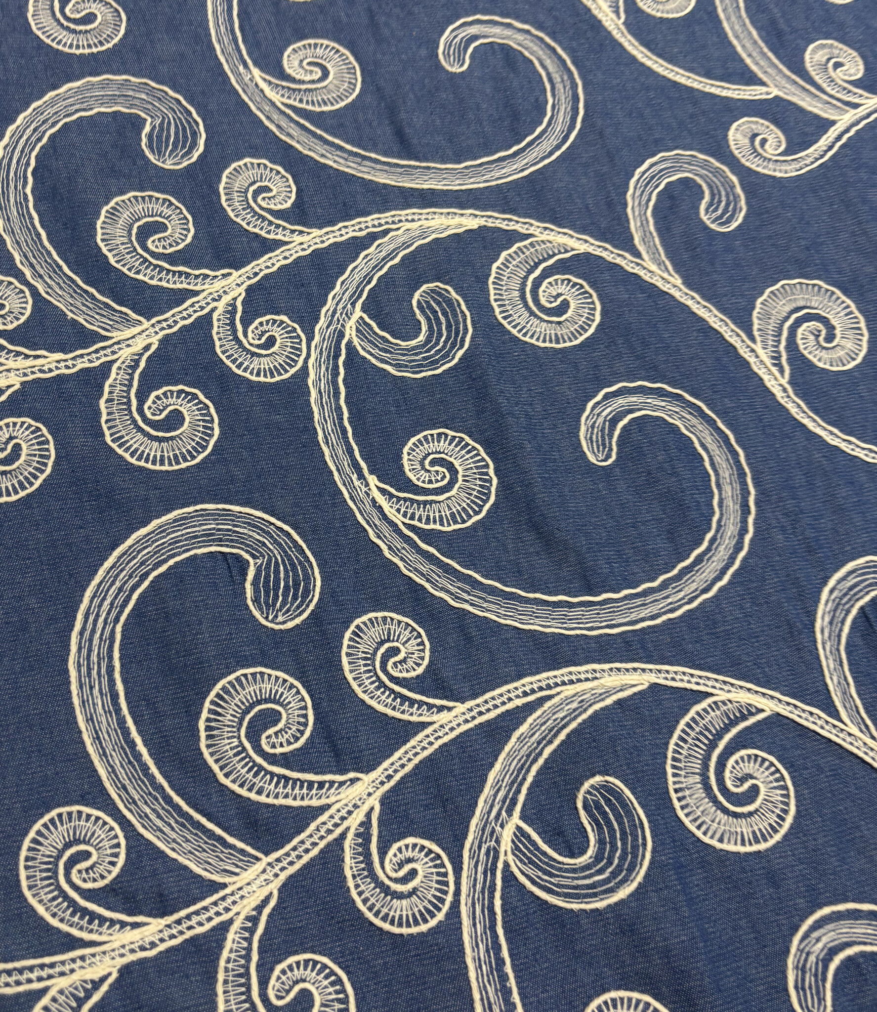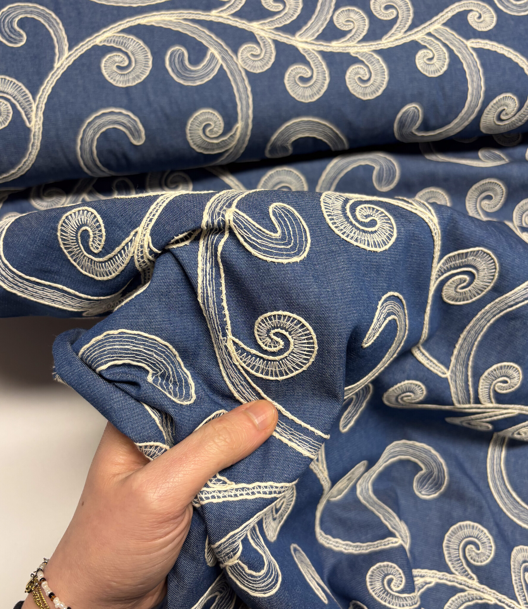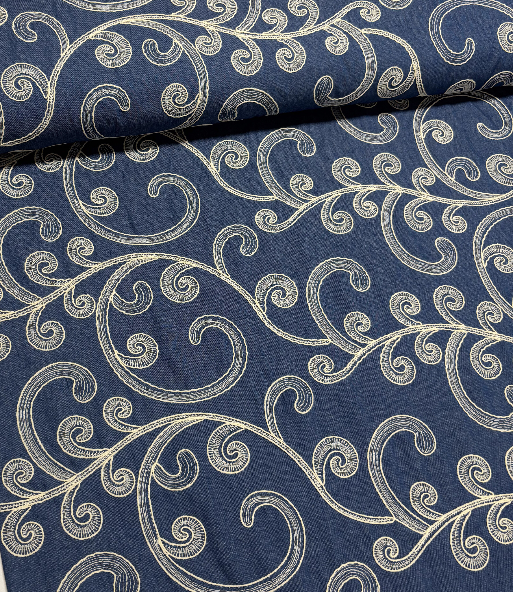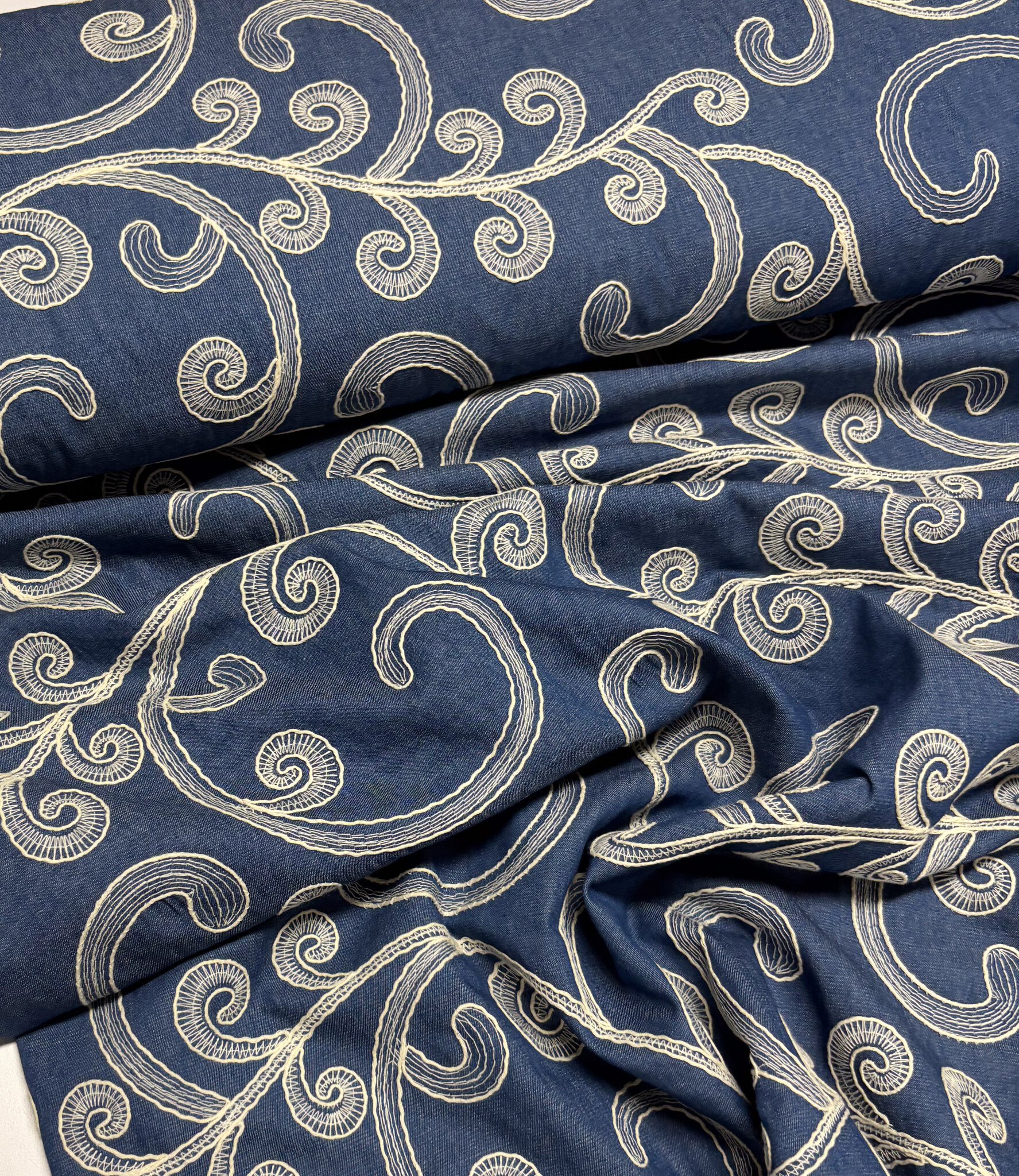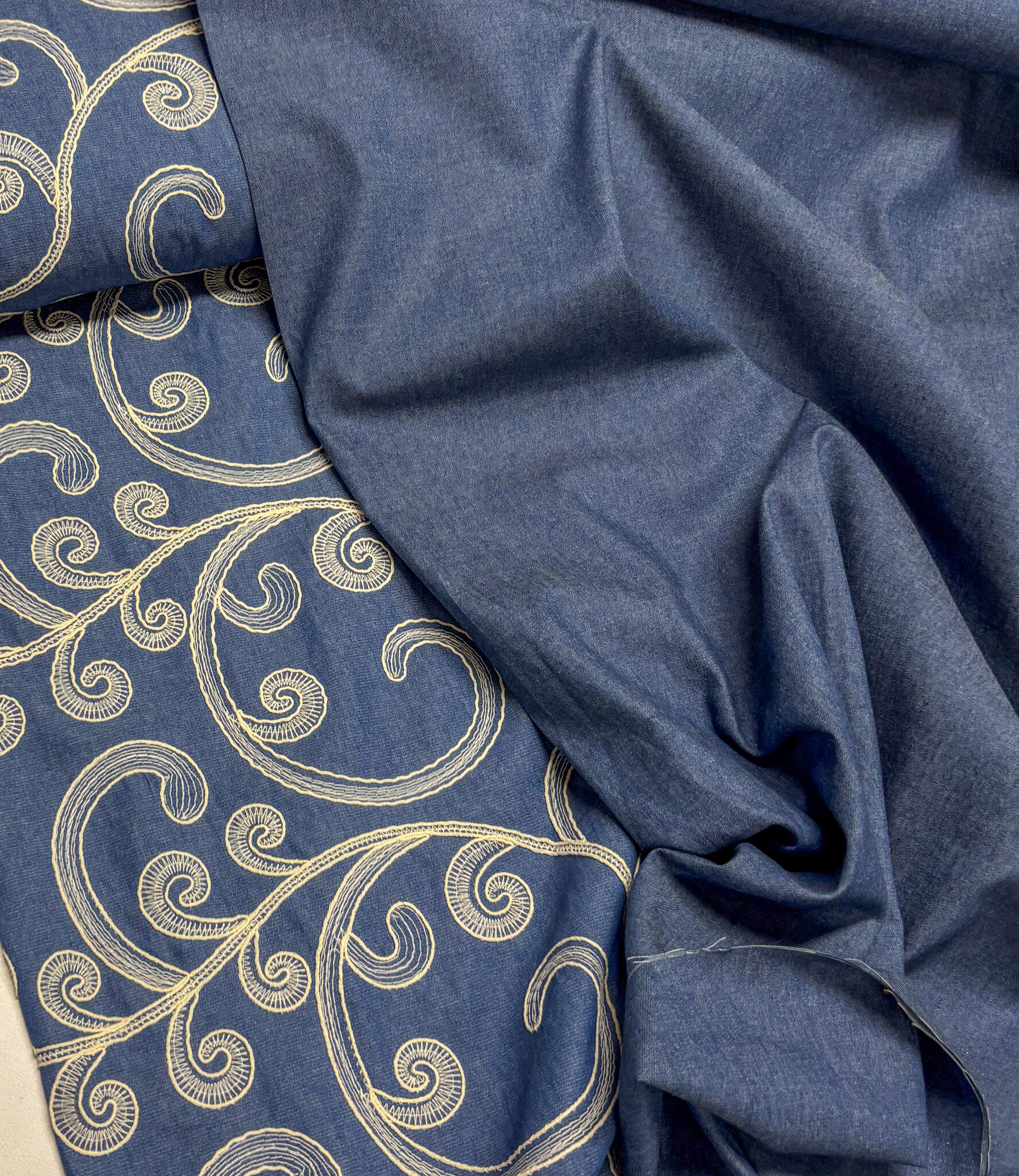 Een prachtige denim katoen met broderie print. Valt soepel en dus perfect voor broeken, kleedjes, blouses, ...