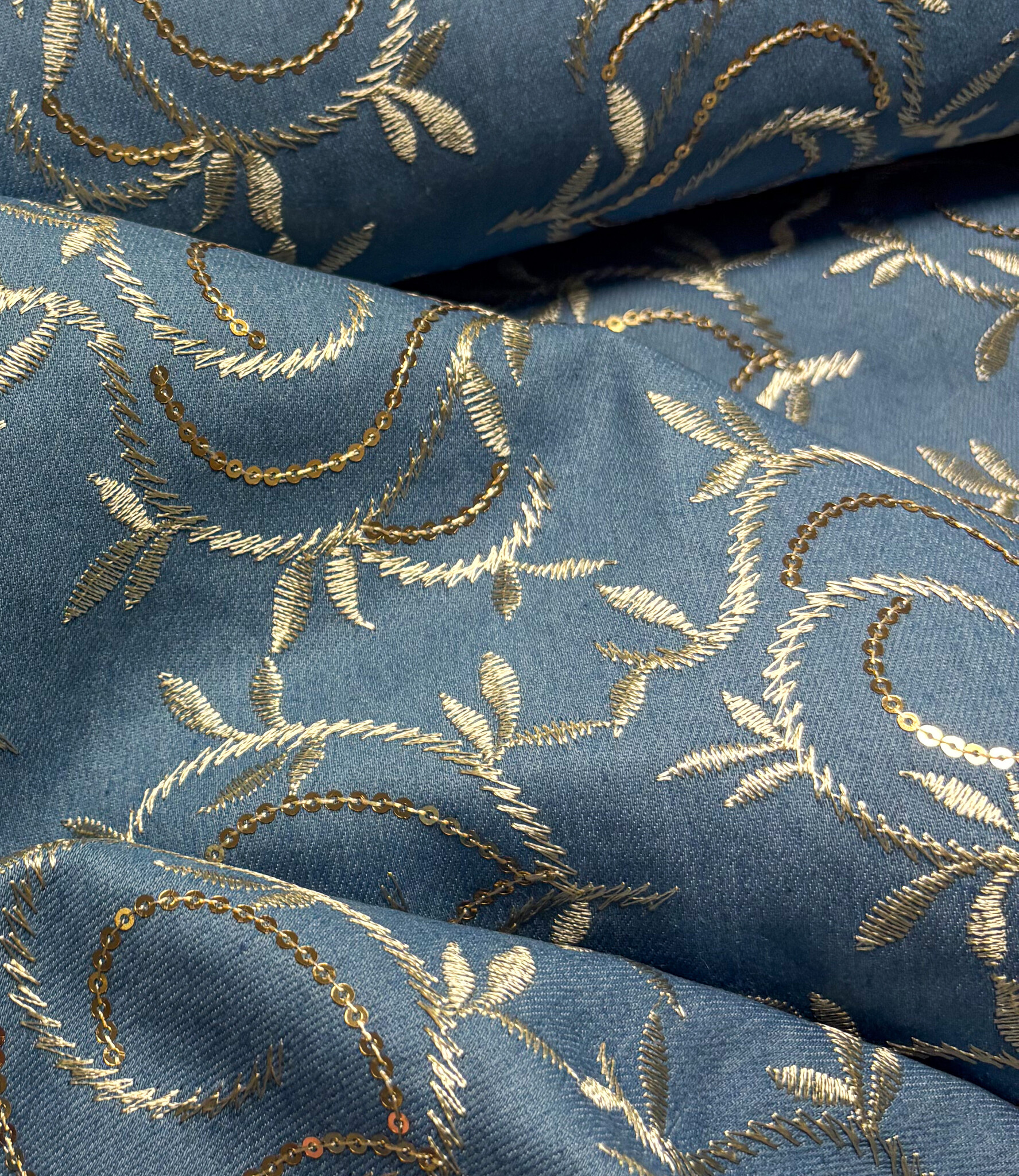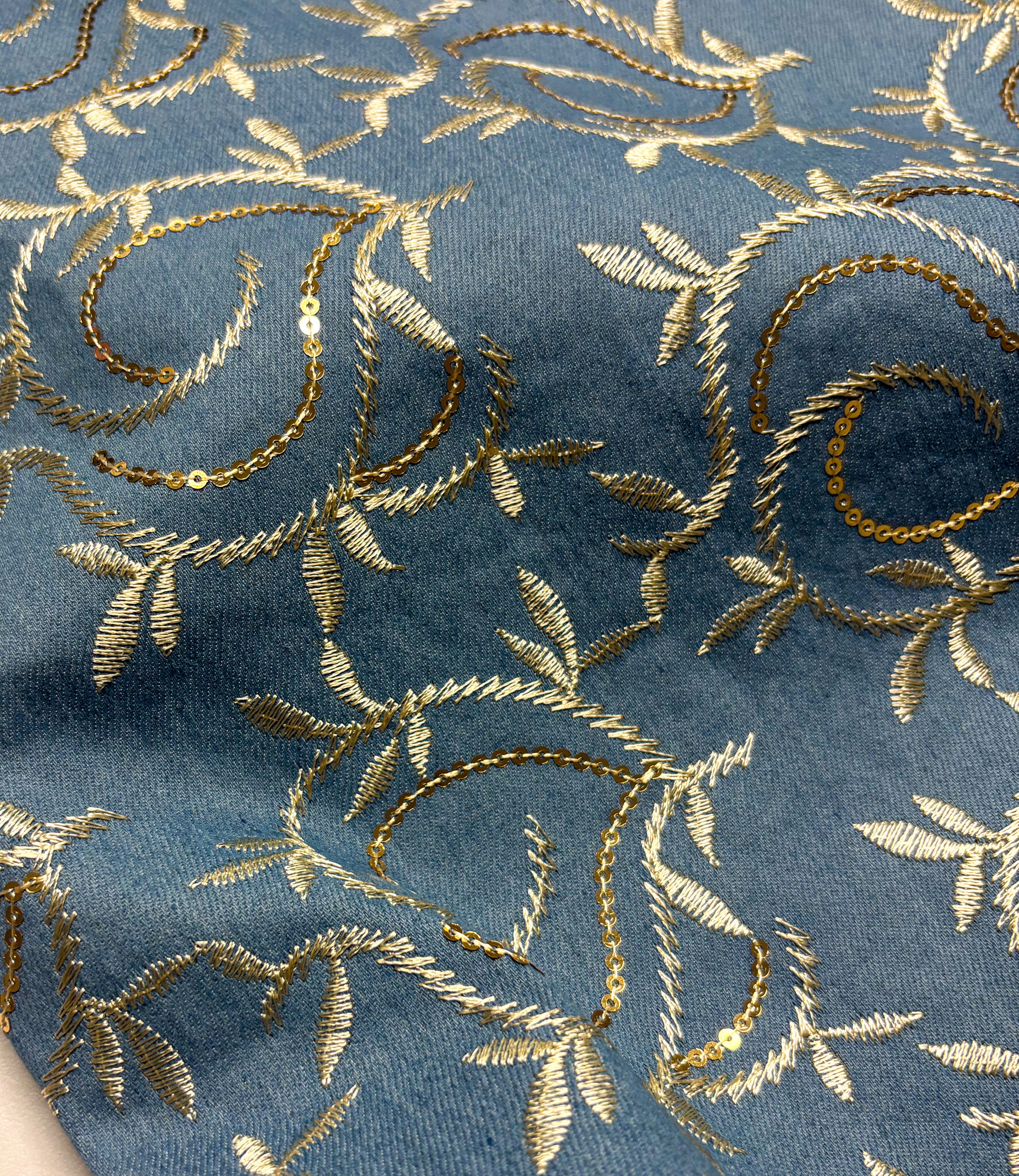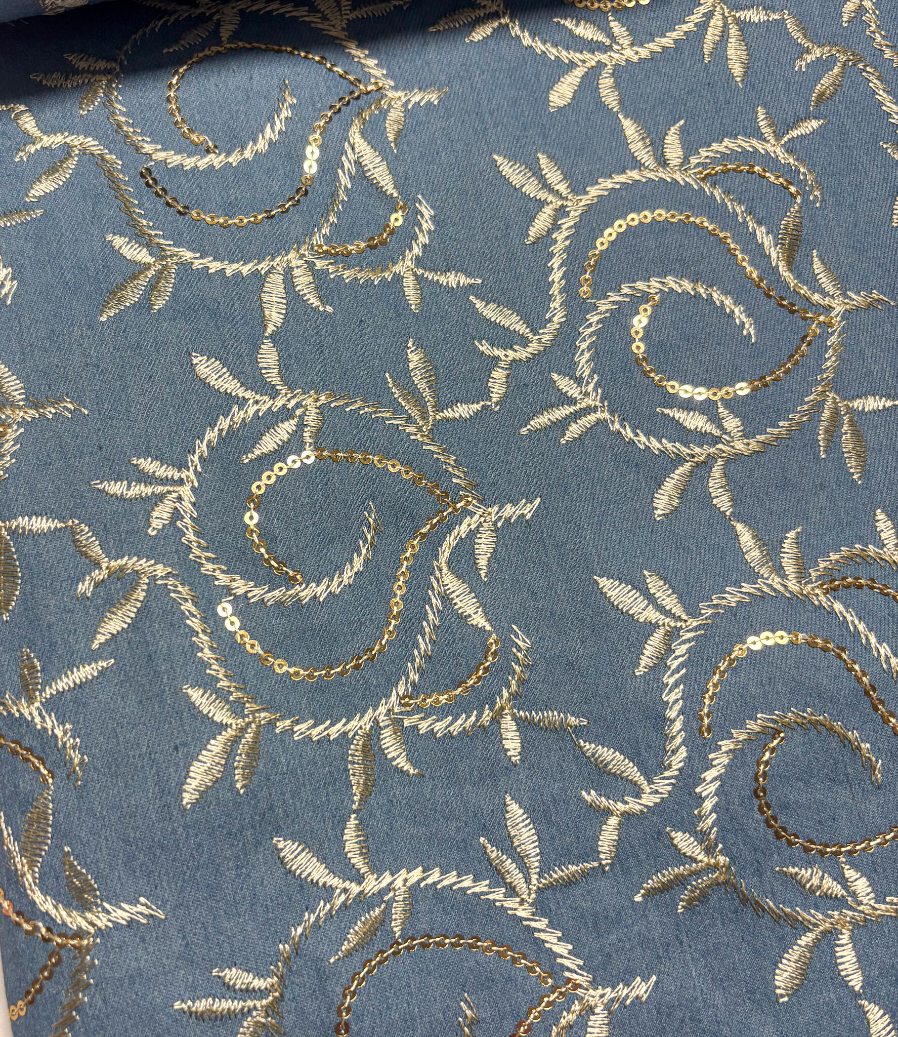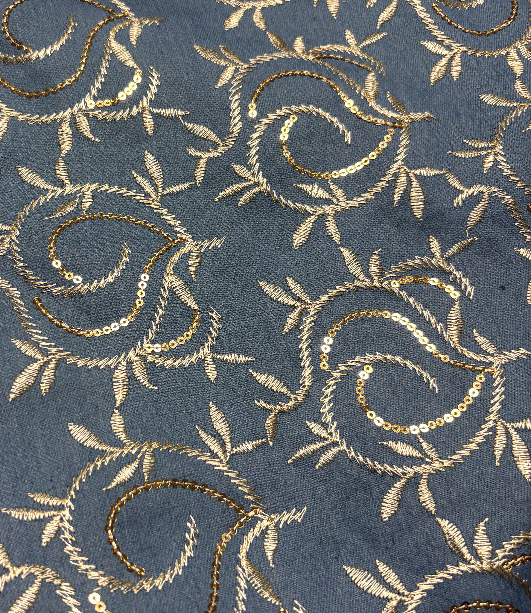 Een denim jeans stof met geborduurde gouden bladeren en pailletten. Perfect voor broeken, jeansvesten, rokken, ...