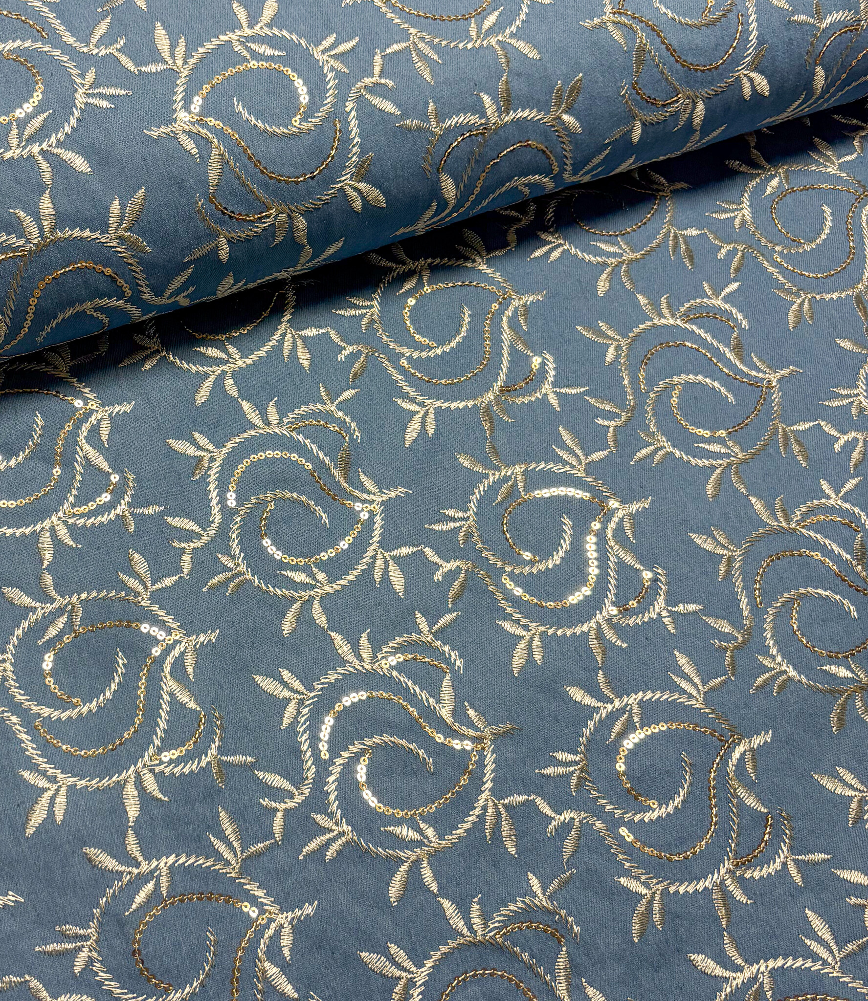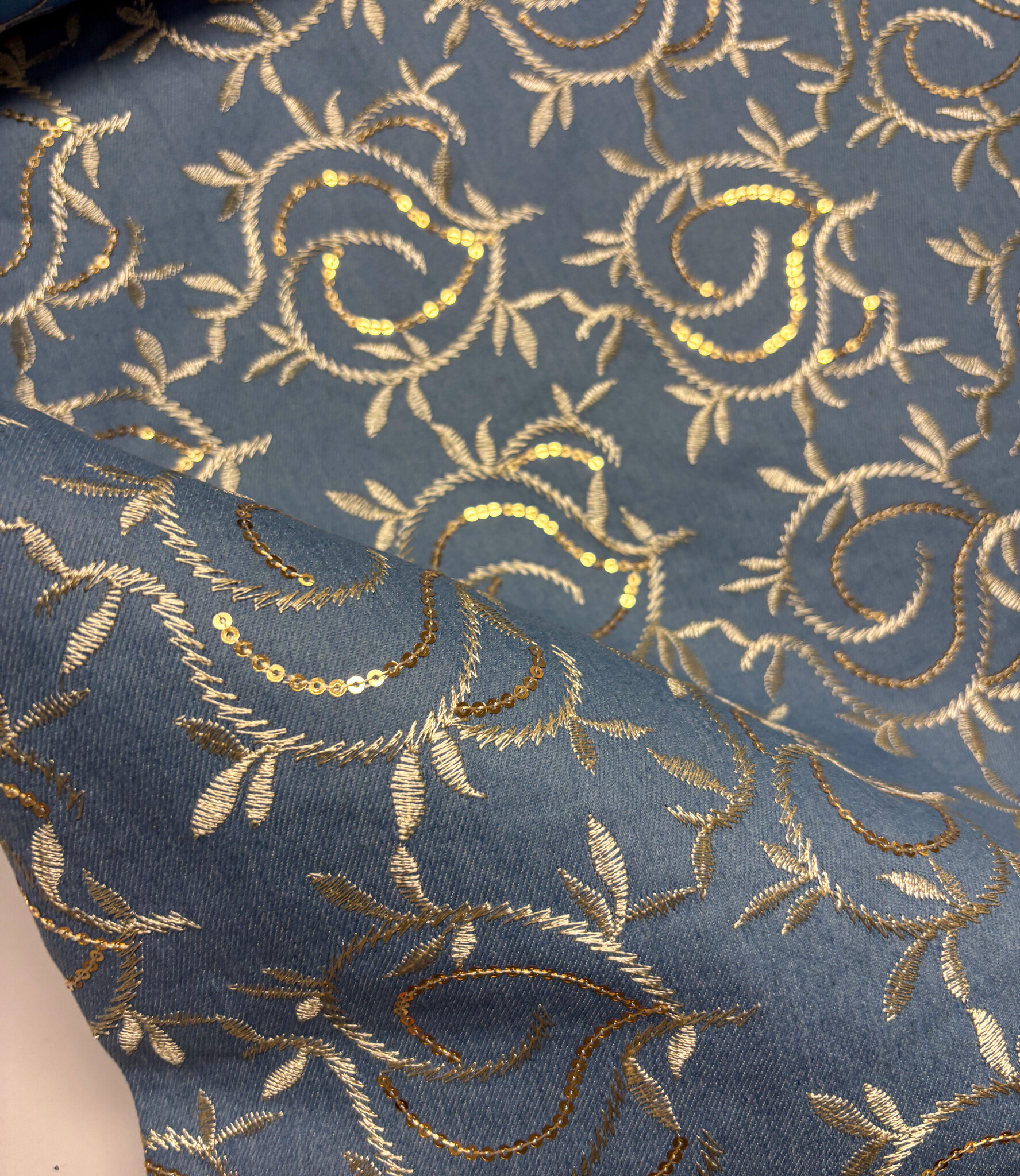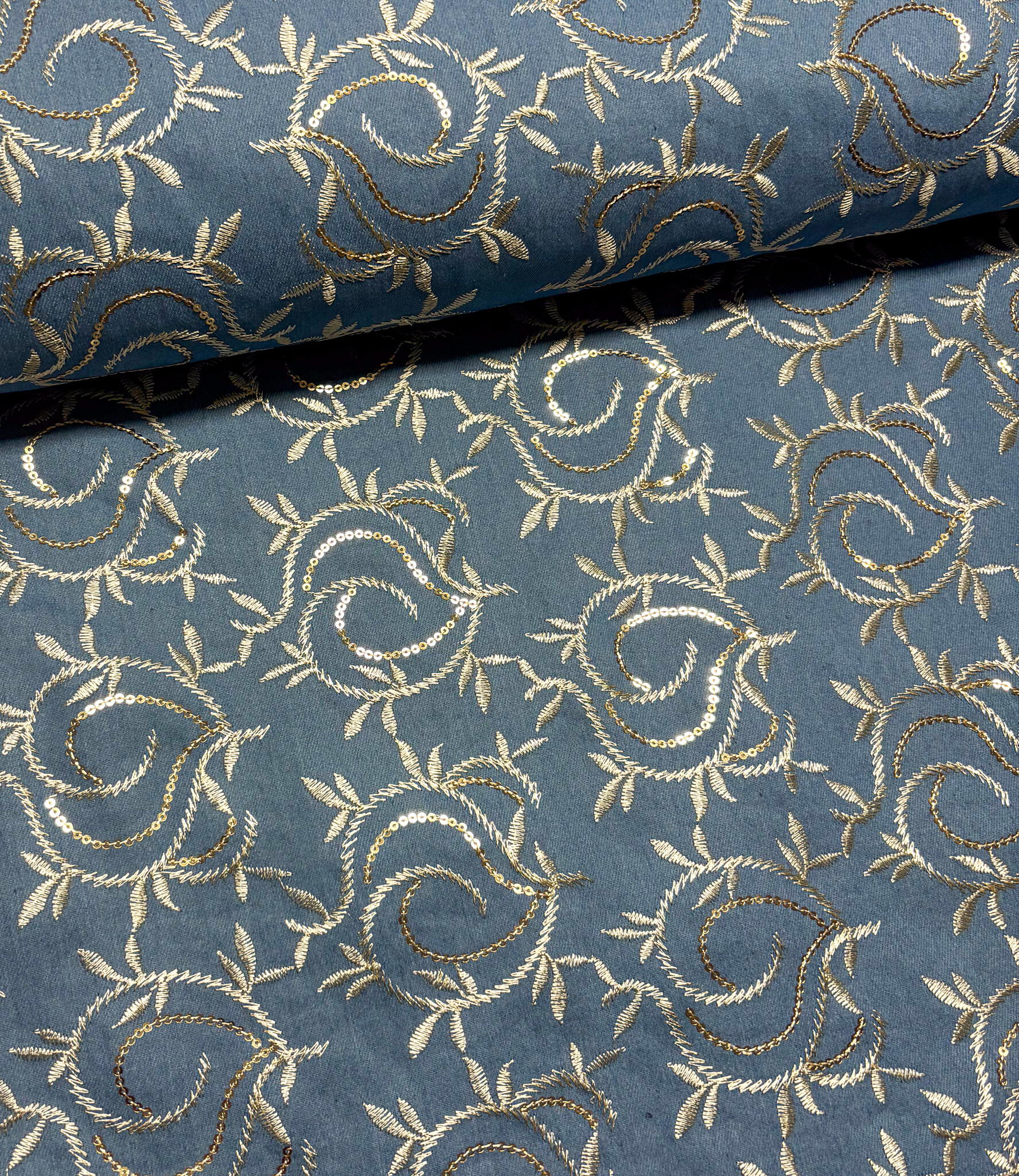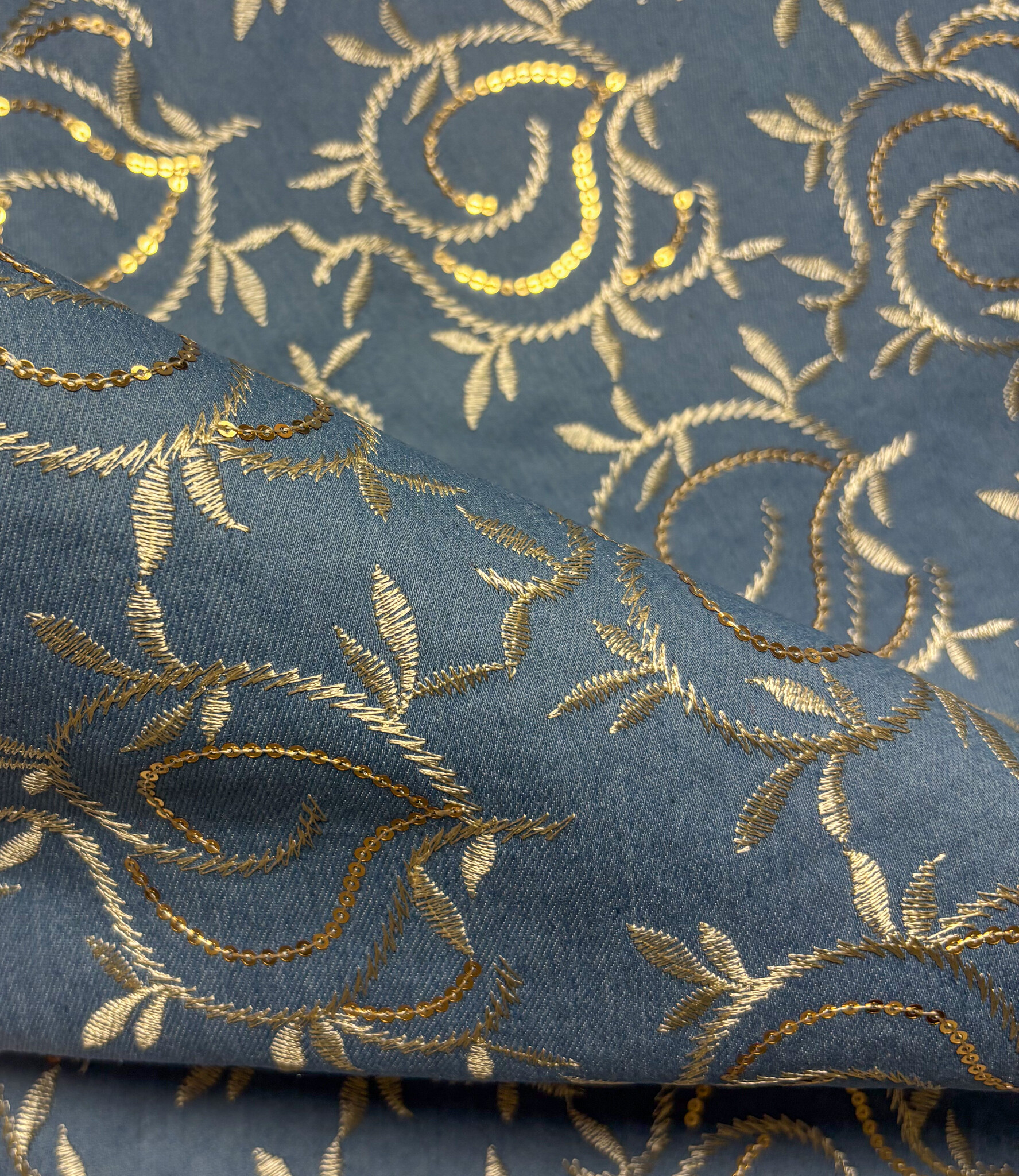Een denim jeans stof met geborduurde gouden bladeren en pailletten. Perfect voor broeken, jeansvesten, rokken, ...