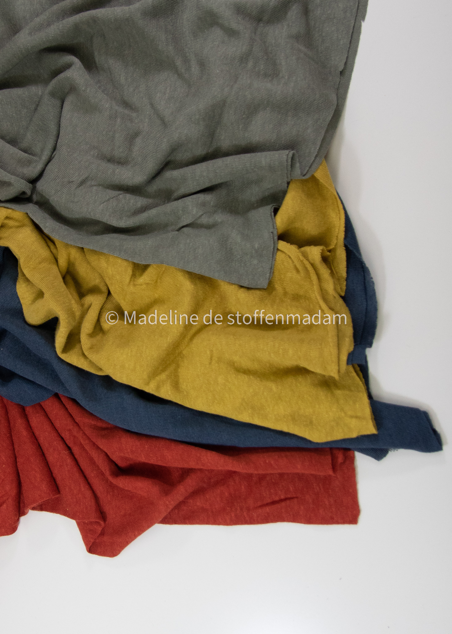 Een soepelvallende stof met een mix van 45% viscose en 55% linnen. Deze stof valt heerlijk soepel.