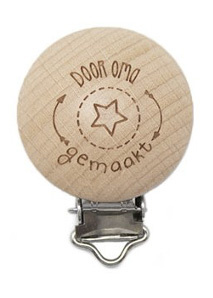 Een schattige fopspeenklem van glad hout met tekst "Door oma gemaakt".