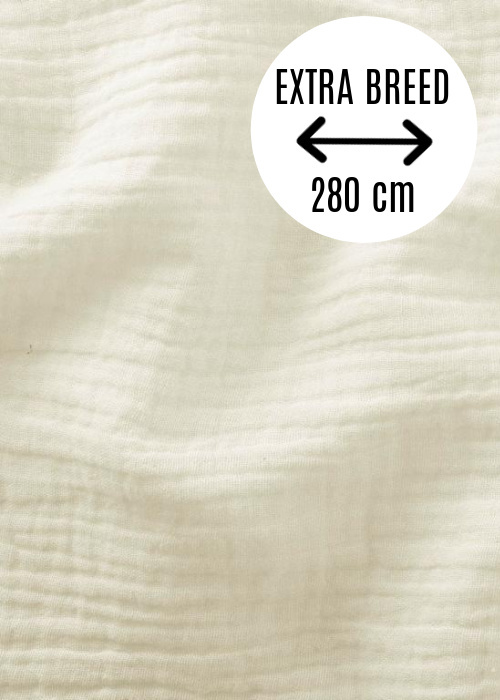 Deze double gauze is 280 cm breed!! Ideaal om je eigen luchtige lakens of dekbedovertrek te maken. Maar daarnaast uiteraard ook prima geschikt voor zachte kleding.