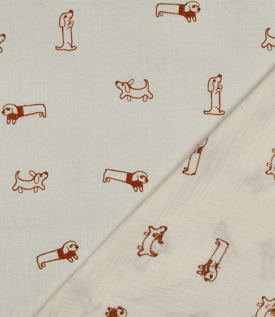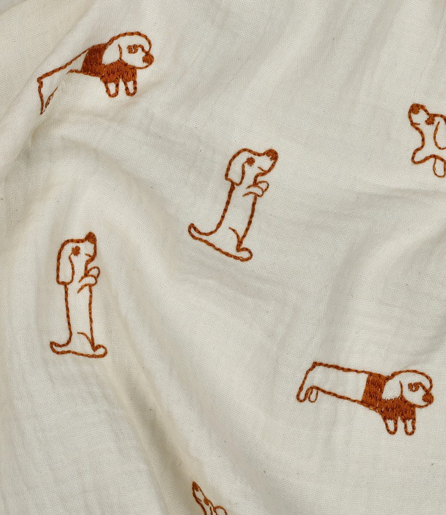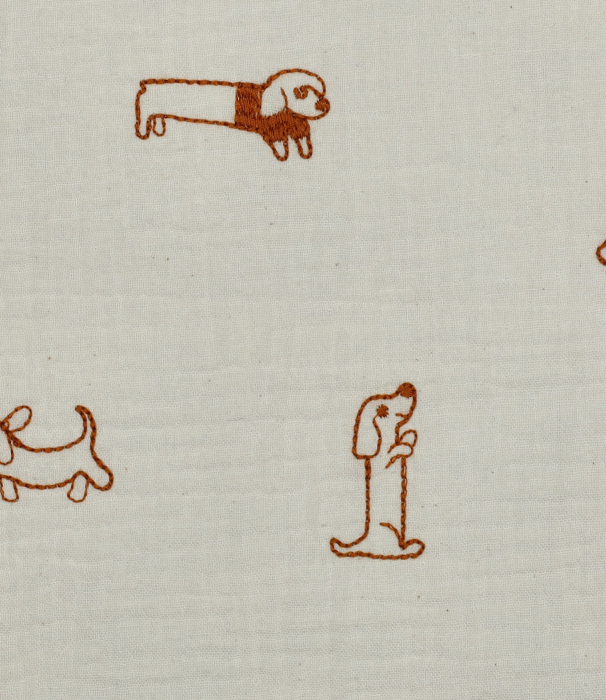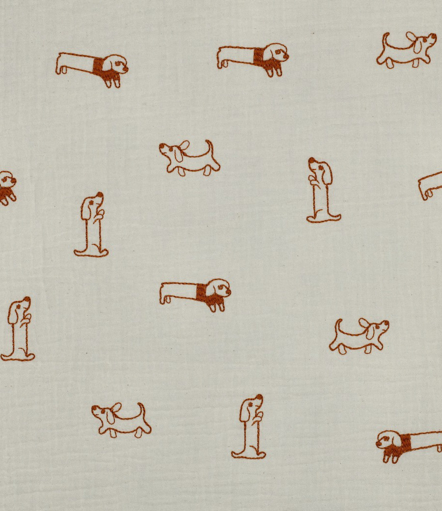 Een zachte tetra stof, double gauze met geborduurde hondjesprint. Perfect voor jurken en bloesjes. Zowel voor kinderen als volwassenen. Heerlijk zacht en luchtig! OEKO-tex.