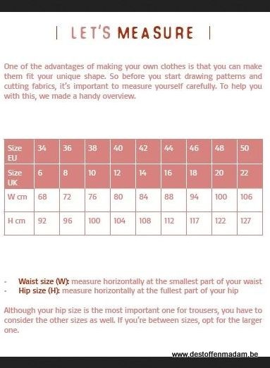 Gebruik soepelvallende stoffen en kies voor bijvoorbeeld viscose, tencel, niet-statische polyester,… Stugge stoffen zoals zwaardere katoen zijn af te raden omdat de broek dan niet mooi zal vallen.