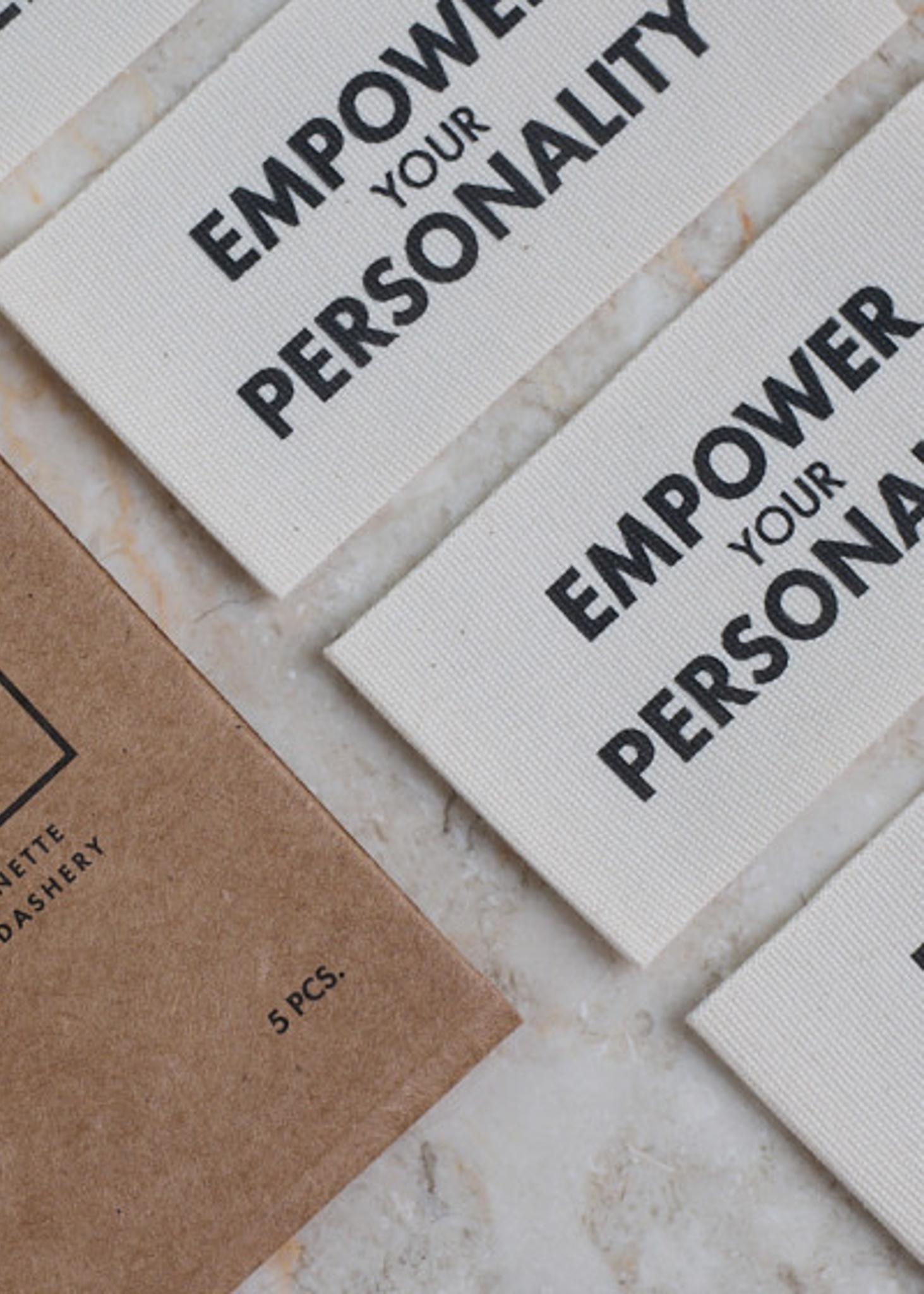 5 geweven kledinglabels om in te naaien, met quote "Empower your personality" - Atelier Brunette