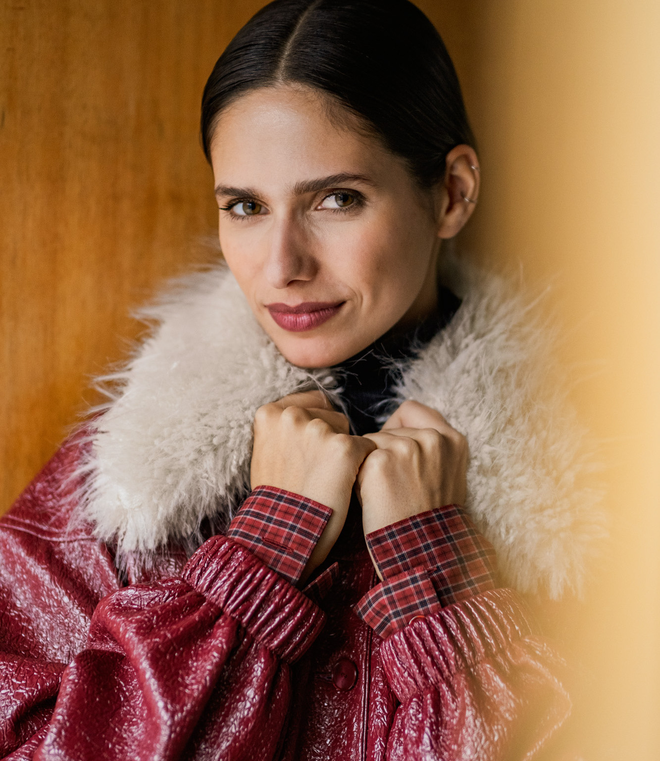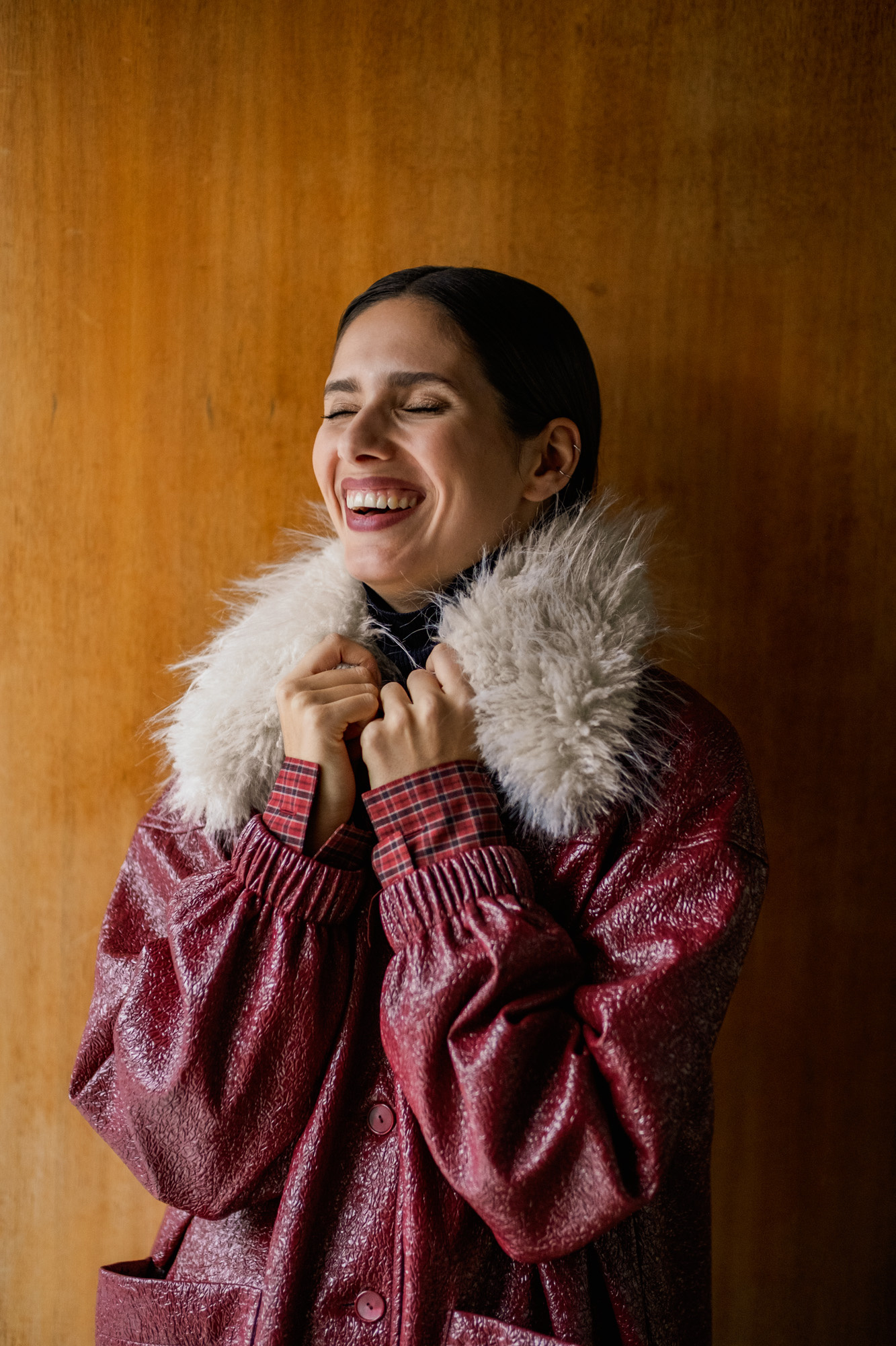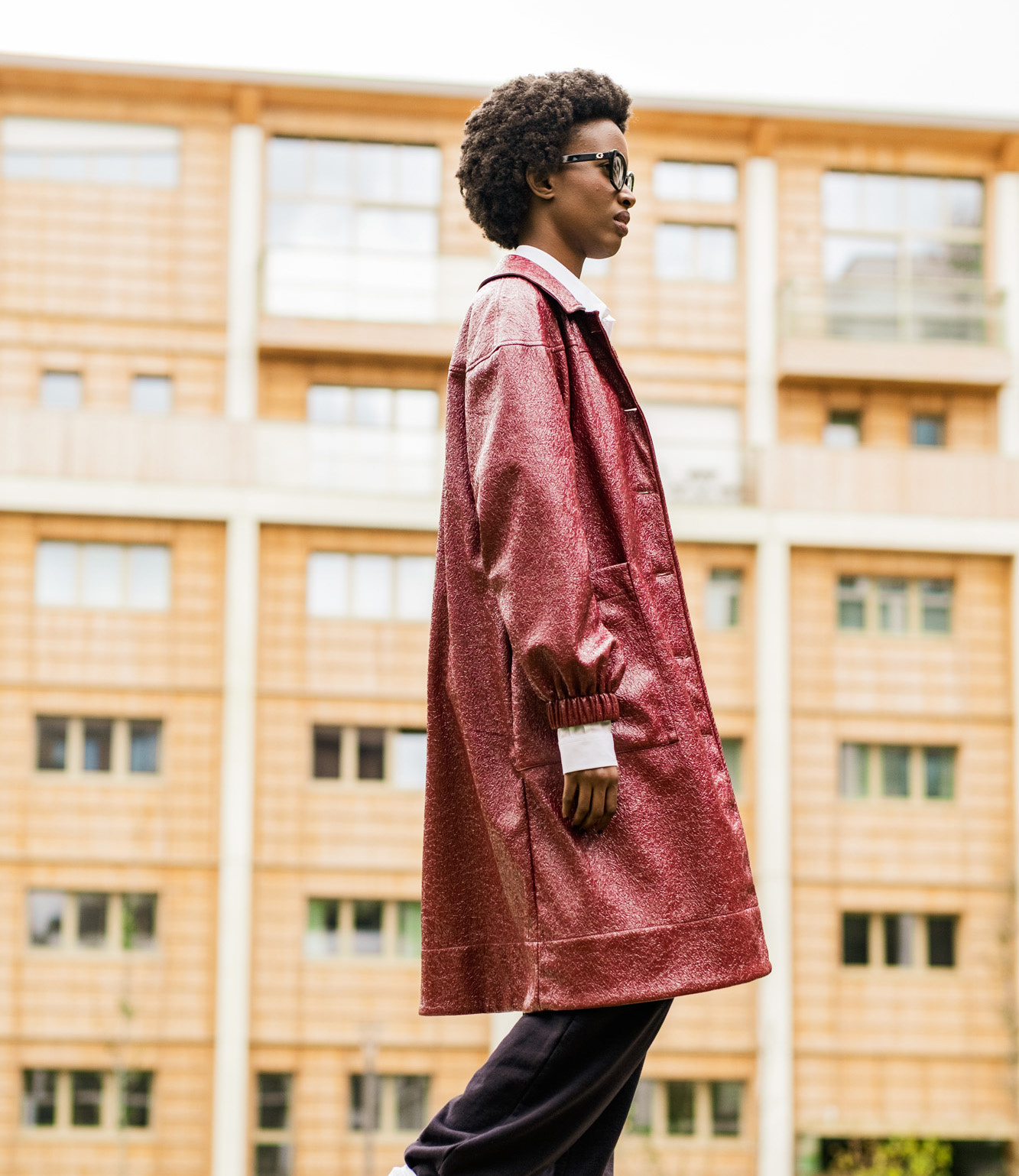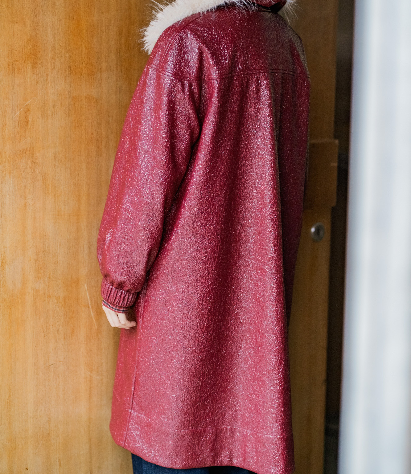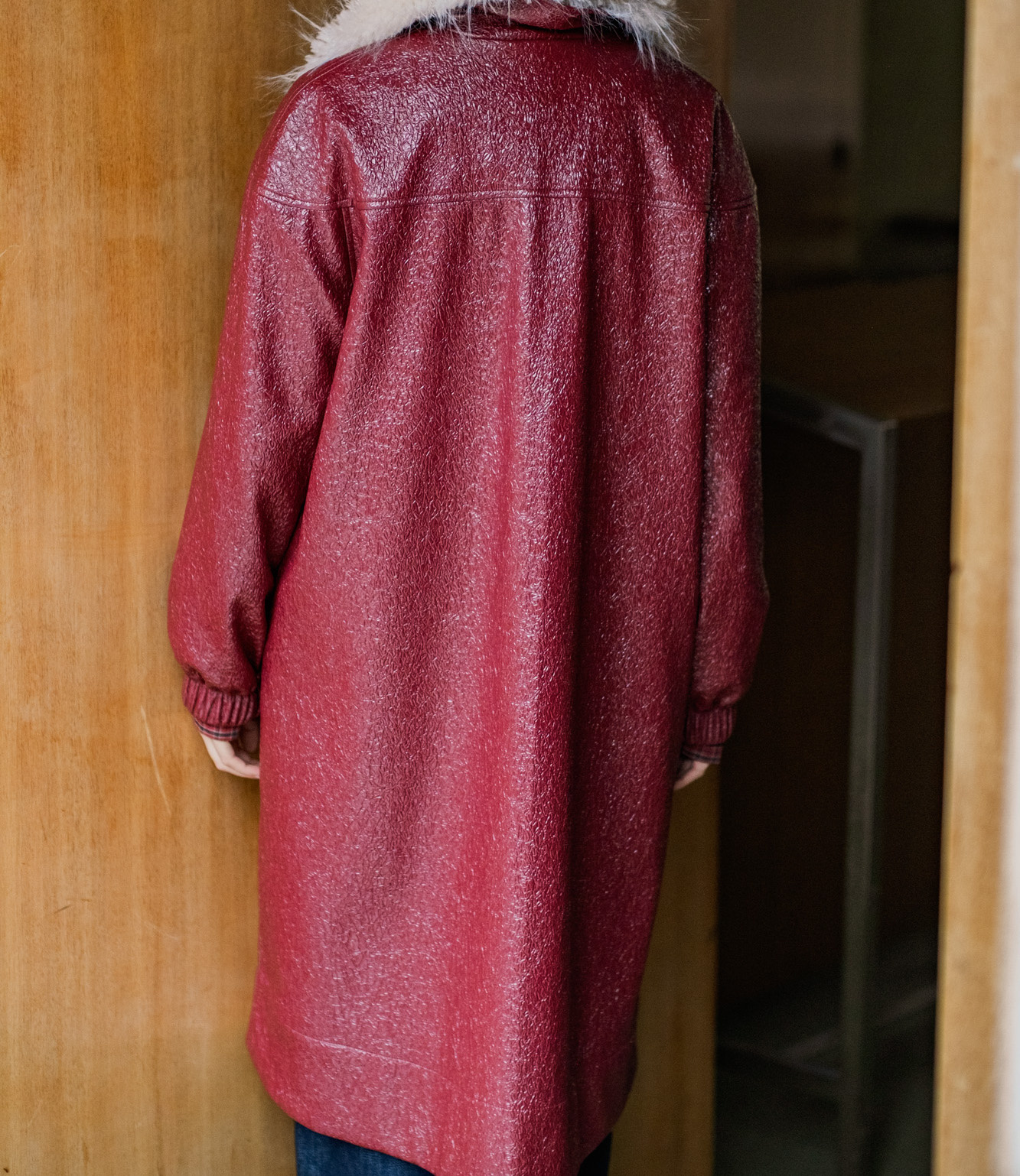 Een donkerrode imitatieleer. Perfect voor vesten, rokken, broeken, ... Deze stof wordt gebruikt in het Fibre Mood magazine editie 36.
