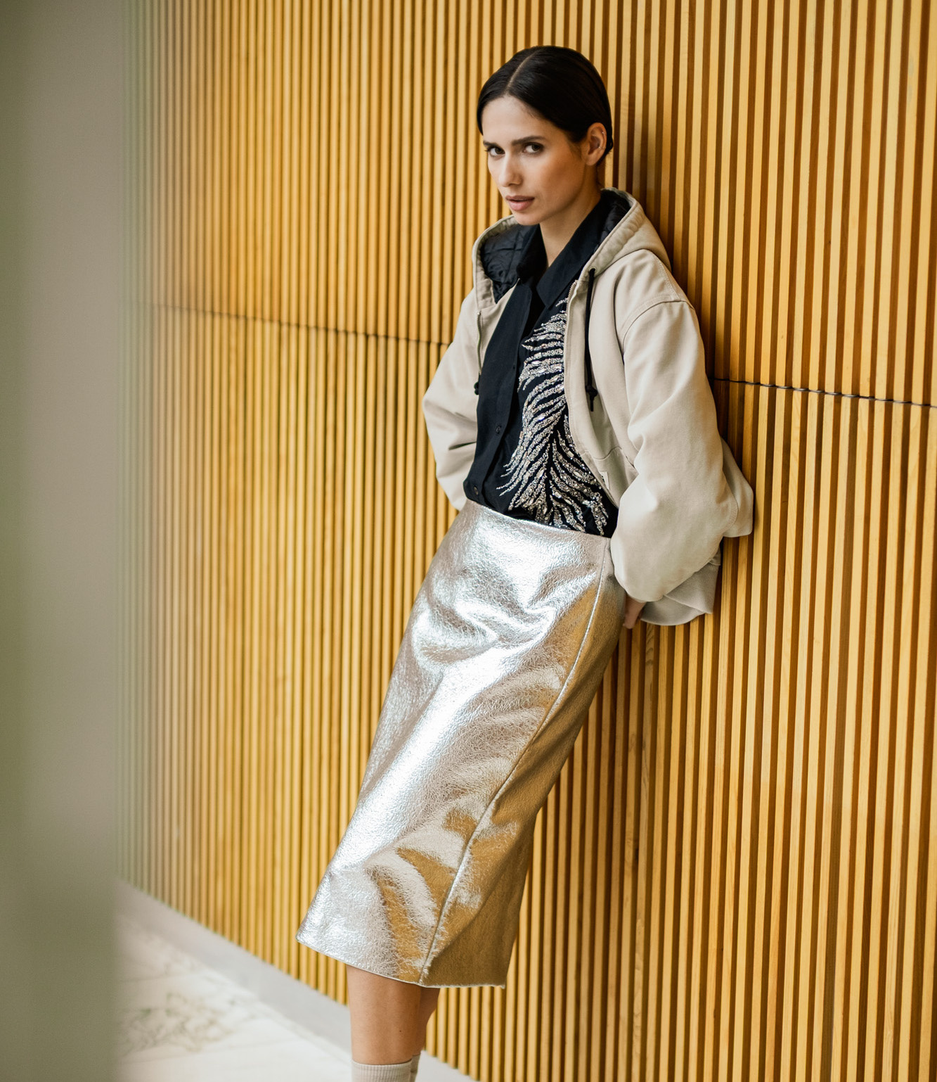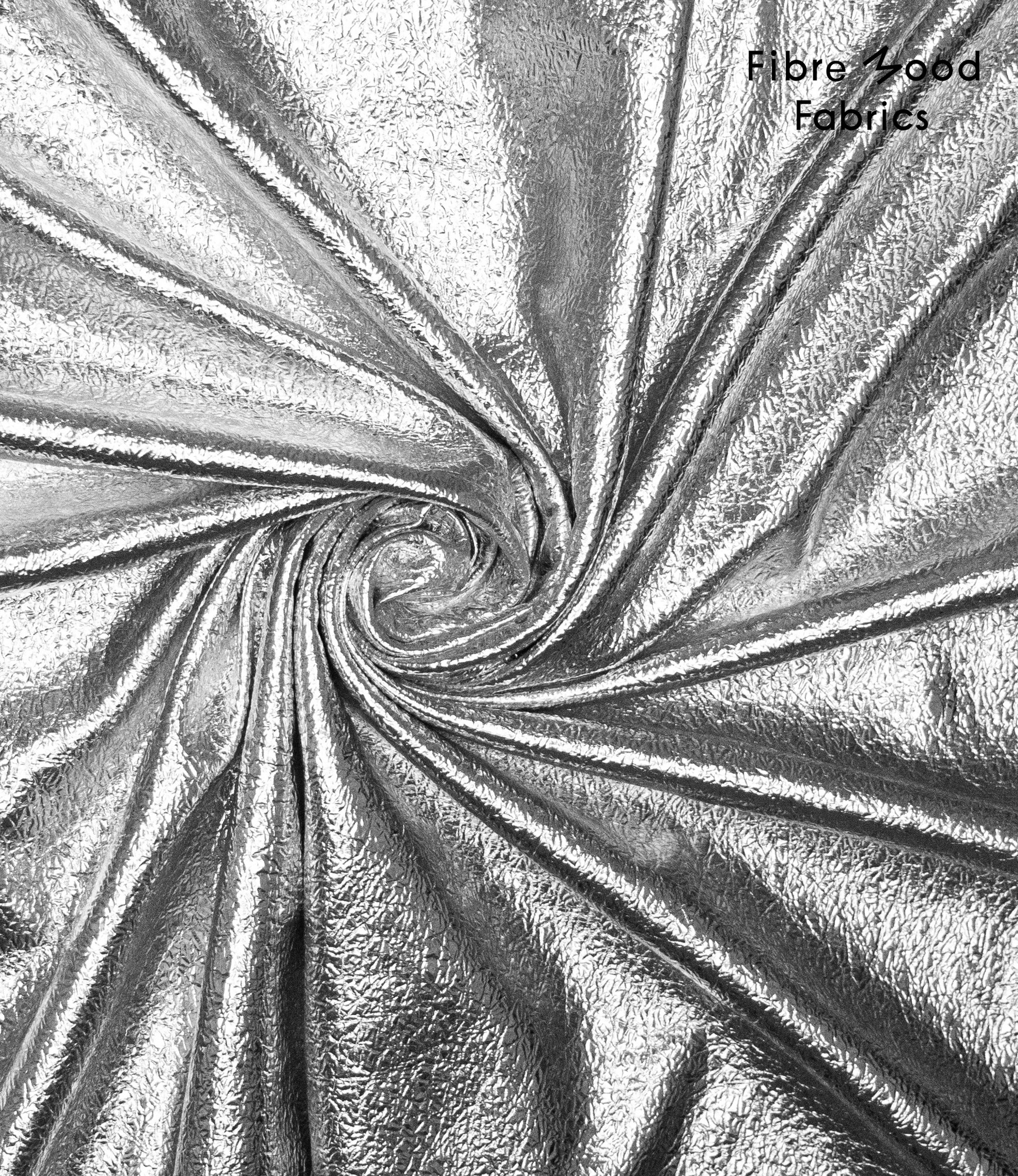 Een zilverkleurig imitatieleer. Perfect voor vesten, rokken, broeken, ... Deze stof wordt gebruikt in het Fibre Mood magazine editie 36.