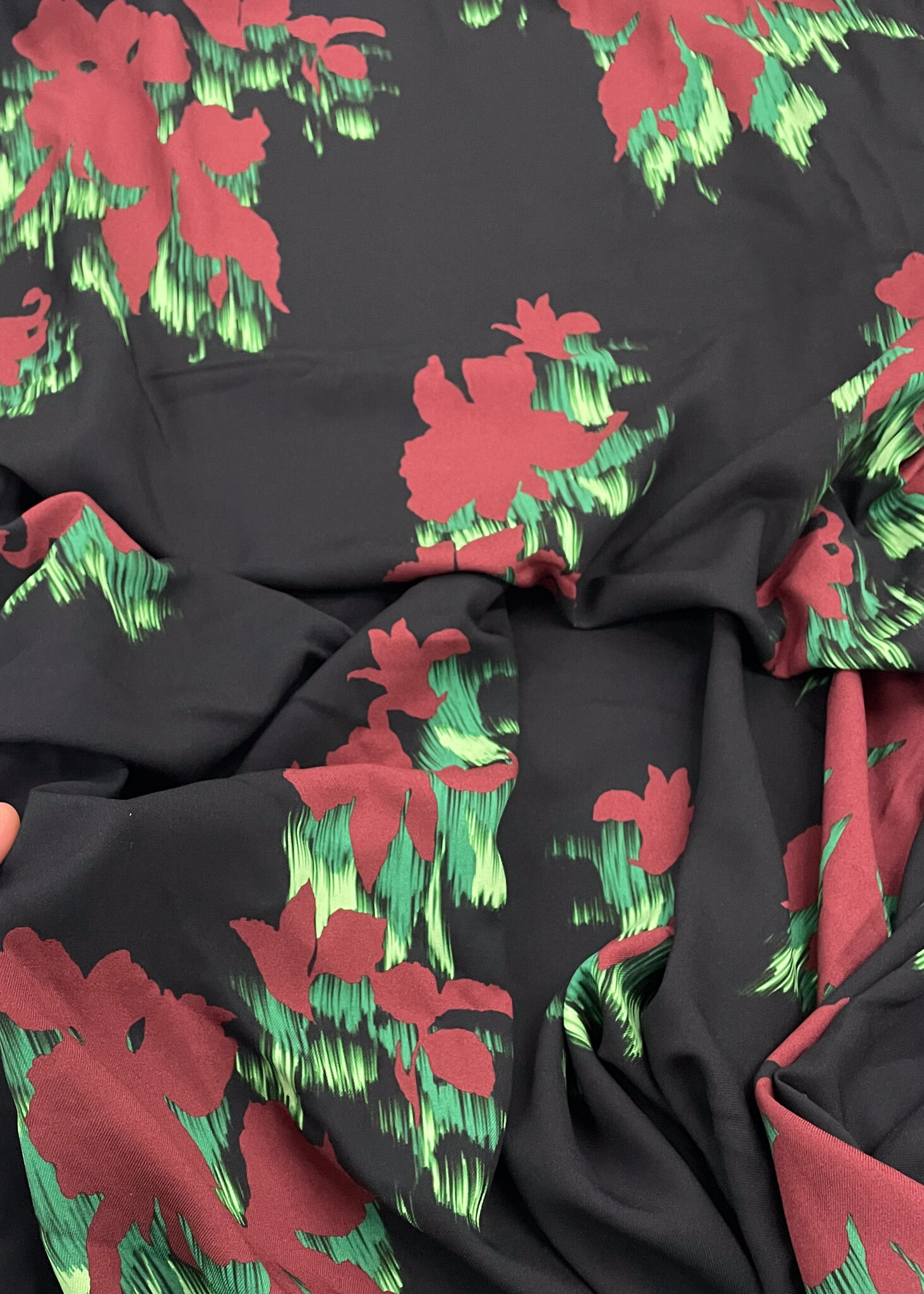Een soepelvallende viscose met kleurrijke print. Leuk voor bloezen en kleedjes. Deze stof behoort tot onze deadstock collectie.