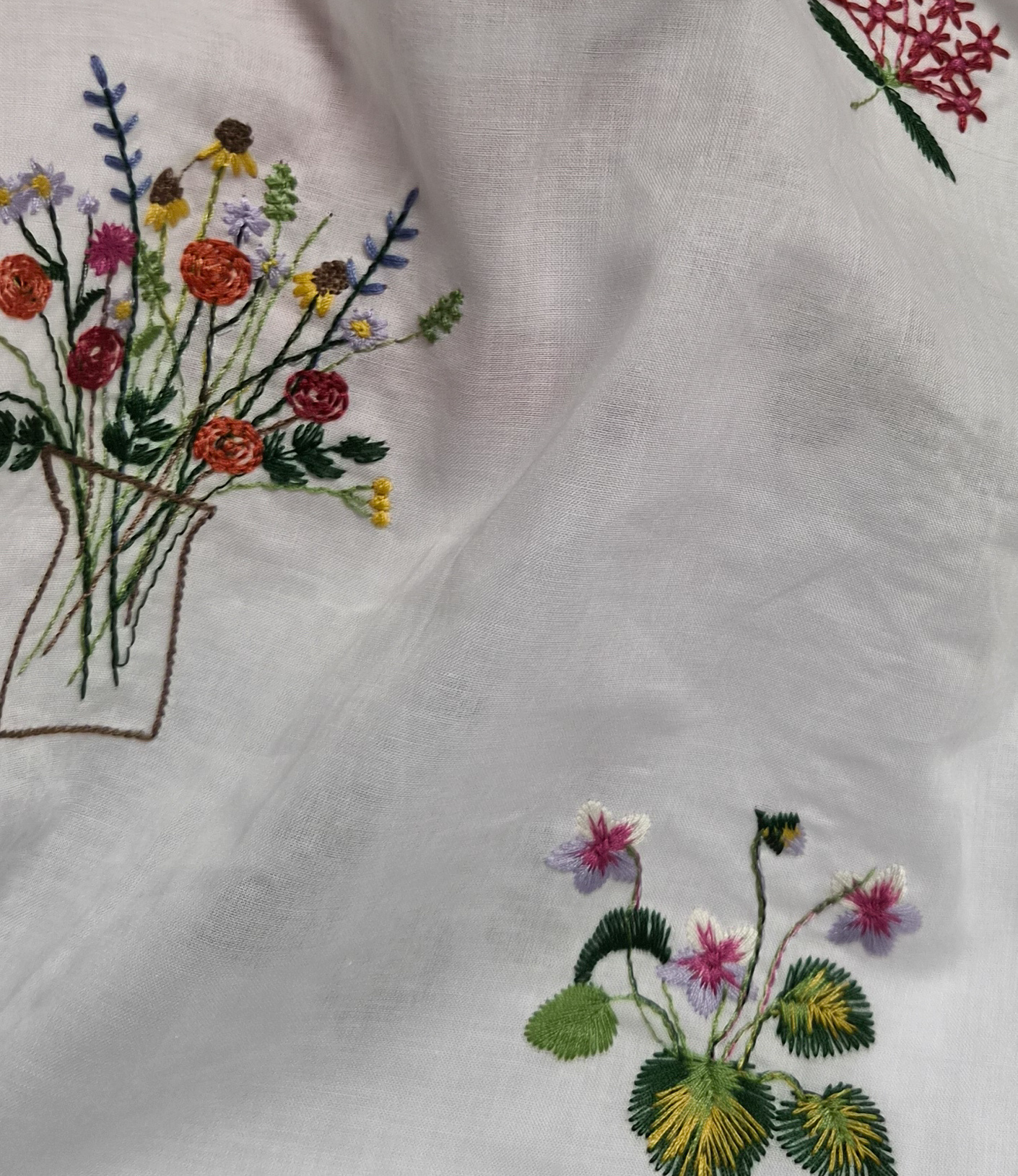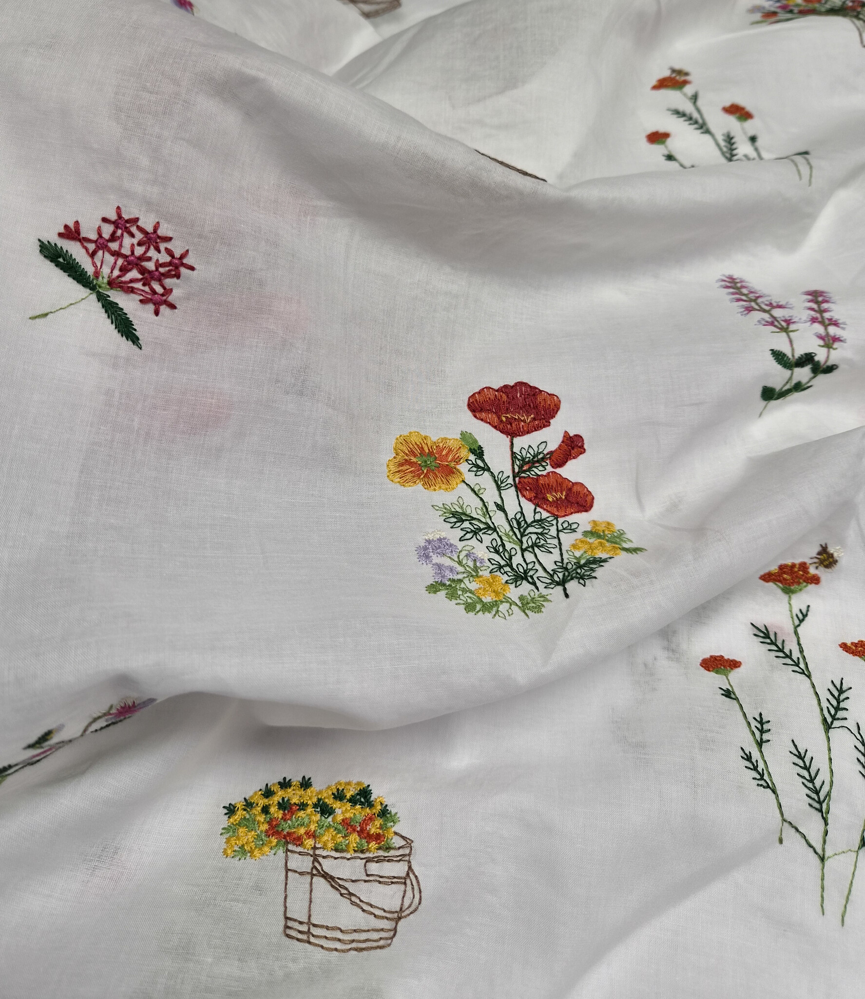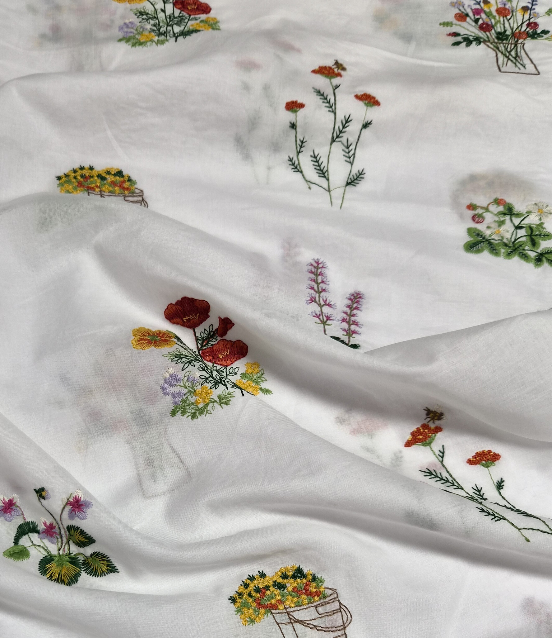 Een katoen voile met de allermooiste borduurwerkjes. Prachtige bloemen, echte schilderijtjes. Tot in detail geborduurd. Dit is echt een unieke stof.