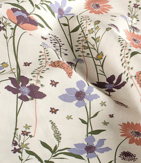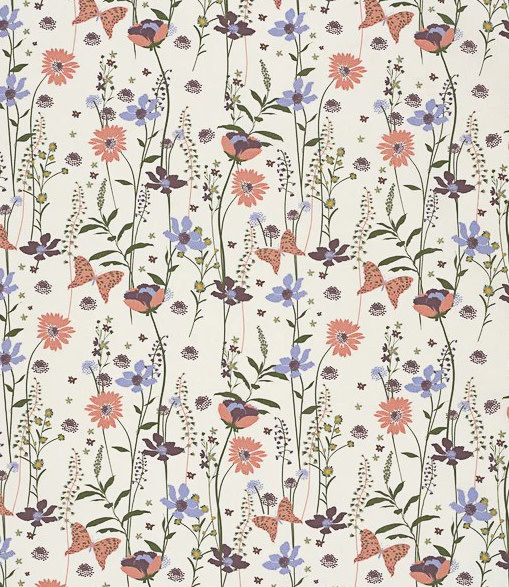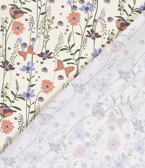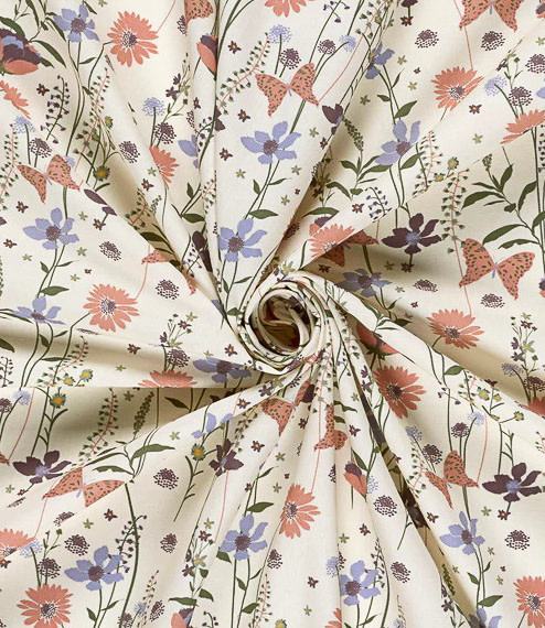 Een prachtige popeline katoen met bloemen en vlinders. OEKO-tex. Heel mooi voor luchtige kledij.