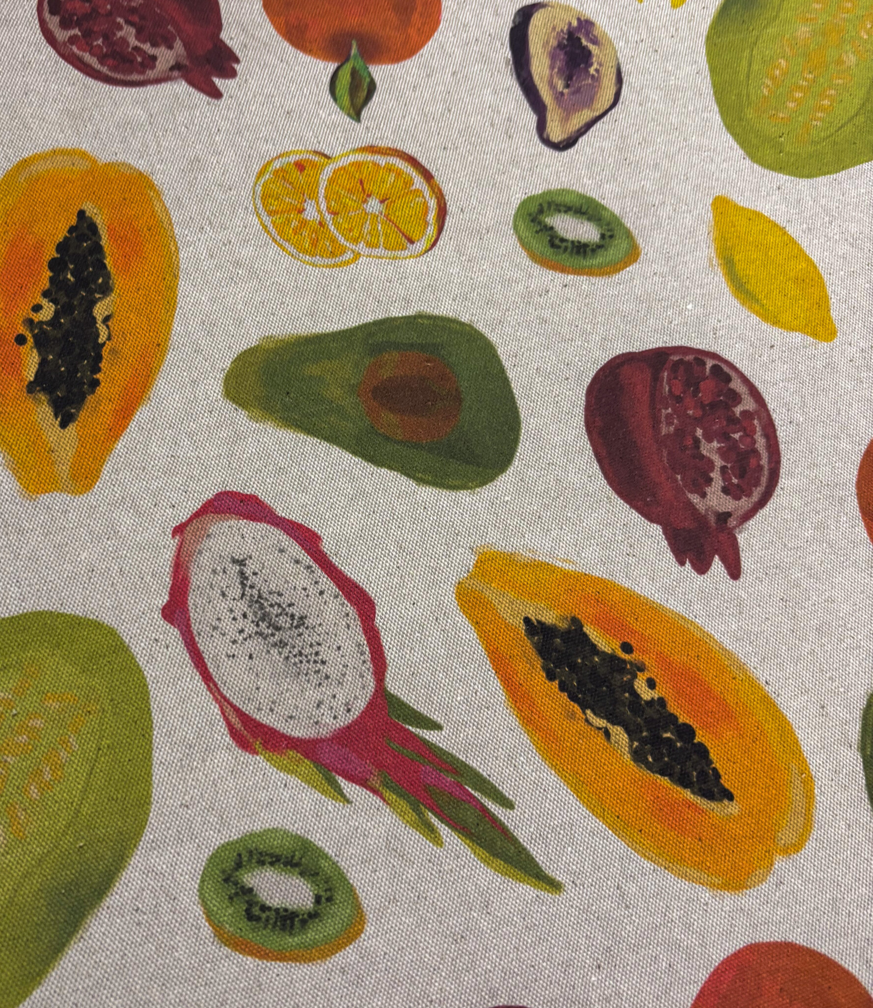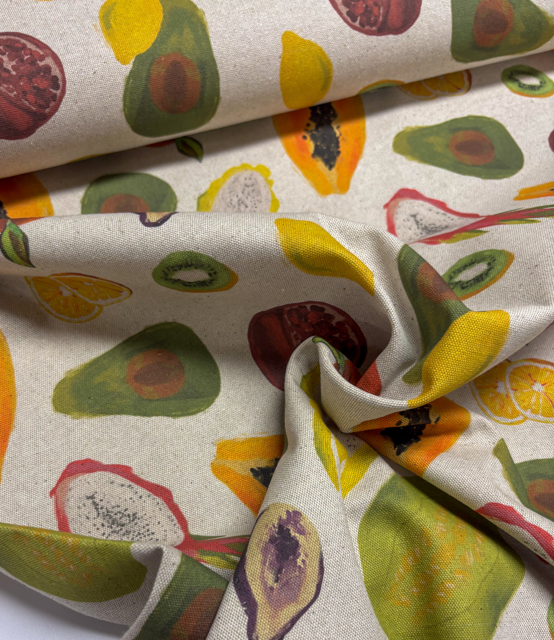 Een toffe en soepele canvas met allerlei vruchten. Perfect voor een tafelkleedje, servetten, kussenovertrekken, maar ook voor een keukenschort, ...