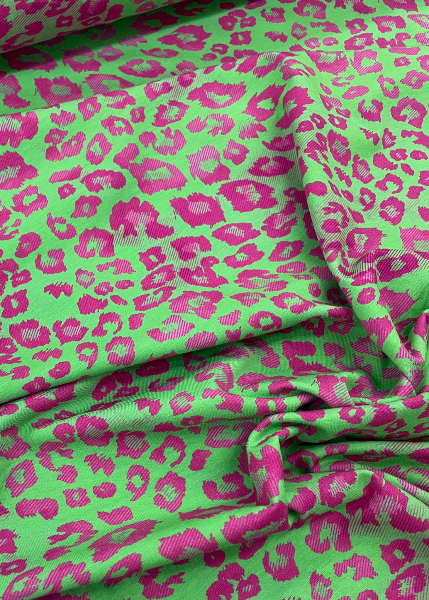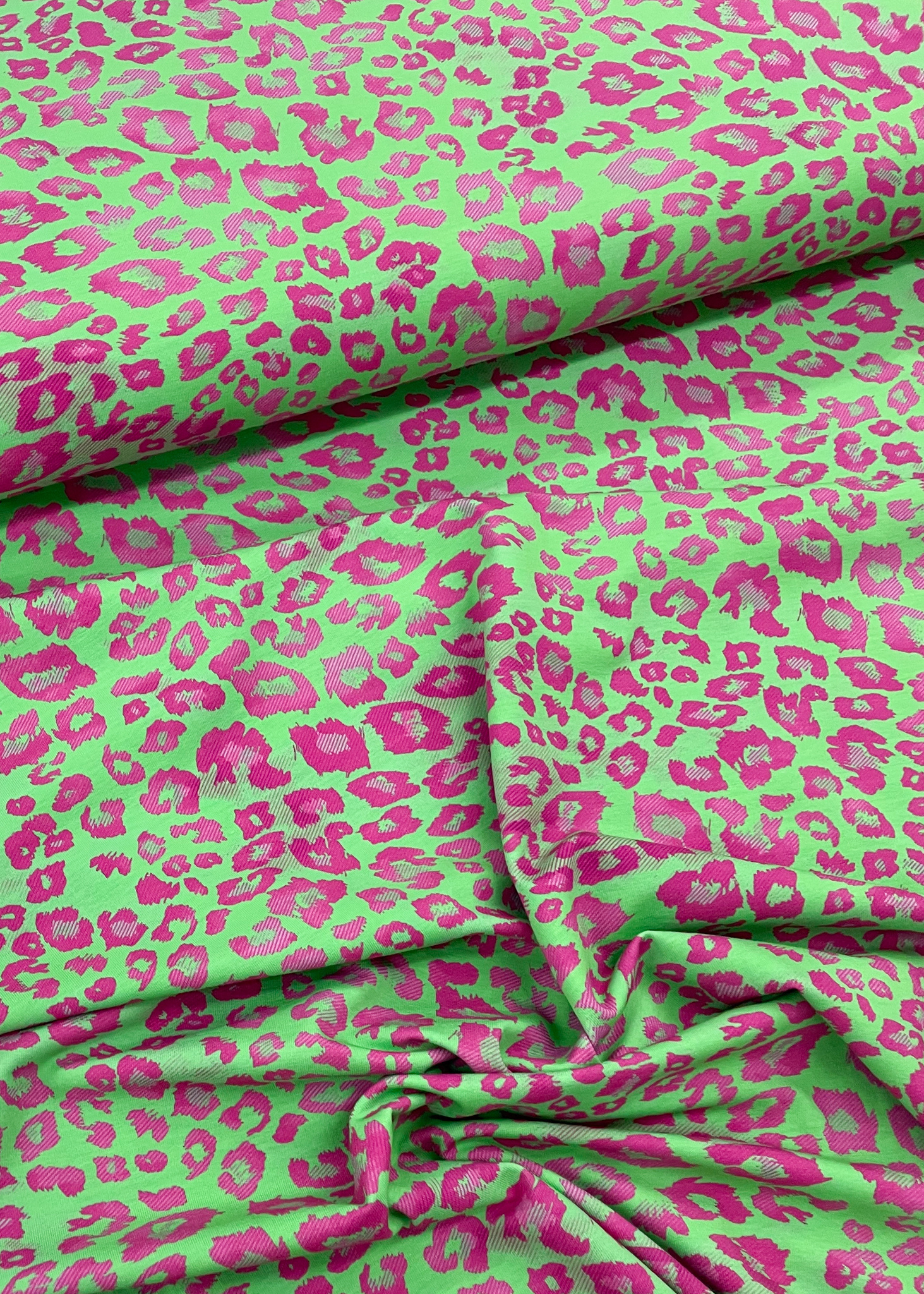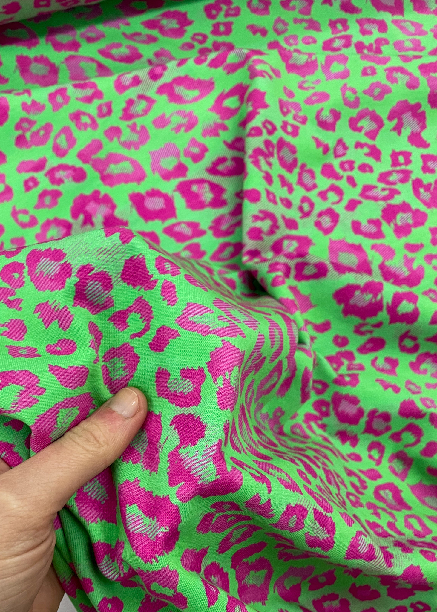 Een zachte tricot met fuchsia vlekjes. Perfect voor T-shirts. Oeko-tex van Swafing Stoffe.
