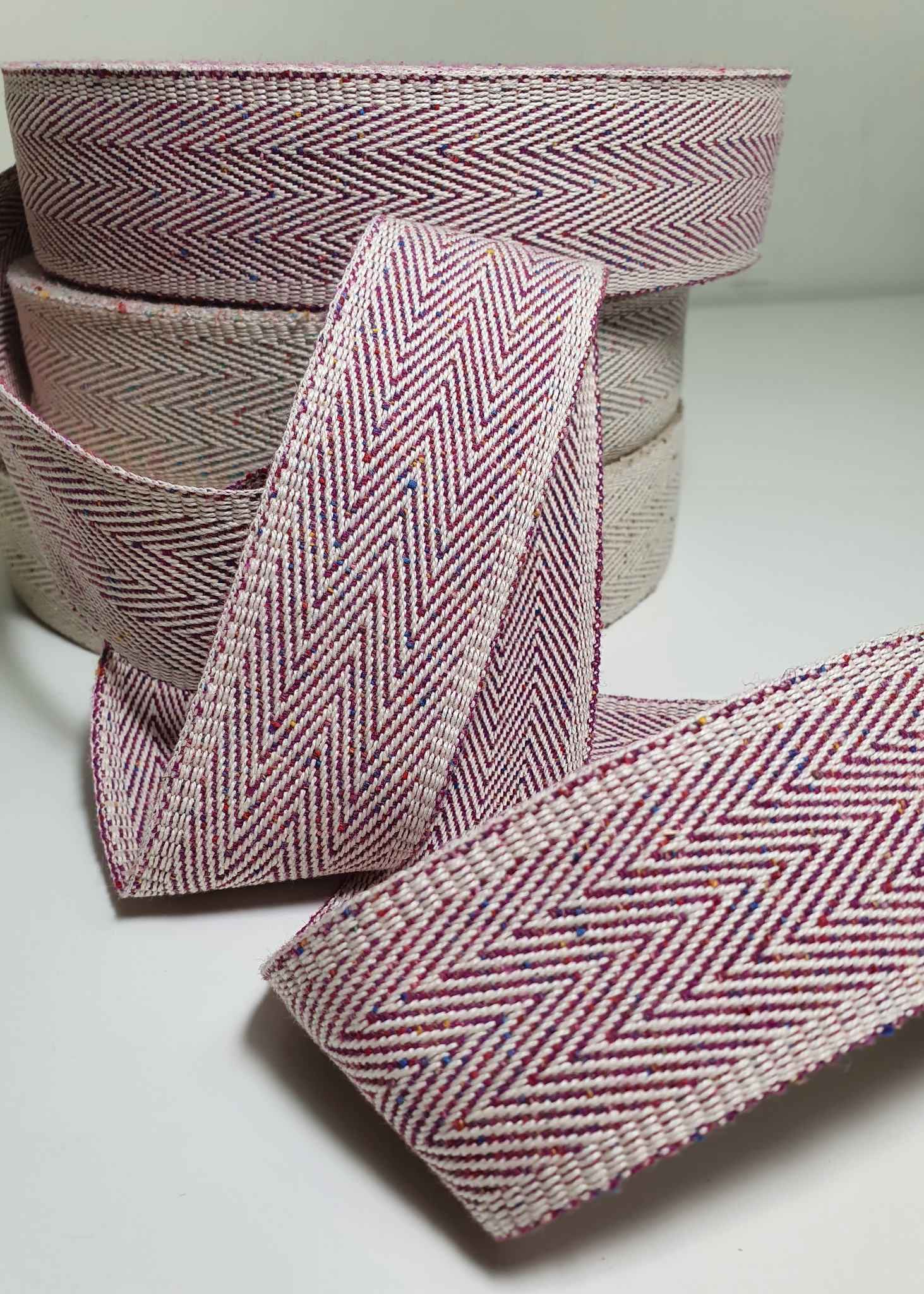 Supermooie hele zachte geweven tassenband met visgraatmotief met lichte spikkeltjes, 40 mm breed.