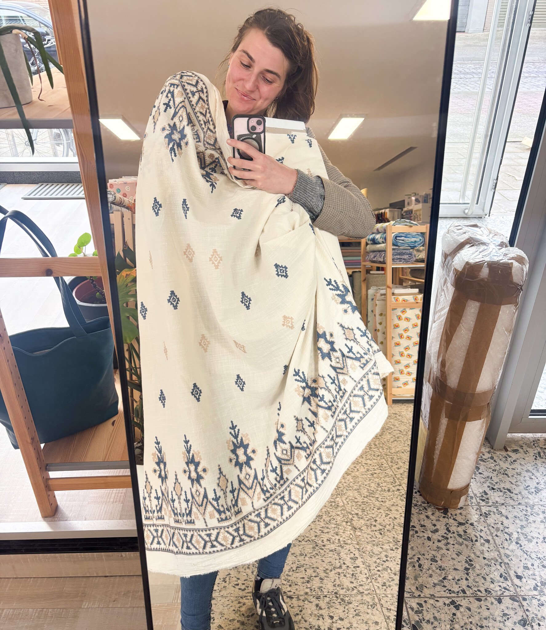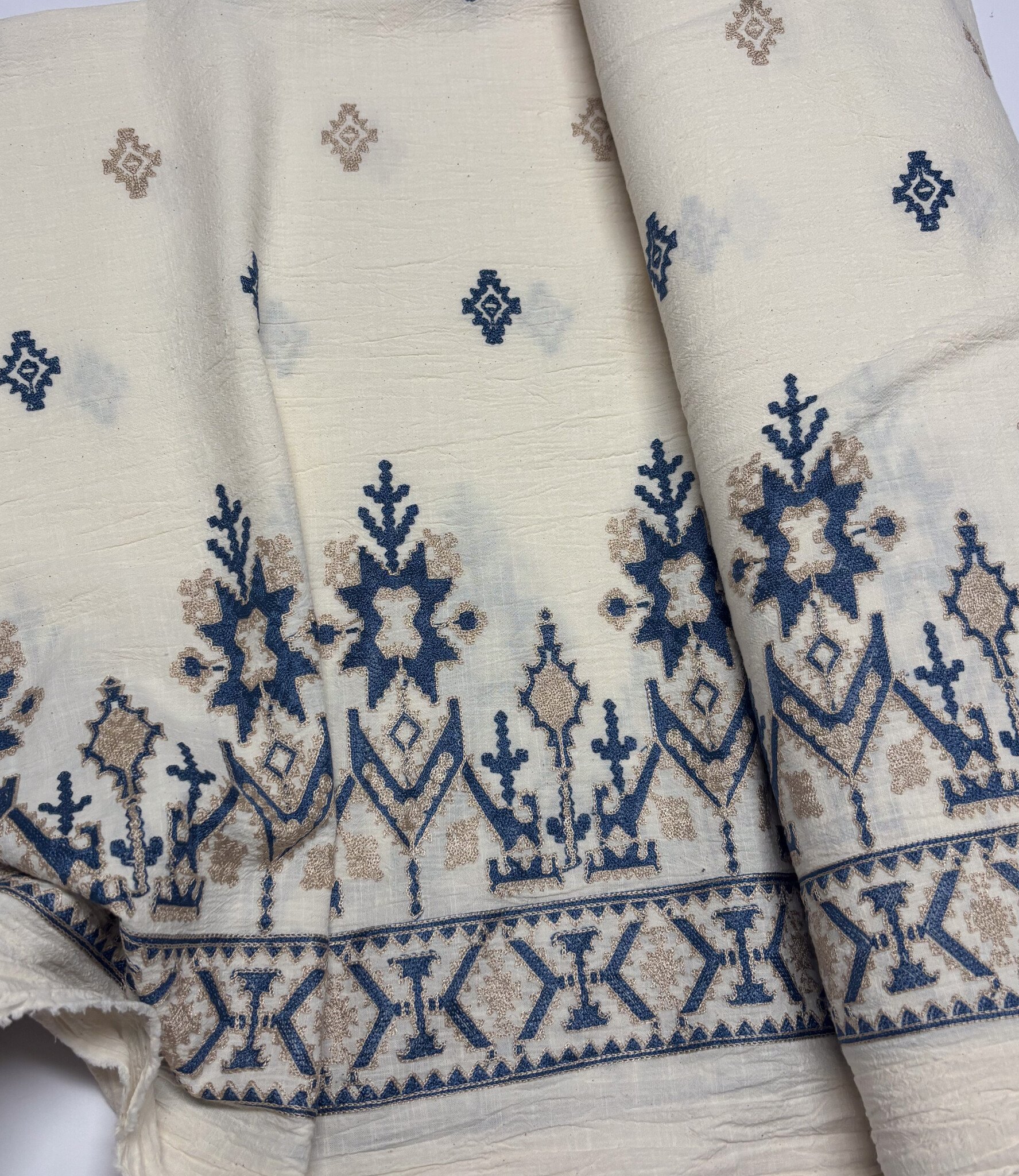 Een prachtige soepele katoen met geborduurde bloemen.