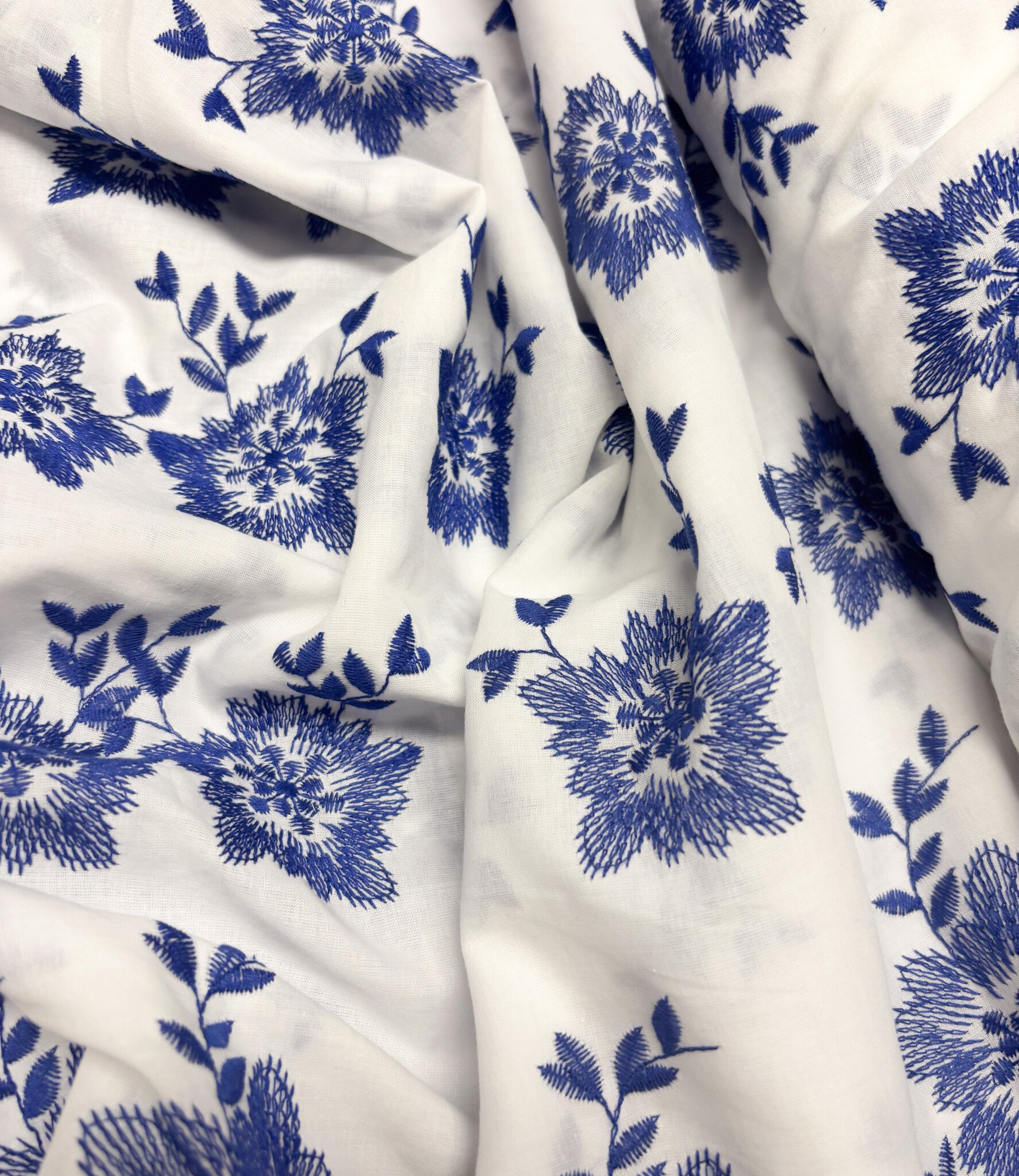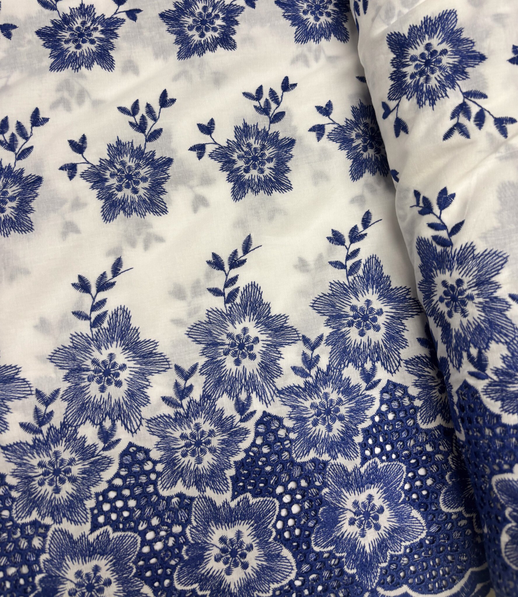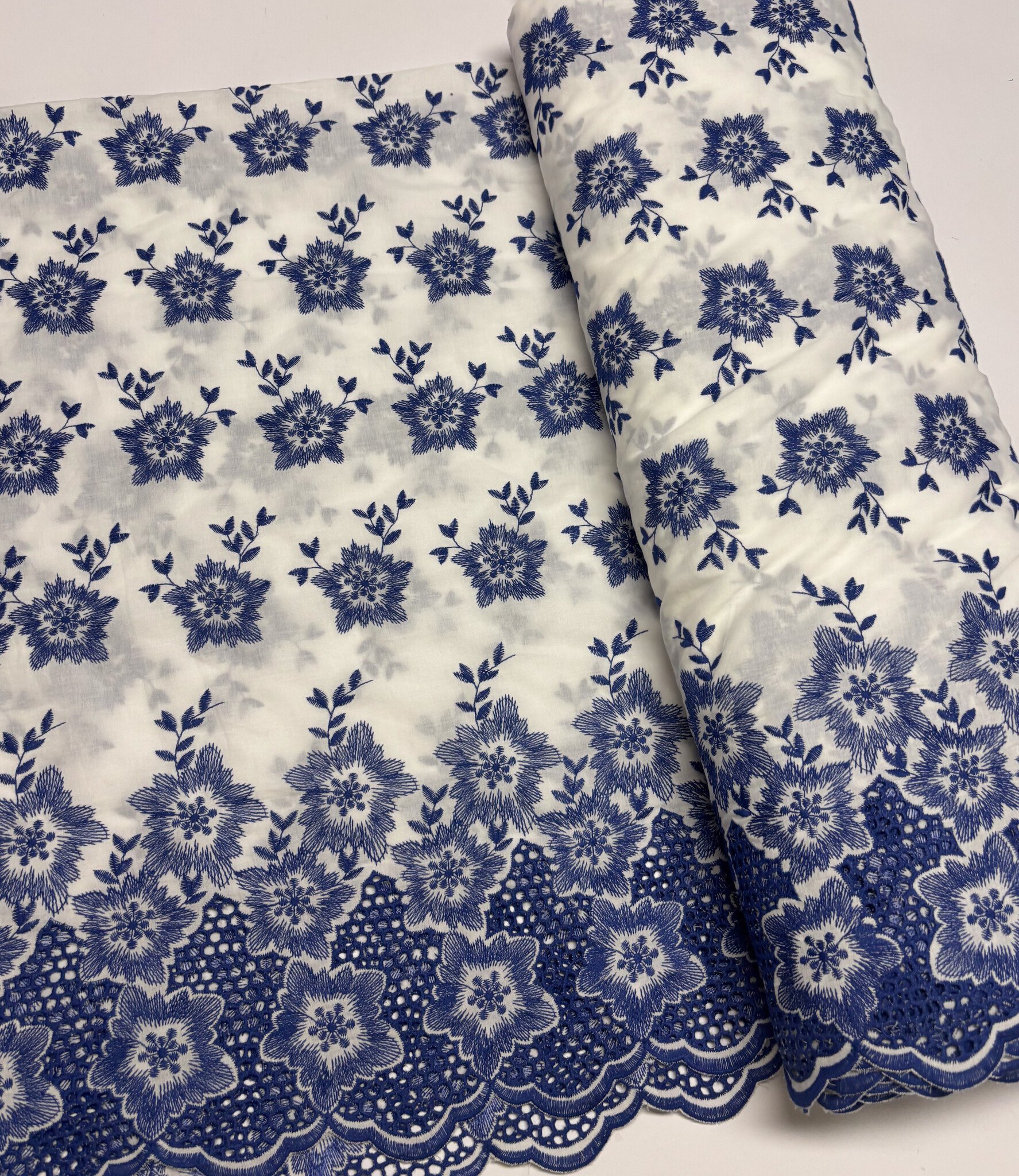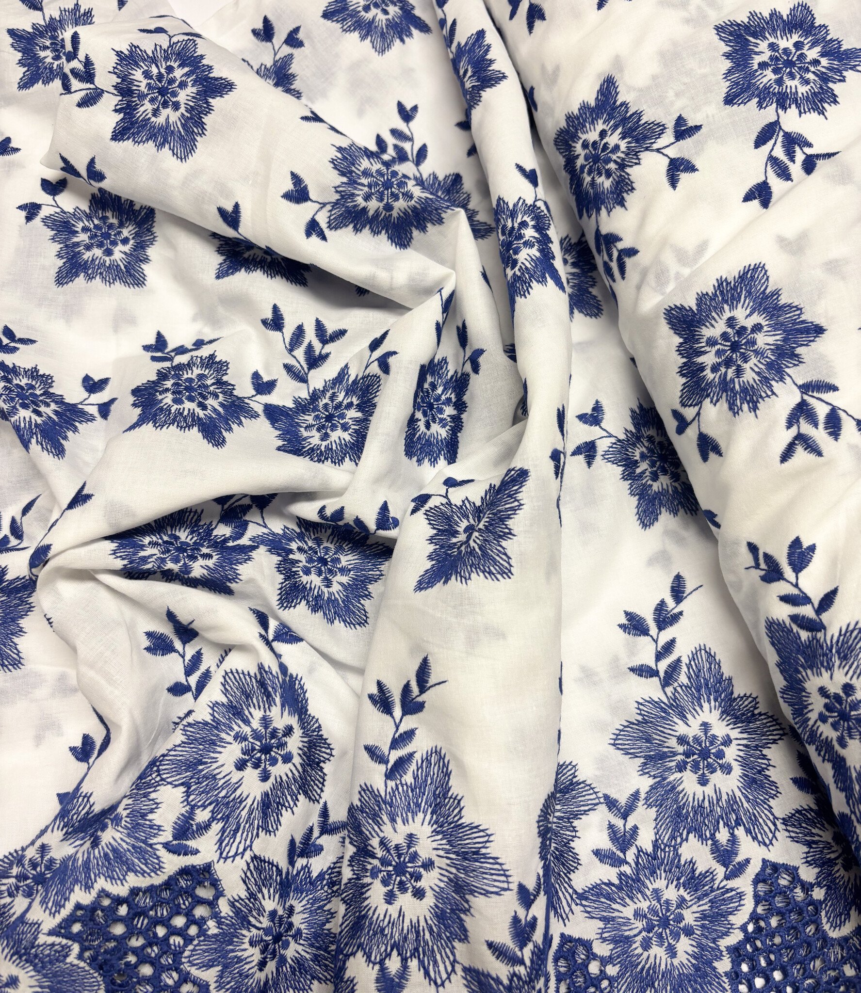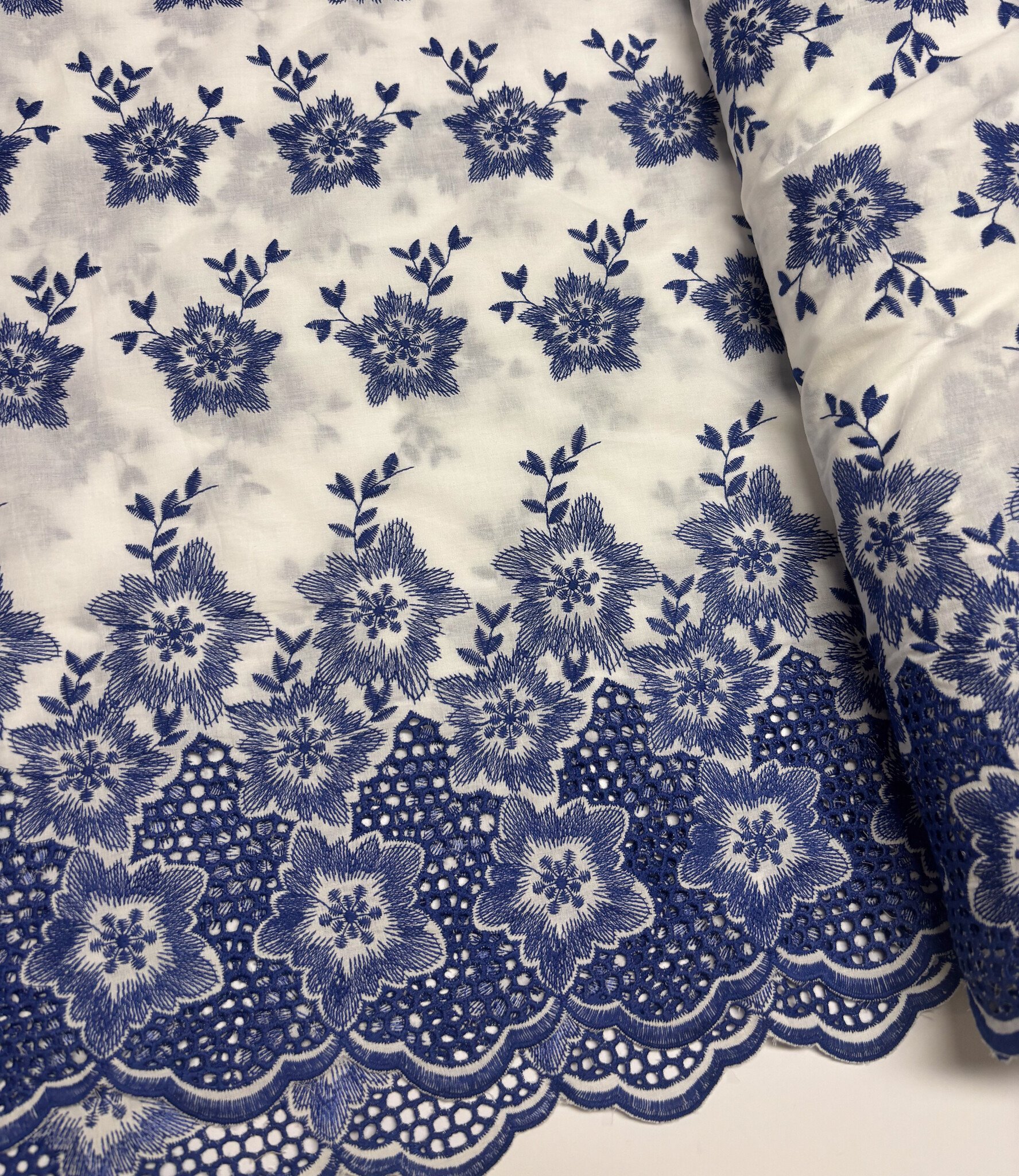 Een prachtige katoen met geborduurde border en geschulpte rand.