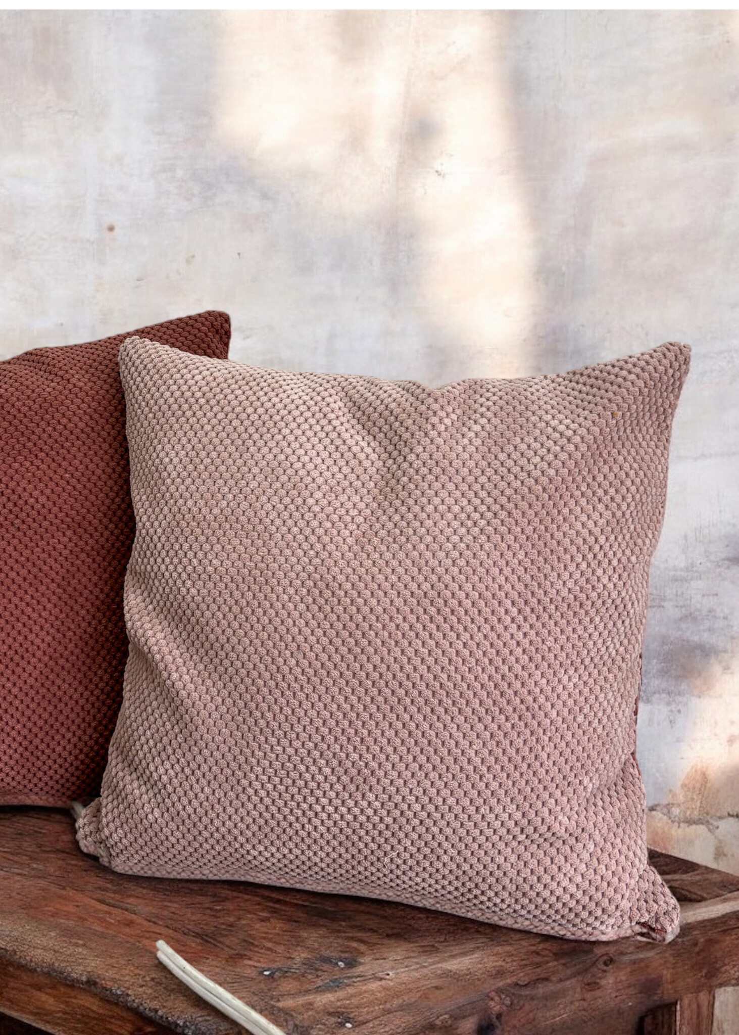 De prachtige structuur velvet van maar liefst 300 gram/qm3 en een Martindale score van 100,000 zorgt dat jouw sierkussen er jarenlang als nieuw blijft uitzien. Het is een heel slijtvaste stof, makkelijk te verwerken en een streling voor het oog, en voor uw velleke.