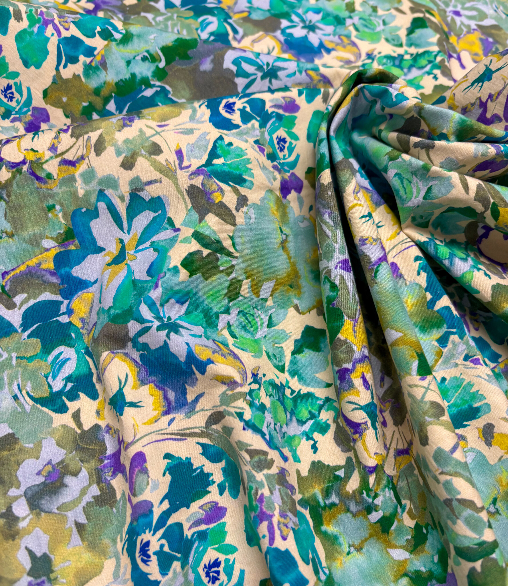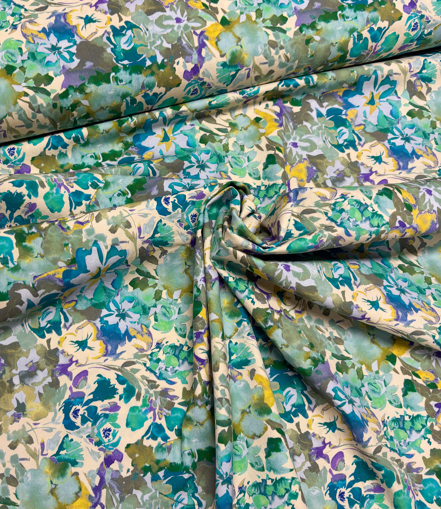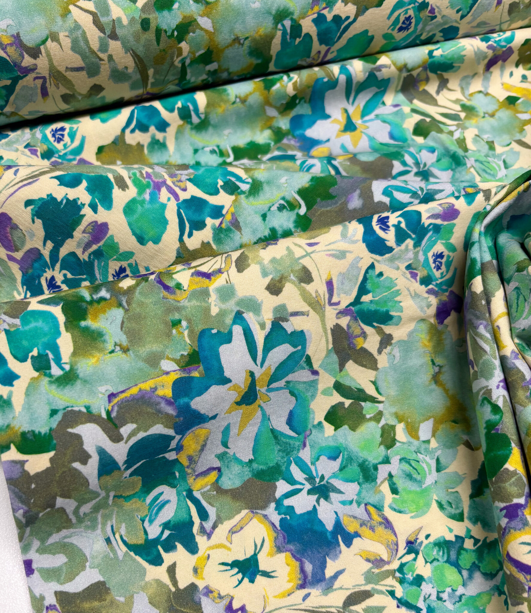 Een stretchkatoen met groene bloemen.