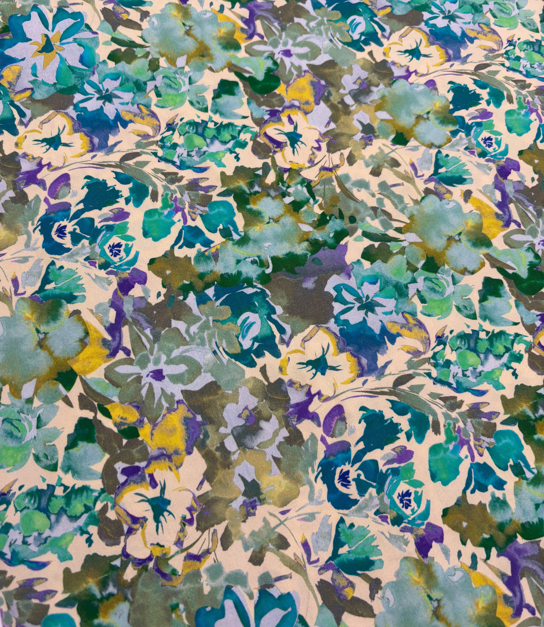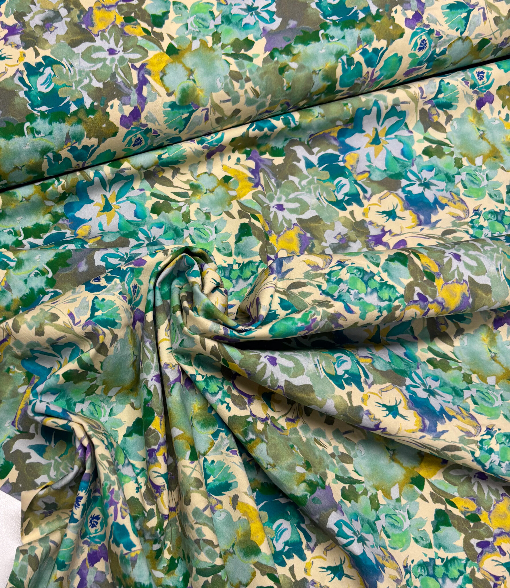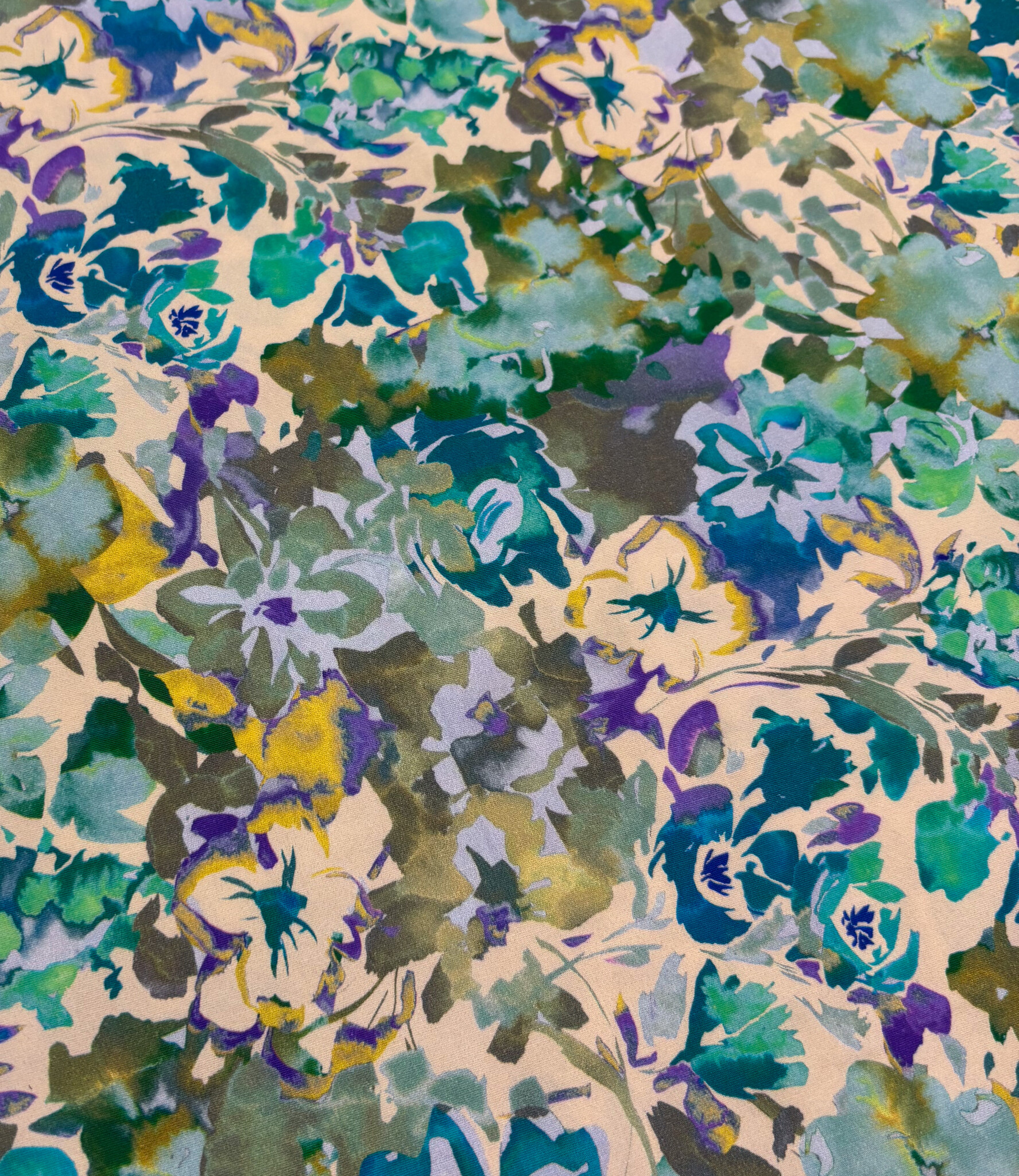 Een stretchkatoen met groene bloemen.