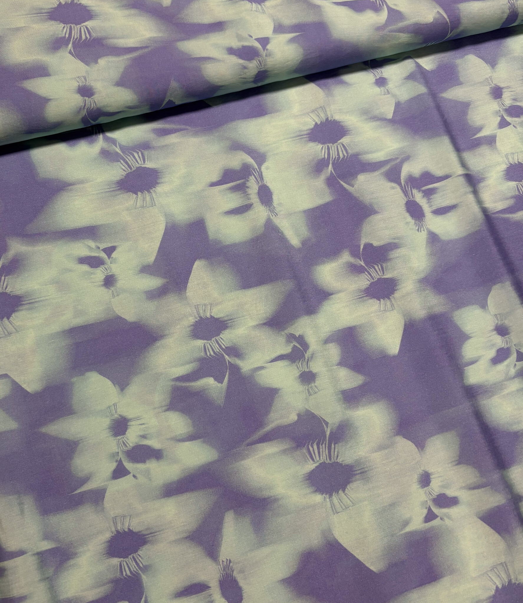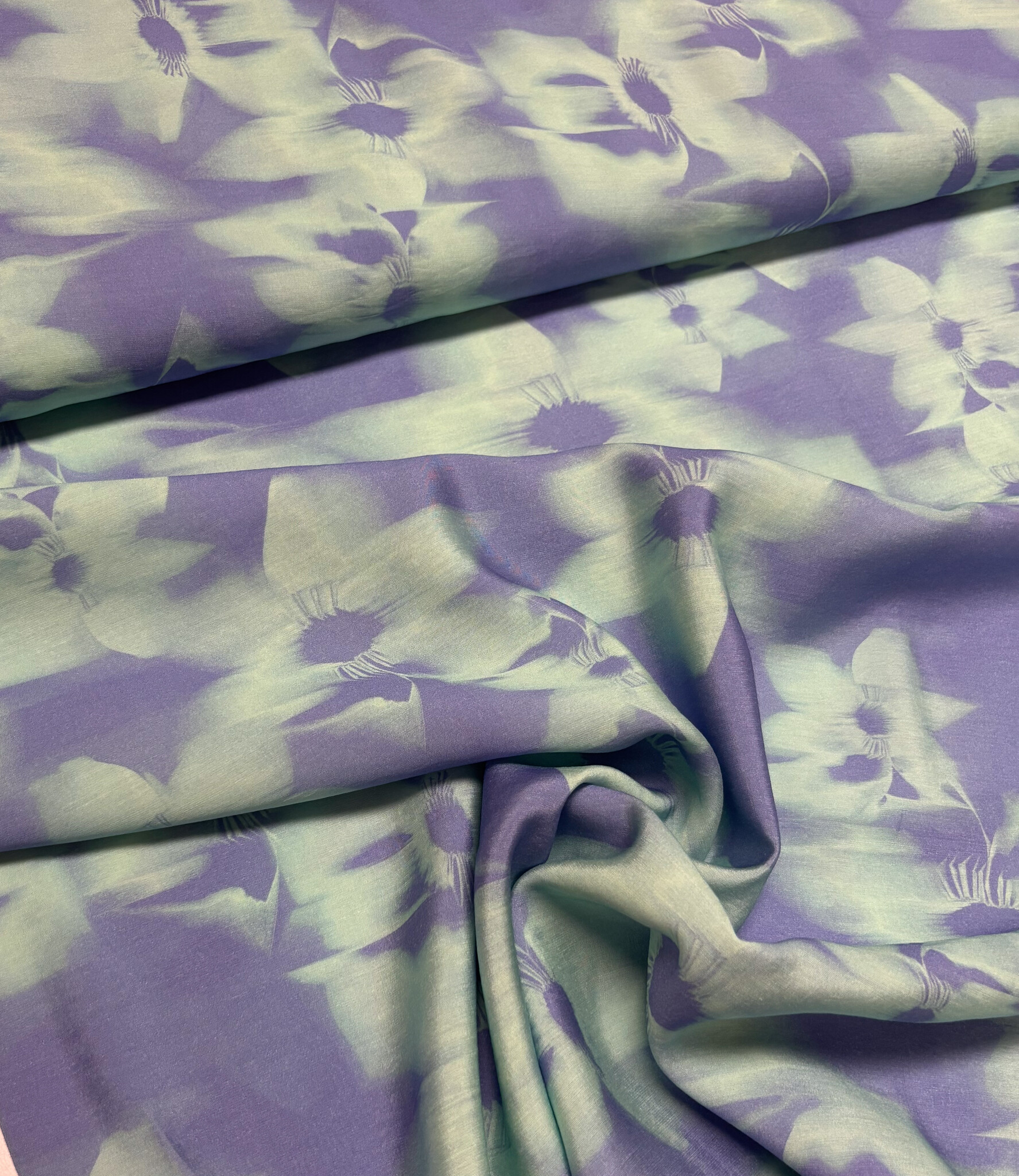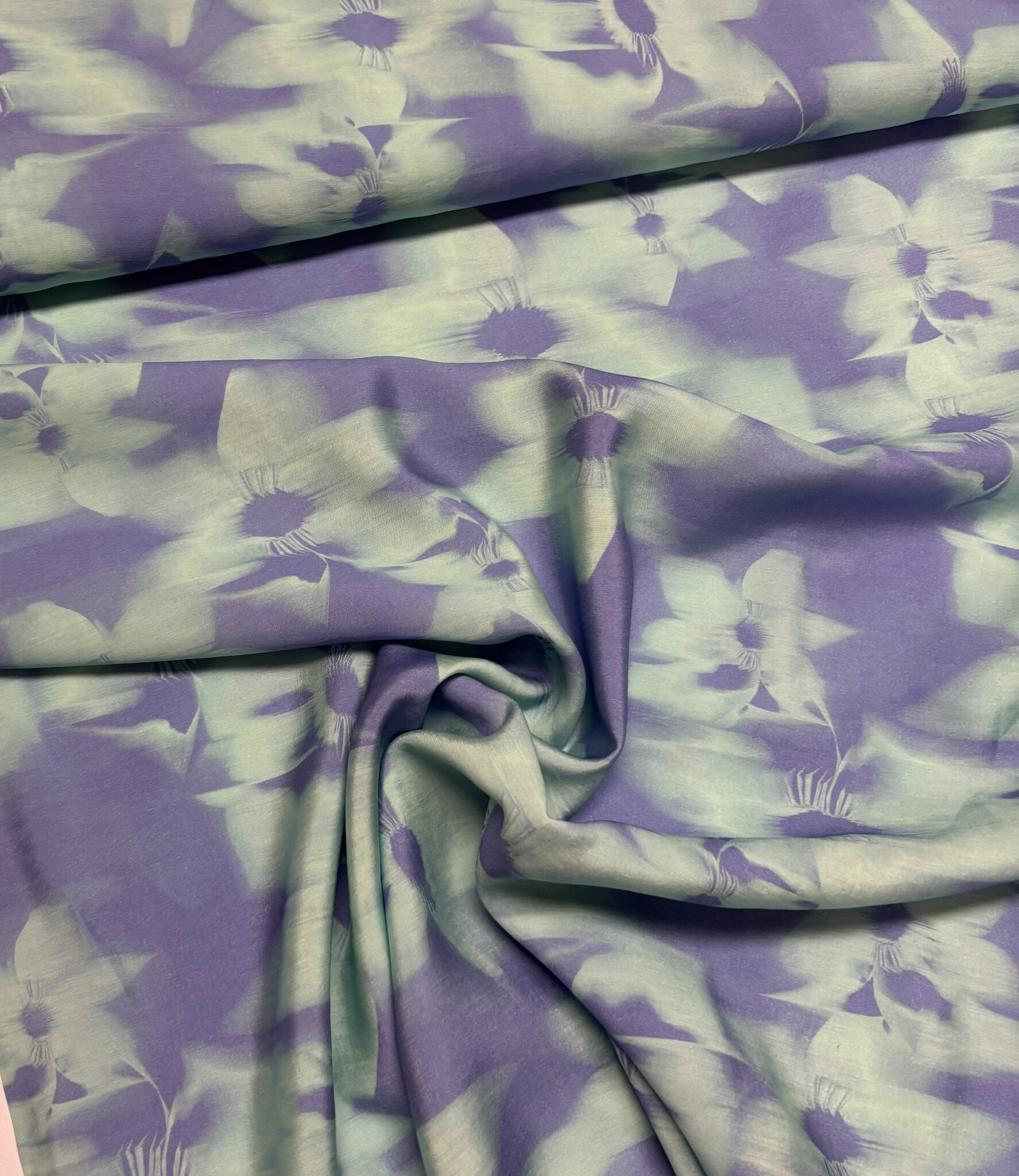 Een zijdezachte satijn viscose met subtiele bloemenprint. Heel mooi voor soepelvallende blouse, jurk, rok, wijde zomerbroek,...