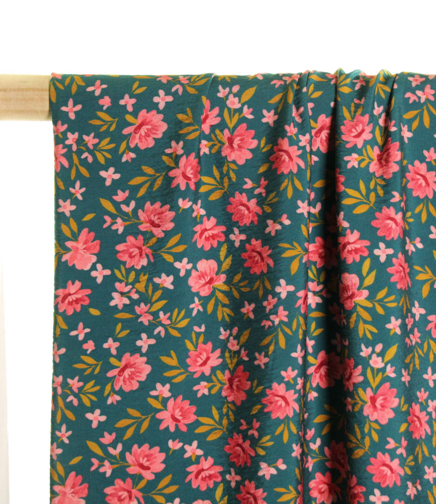 Een viscose/polyamide mix met lichte textuur, die wat 'gebobbeld' lijkt en een subtiele satijnglans. De stof heeft kleine kleurrijke bloemetjes op een donkergroene basis. Deze stof is geschikt voor blouses, jurken, rokken,... en is ook beschikbaar in oker.