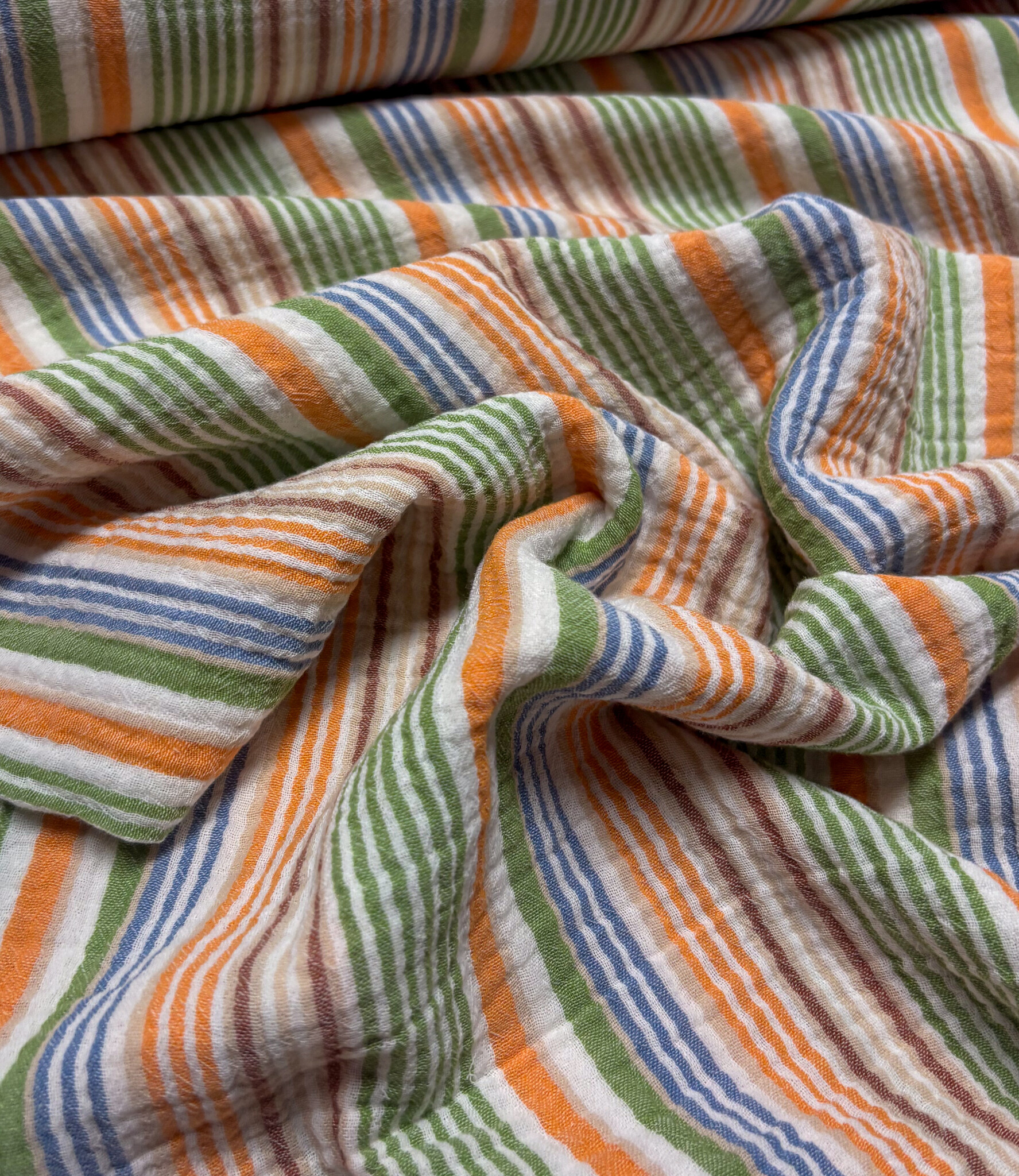 Mooie kwaliteit double gauze met streepjes. Perfect voor kleedjes, tops, T-shirts en voor baby- en kinderspulletjes (babynestje, dekentje, ...). Heerlijk zacht. OEKO-tex.