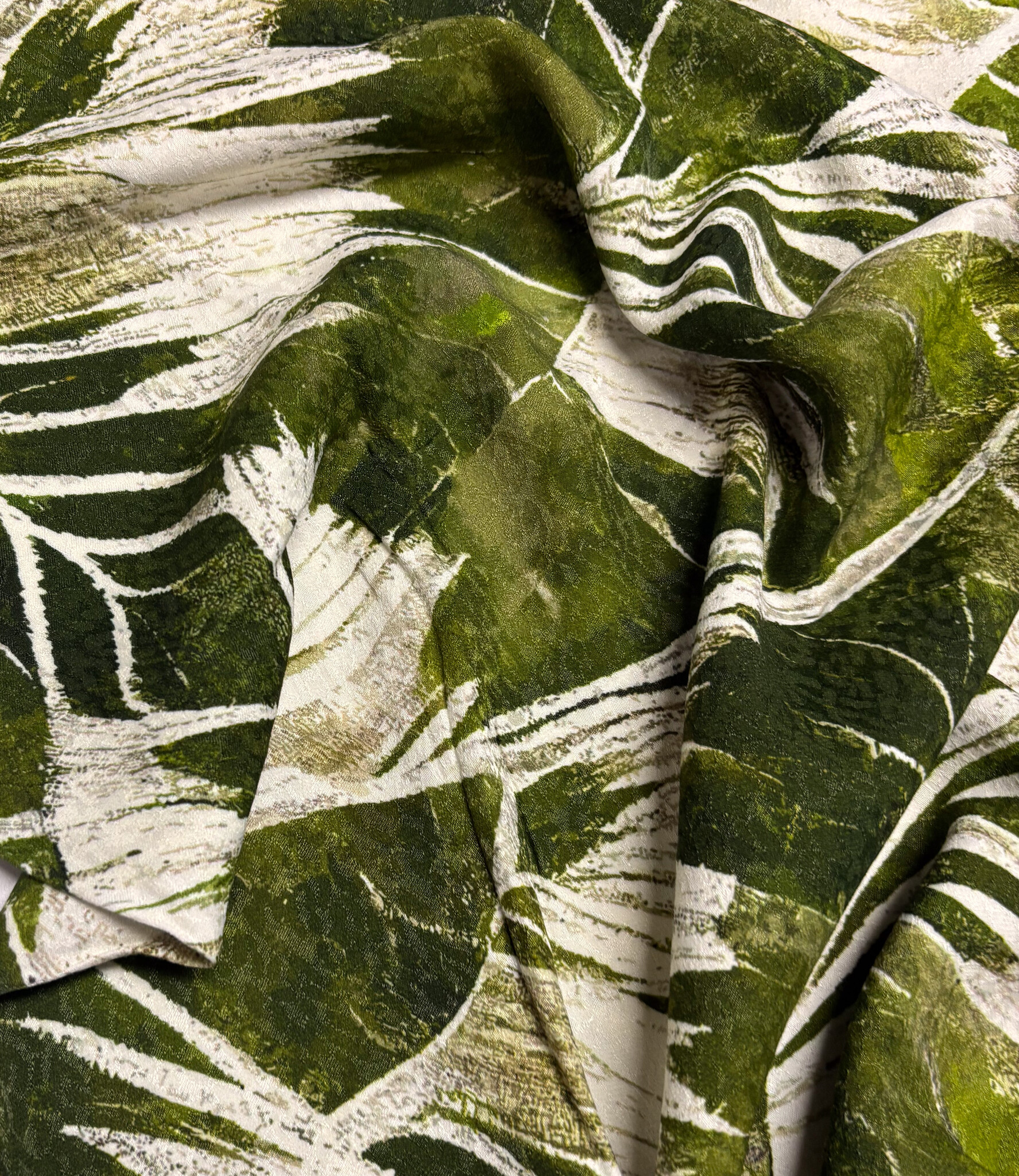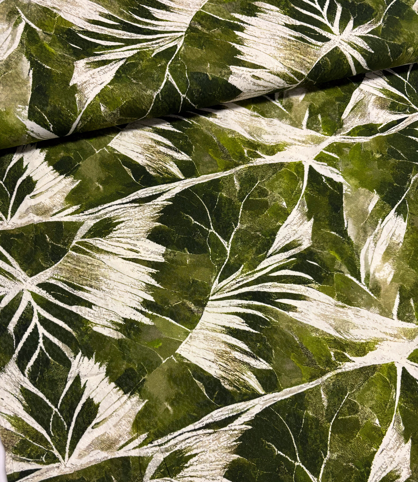 Een prachtige groene viscose met bladeren en subtiele glitter uit de collectie van Swafing. OEKO-tex. Perfect voor een blouse, jurk of losse broek.