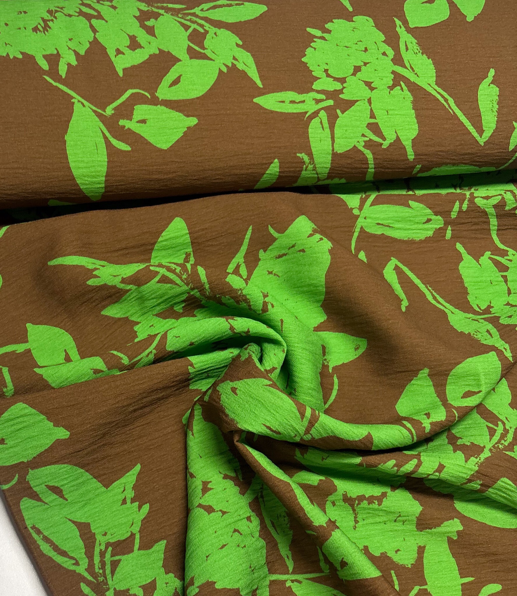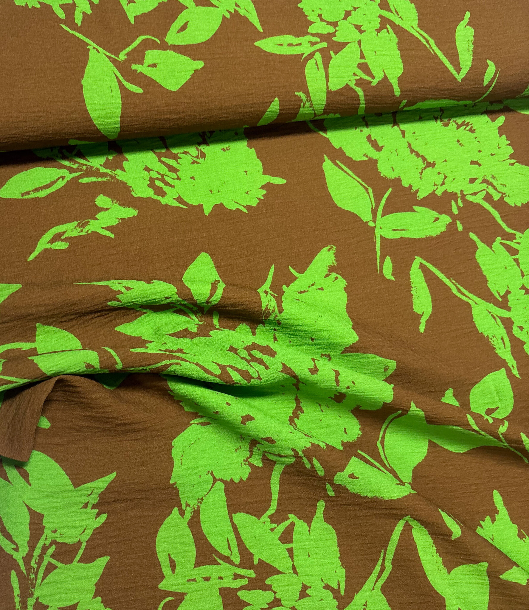 Een prachtige viscose slub (mooie textuur) met groene silhouetten bloemen. A la Ville stoffen.