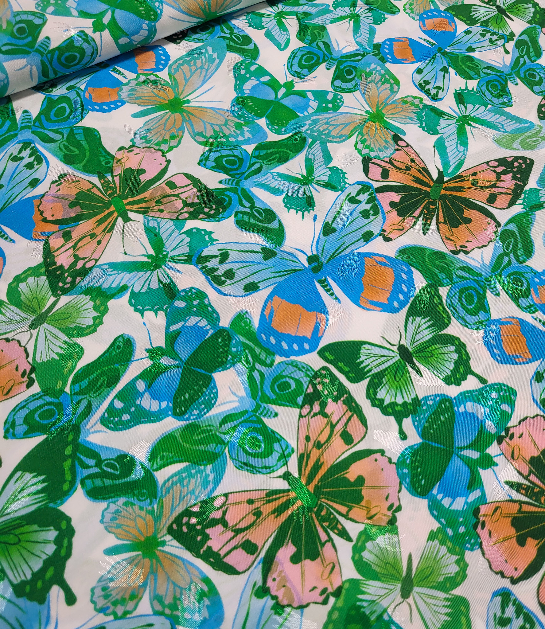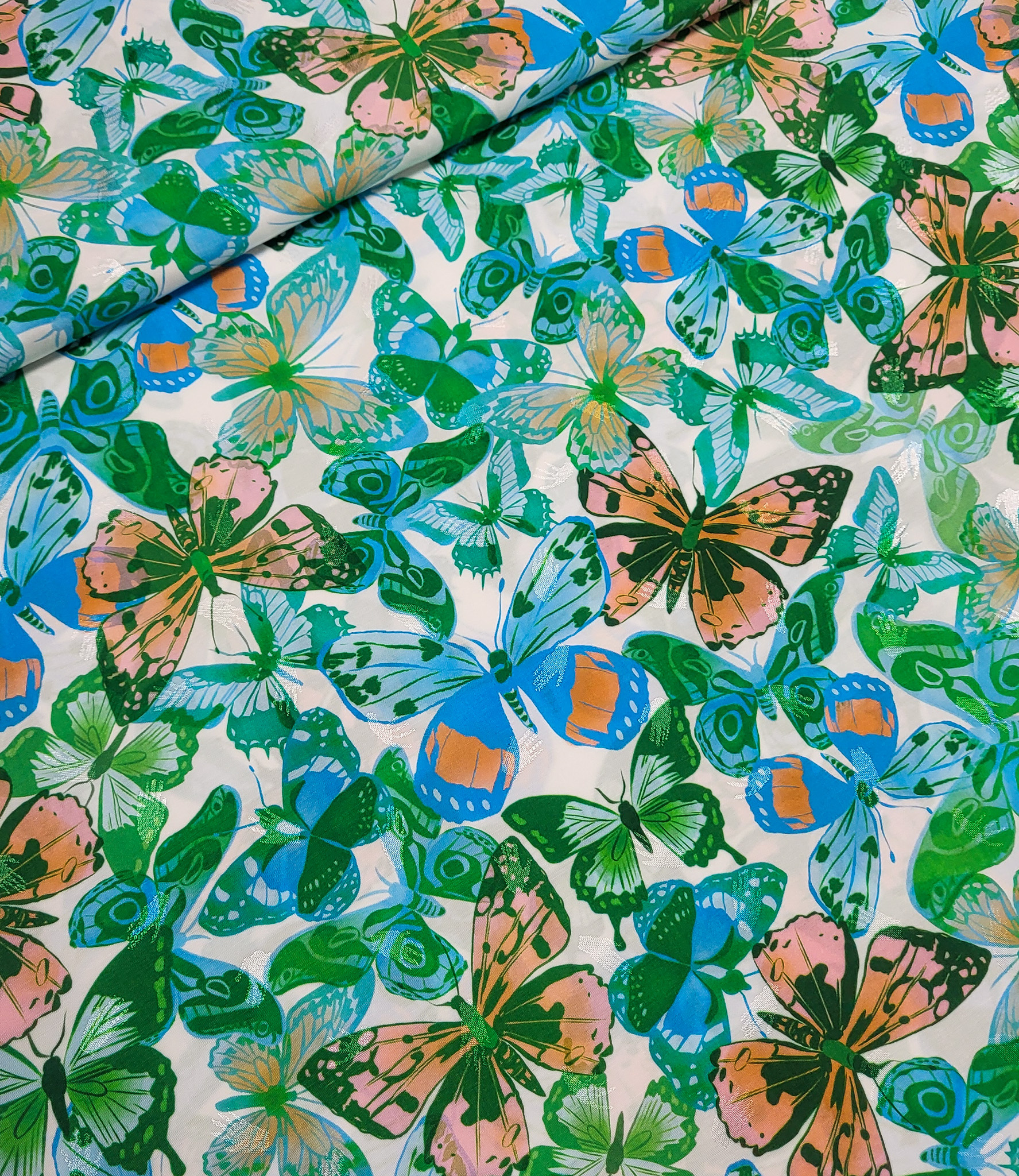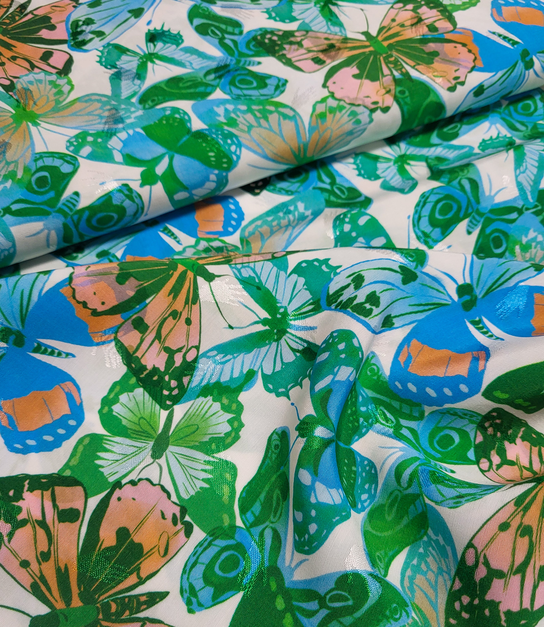 Een prachtige viscose jacquard. De stof heeft heerlijke kleuren en ingeweven licht glanzend detail. Dit is een iets zwaardere viscose. Ideaal voor blouses, jurken en rokken. Maar zeker ook geschikt voor een losse broek.