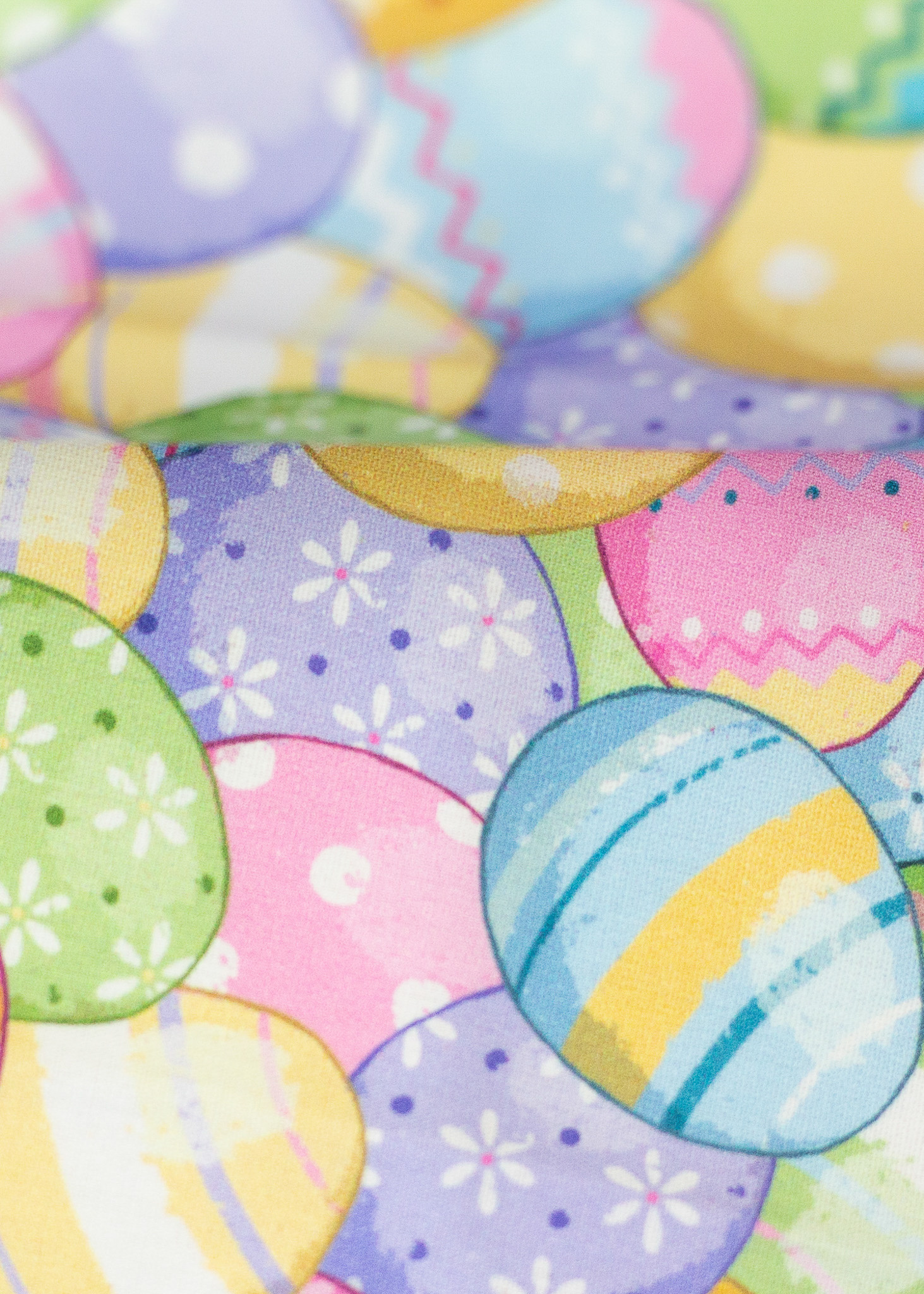 Een zachte katoenen stof met Print voor Pasen. OEKO-tex. Perfect voor servetten, tafelkleedjes, paasmandjes, paasdecoratie, ...