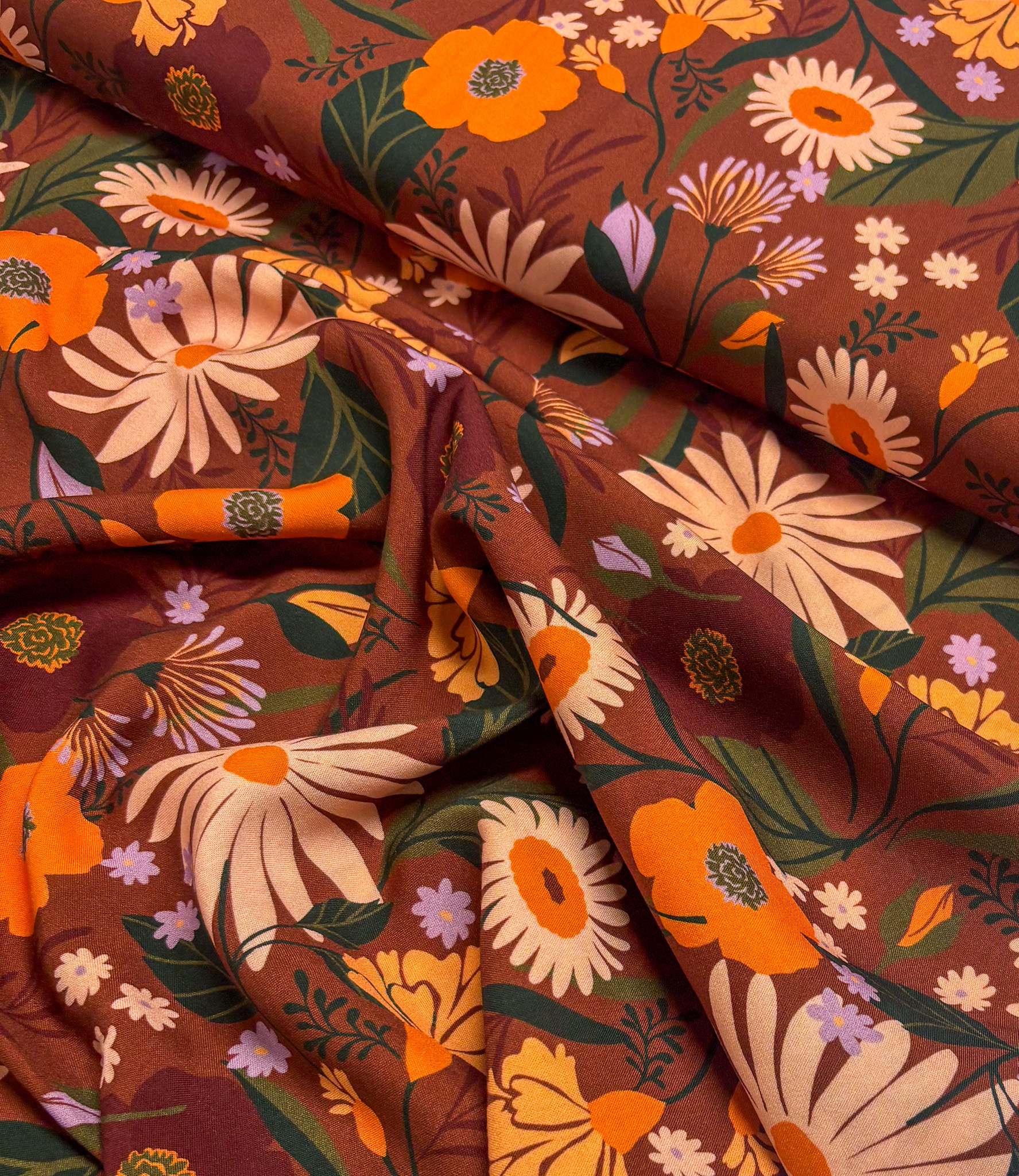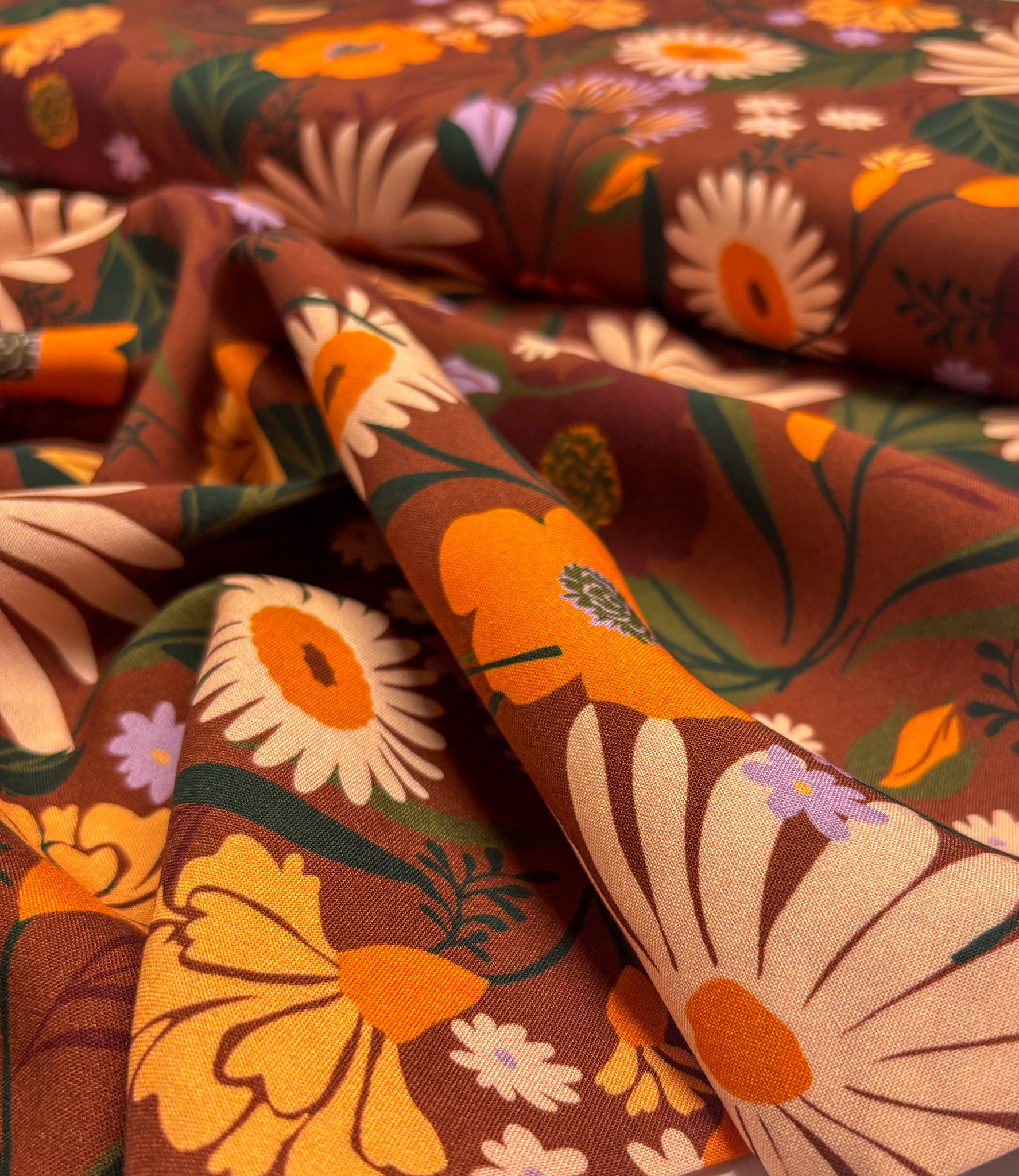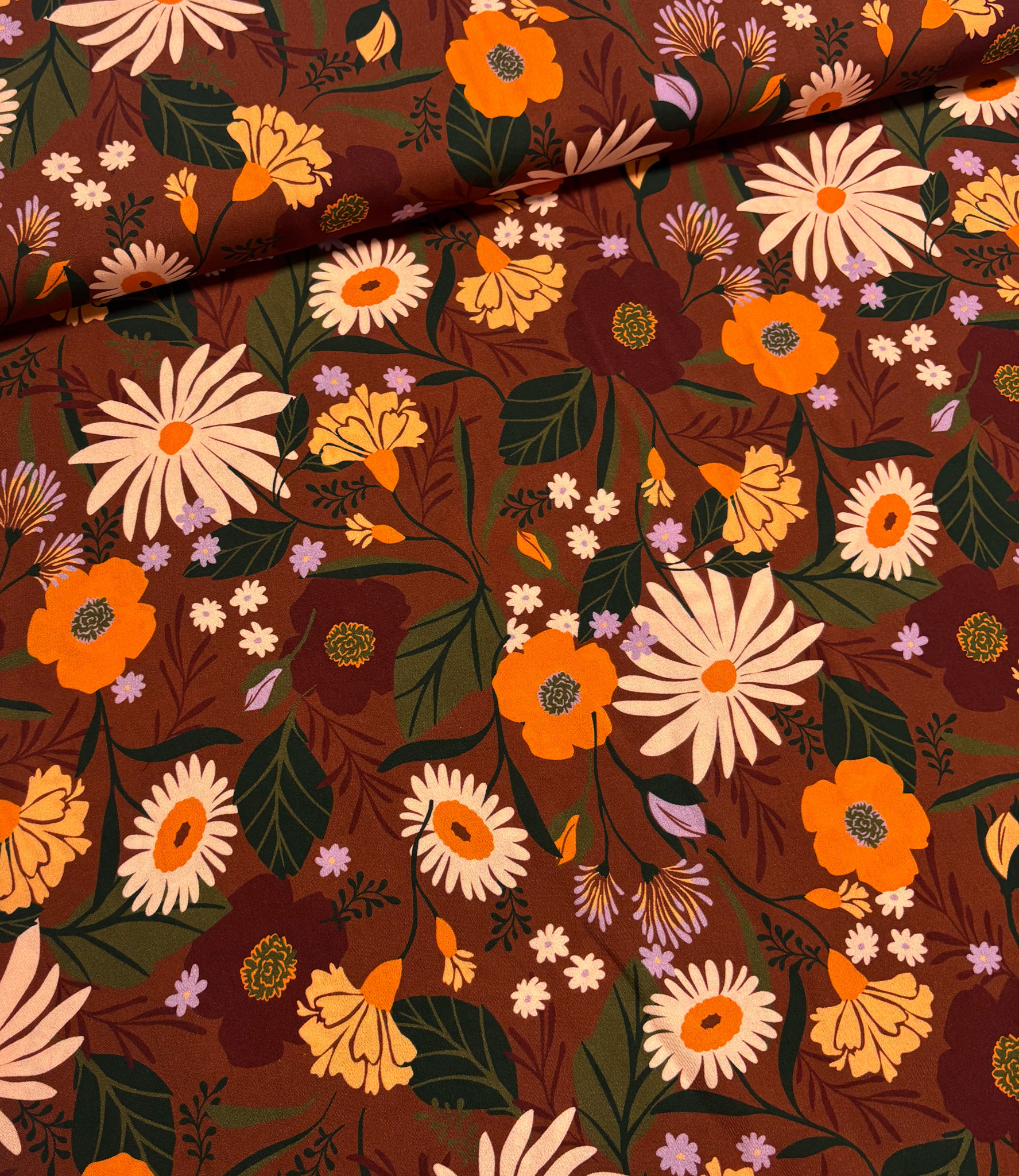 Een mooie luchtige viscose met herfstprint. Perfect voor een blouse, jurk of soepelvallende losse broek.