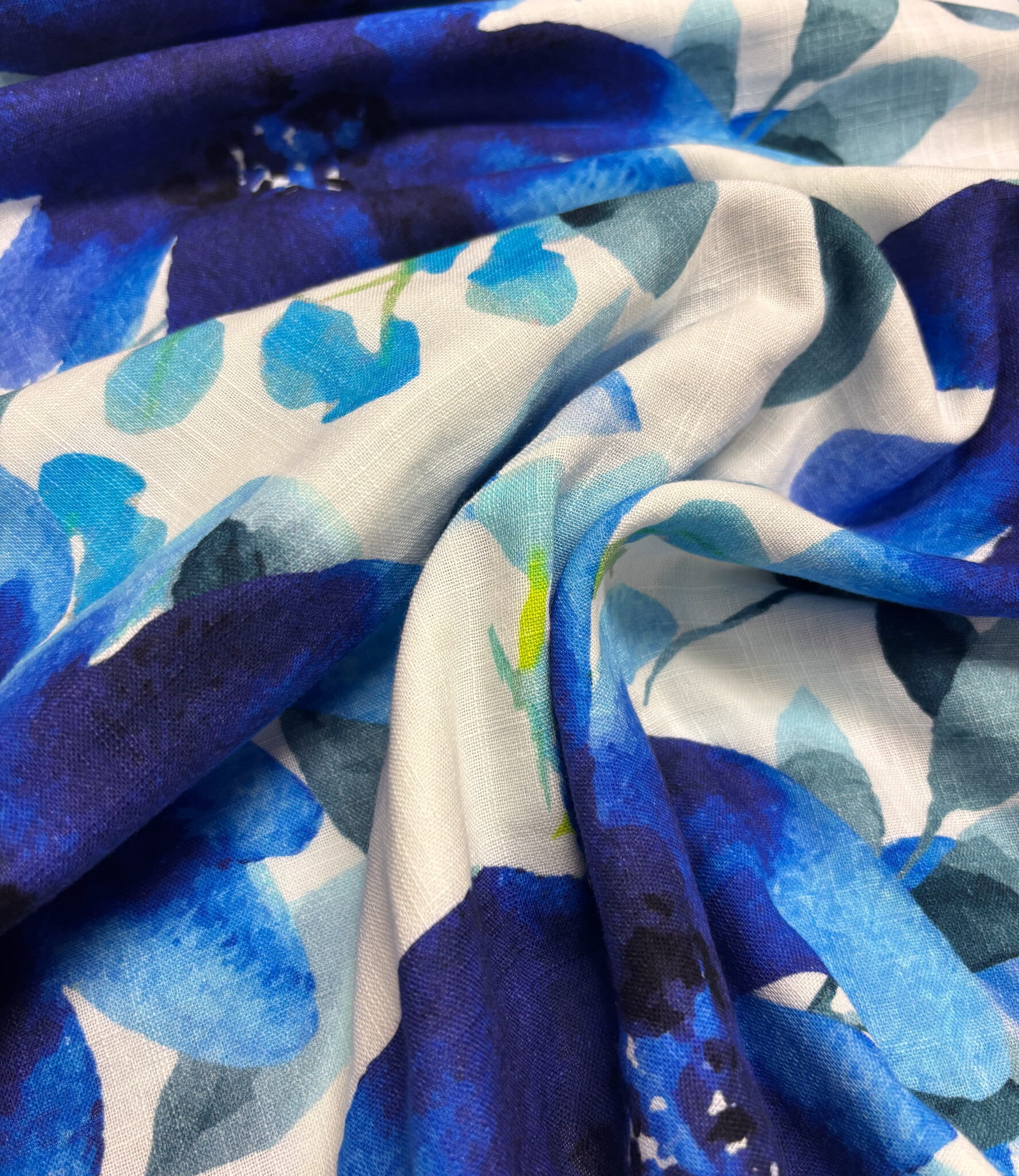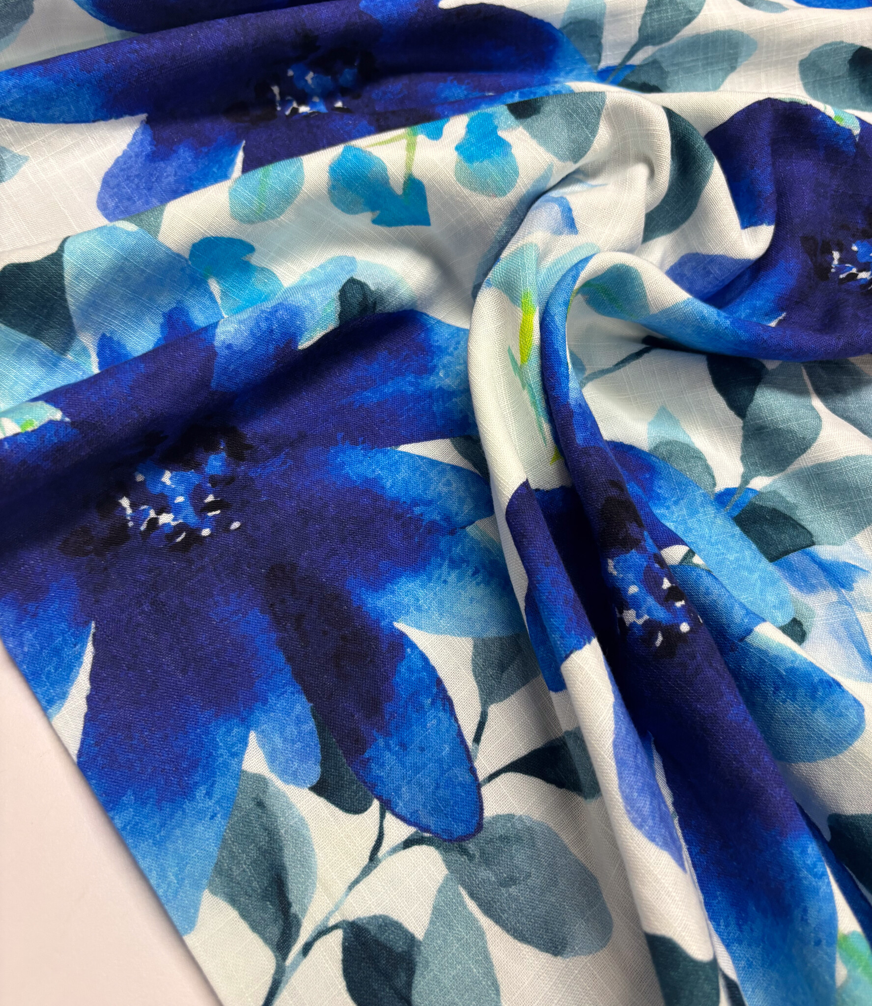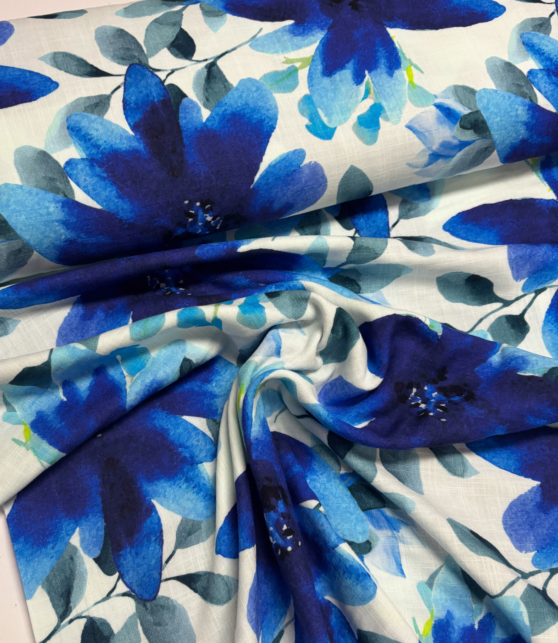 Een double gauze stof met blauwe bloemen. Swafing Stoffe.