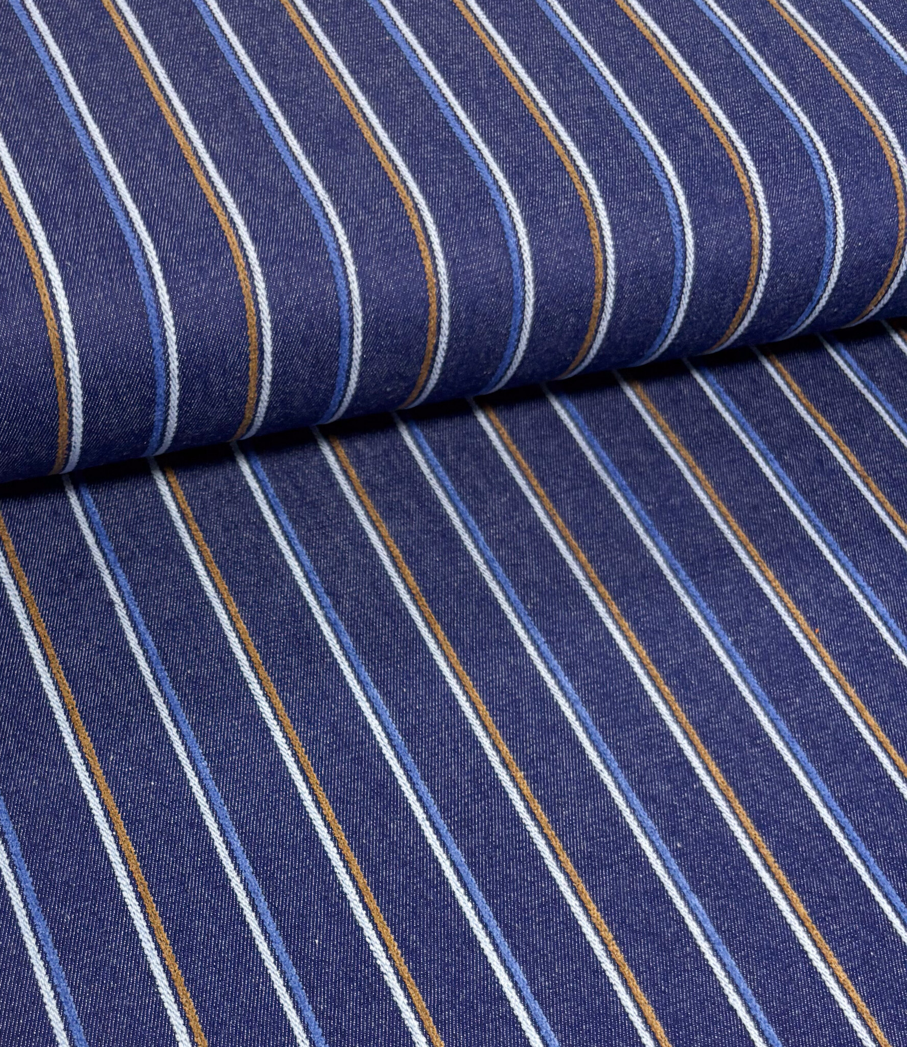 Een prachtige jeans stof met strepen. Deze stof wordt gebruikt in het Poppy magazine editie 26.