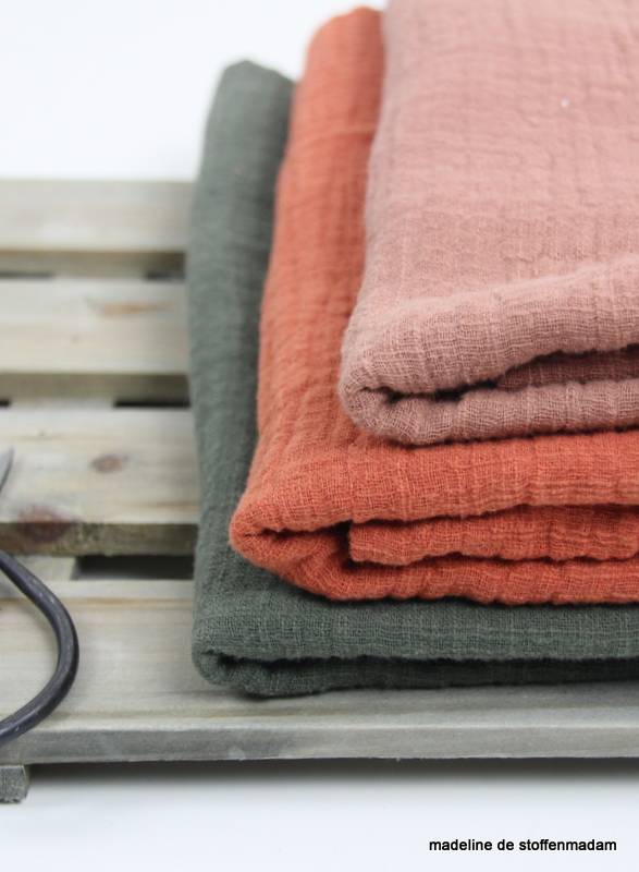 Een superzachte katoen met linnen look. Deze katoen linnen mix is een double gauze. Een double gauze stof heeft twee dunne laagjes katoen aan elkaar geweven.