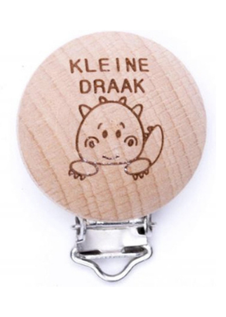 Een schattige fopspeenklem van glad hout met tekst "Kleine draak".