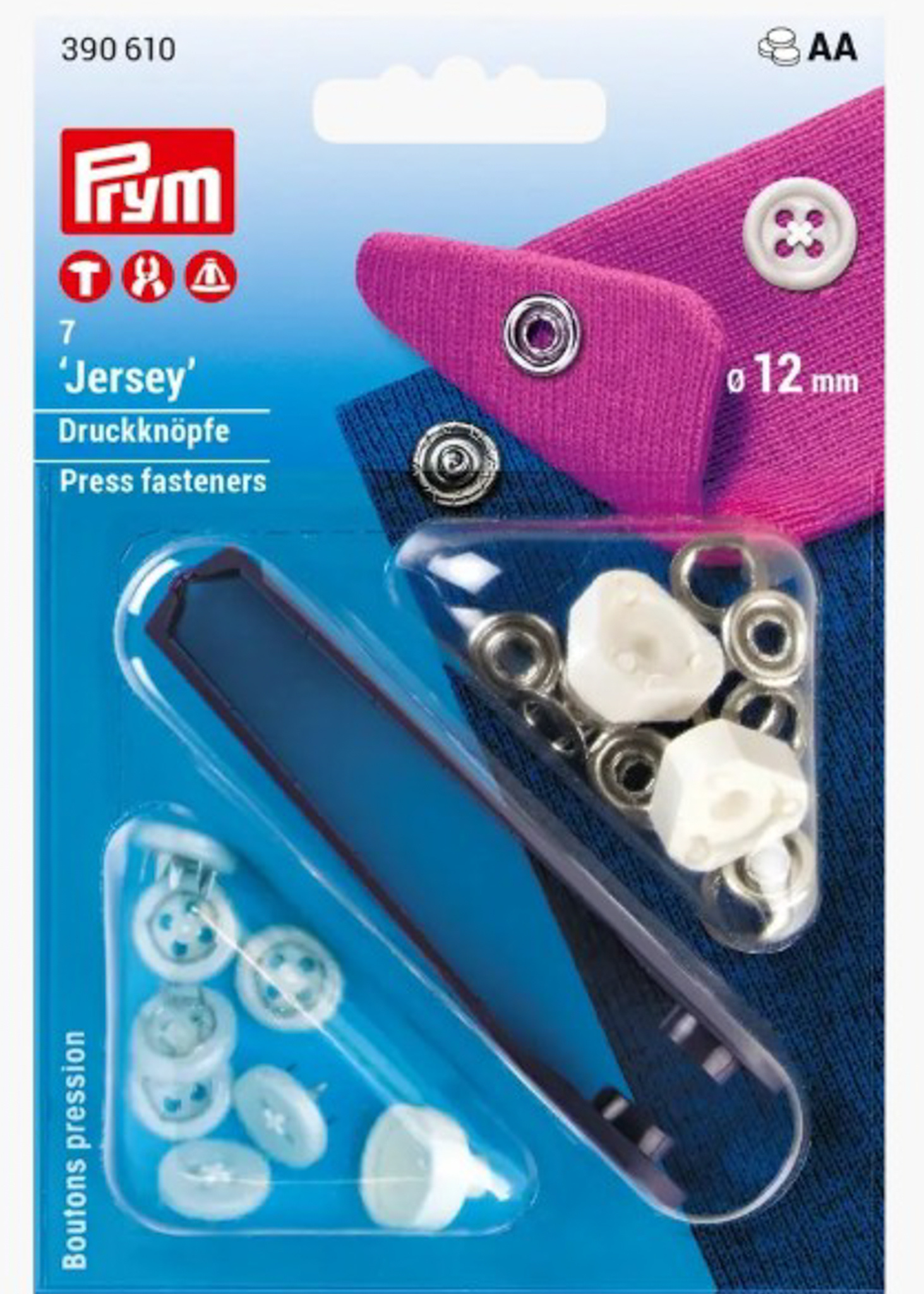 Deze naaivrije jersey drukknopen van Prym met een doorsnede van 12 mm zijn dé oplossing De bovenkant van deze drukker lijkt namelijk op een gewone aangenaaide knoop met 4 gaatjes. Ideaal voor wie een hekel heeft aan knopen aannaaien of knoopsgaten maken.