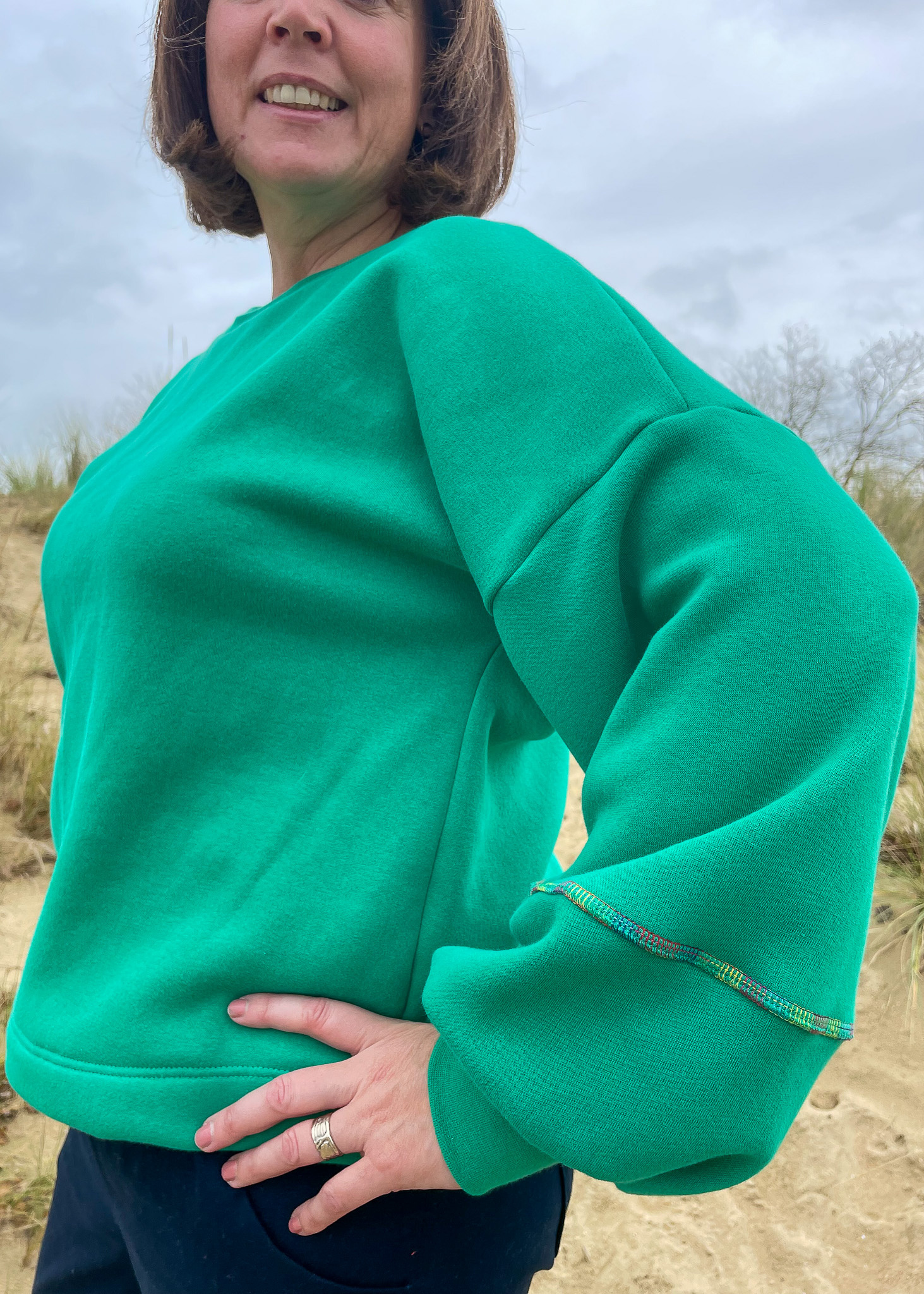 - de mouw onderaan met jacquard (of een andere soepele stof) in één deel (zie foto's)