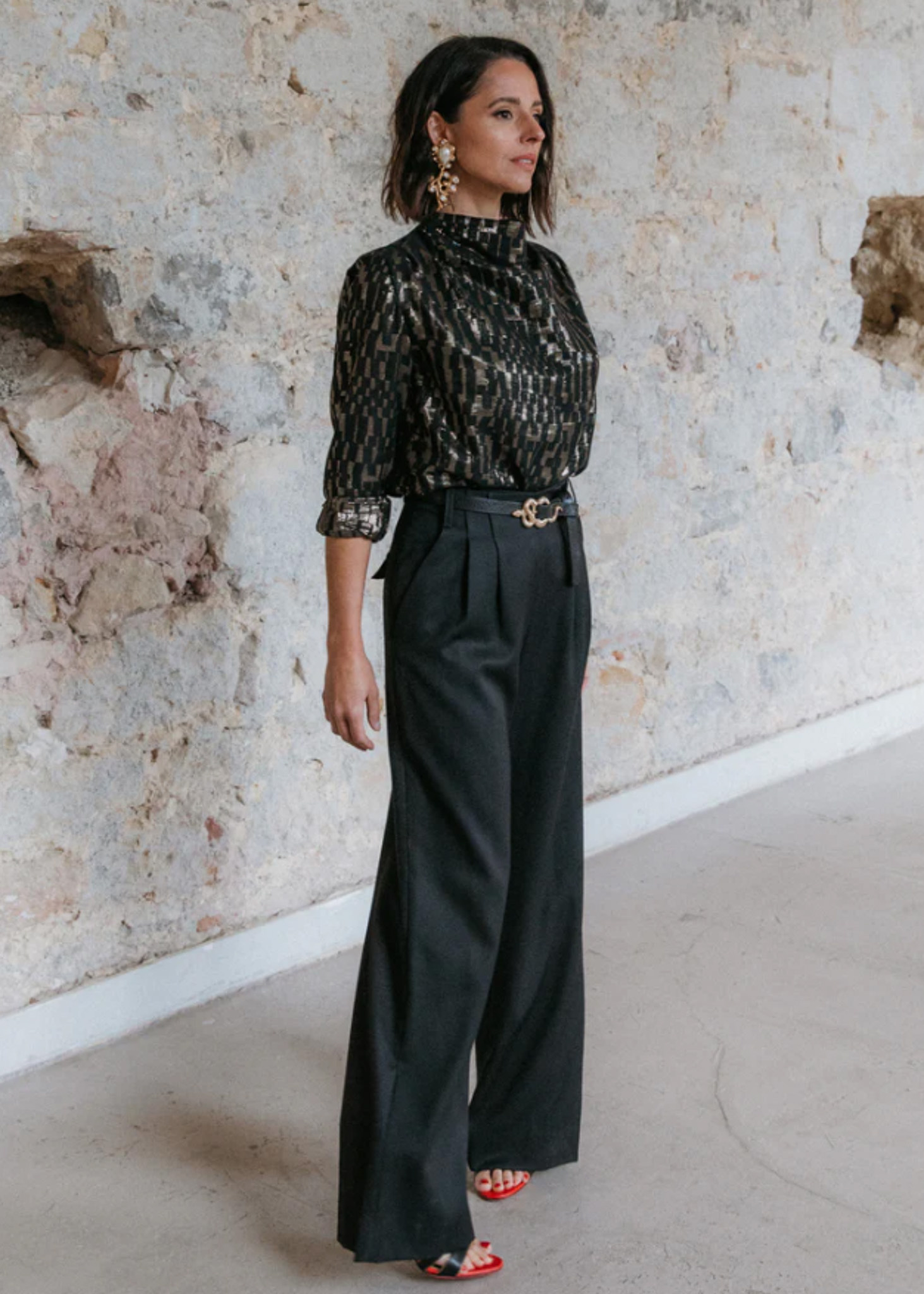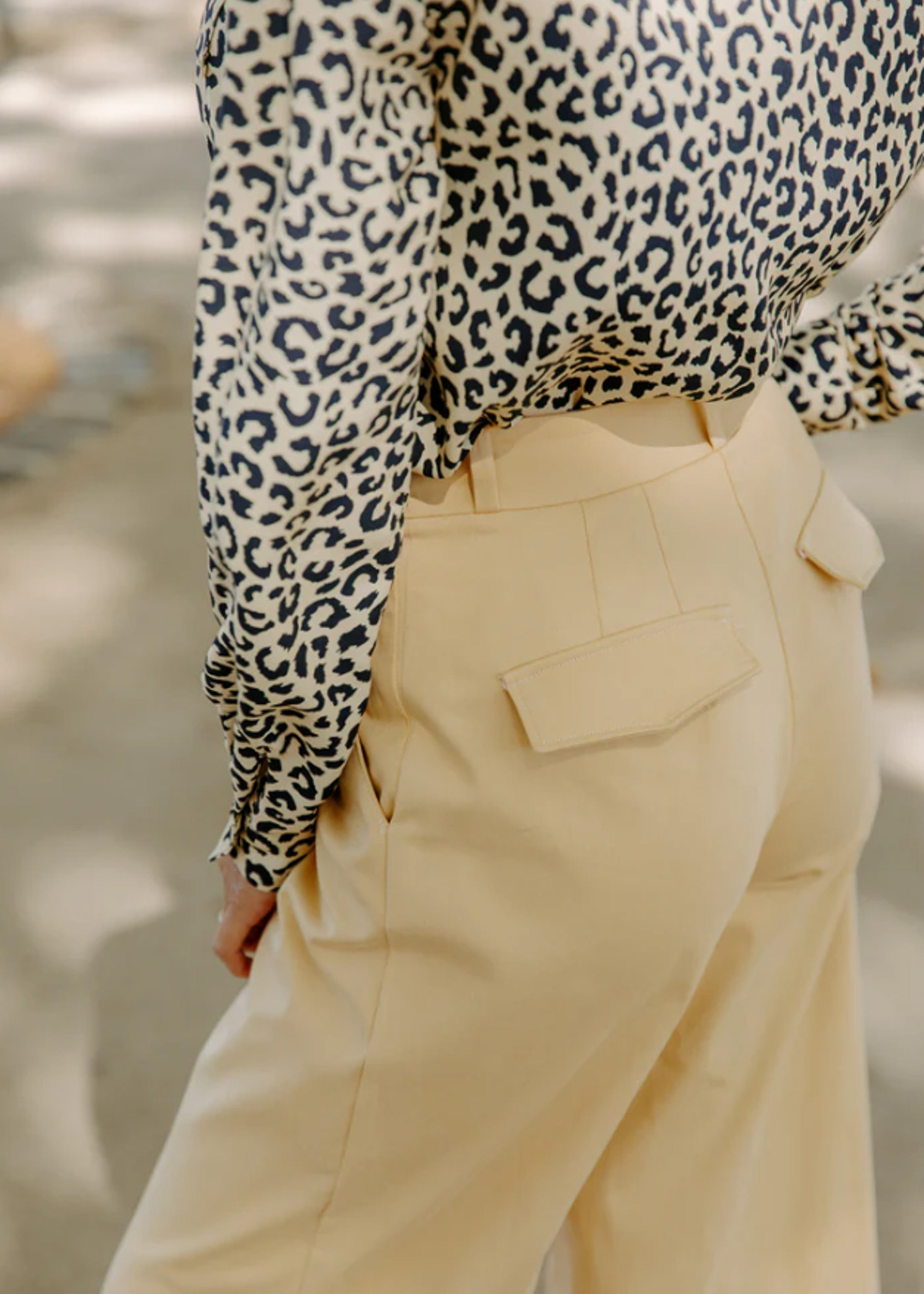 De Brooklyn broek is dé must-have van de Empire State of Fauve collectie: een wijde snit, een licht verhoogde taille en een nauwsluitende pasvorm rond het bekken voor een stijlvolle look. De onzichtbare zijrits zorgt ervoor dat de voorkant van de broek mooi vrij blijft, waardoor de gestikte plooien optimaal tot hun recht komen. Dankzij de lusjes kun je een riem dragen, en de dubbele figuurnaden achteraan met valse opgestikte zakken zorgen voor een flatterende pasvorm en een geaccentueerde taille, zonder de silhouet in te snoeren.