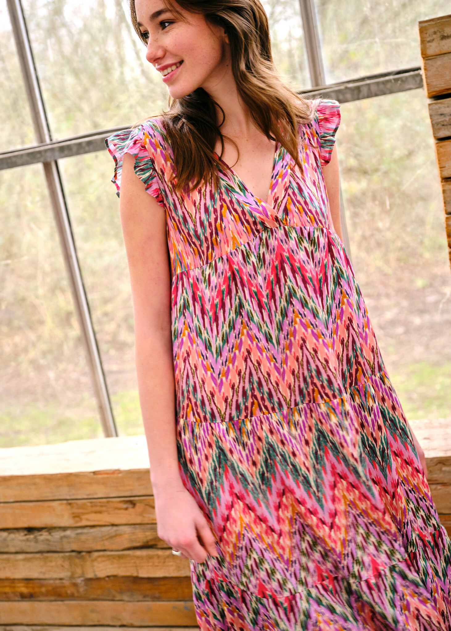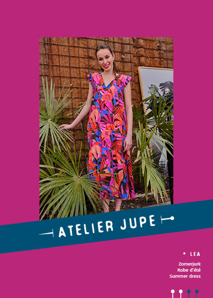 Zomerjurk Lea heeft een V-vormige halsuitsnijding afgewerkt met een boord, drie gefronste panden die haar een heerlijke zwier geven en een fijne elastiek in de rug zodat ze mooi aanpast.Lea is een mouwloze jurk, maar kan afgewerkt worden met een kort, gefronst mouwtje.