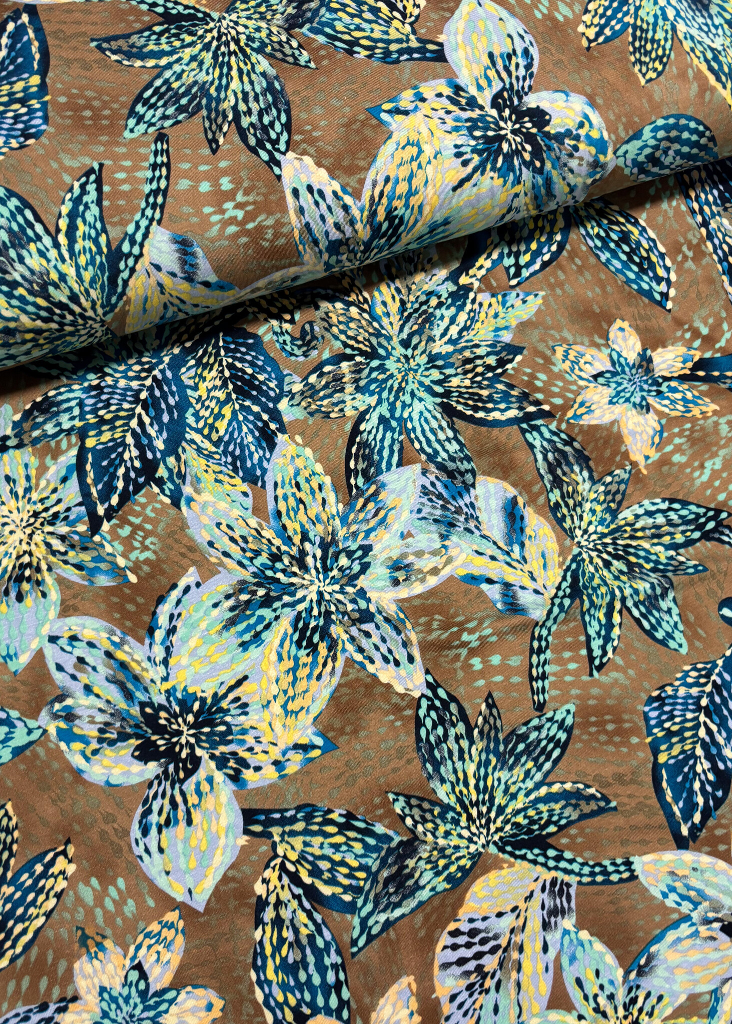Een fijn viscose tricot met bladeren. OEKO TEX. Zachte en soepelvallende stof, zeer geschikt voor T-shirts en sportieve jurken voor dames.