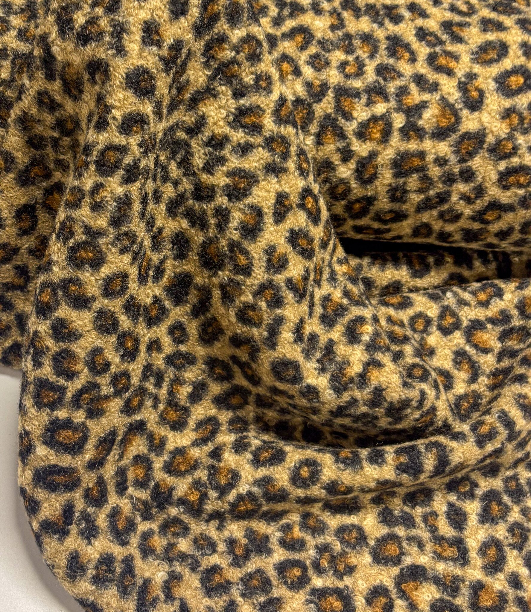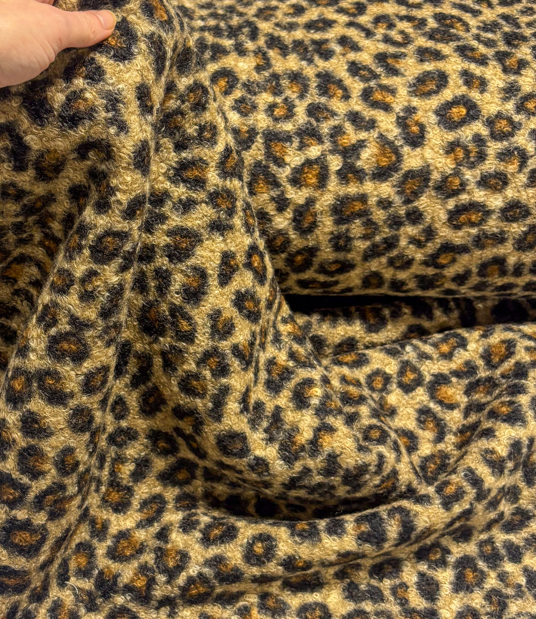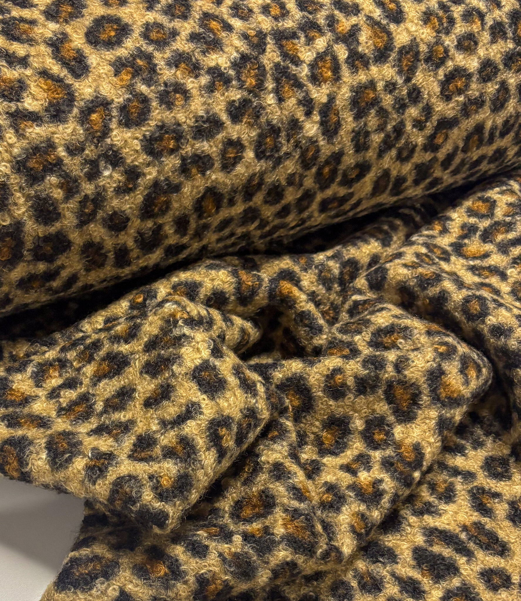 Een prachtige boucle mantelstof met luipaardmotief van A la Ville stoffen. Perfect voor de Junna vest van Bel Etoile en voor de Julia sweater van Atelier Jupe.