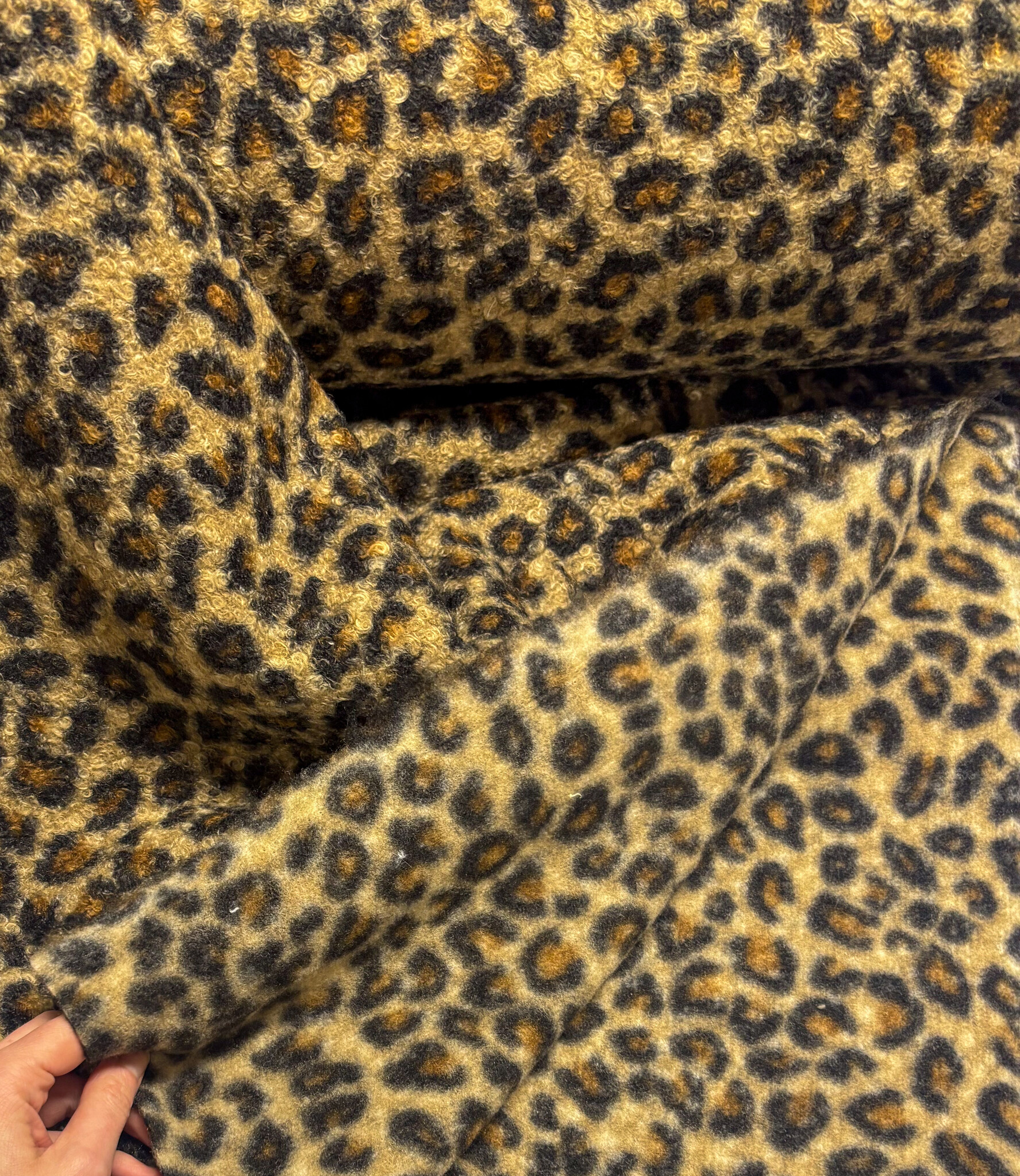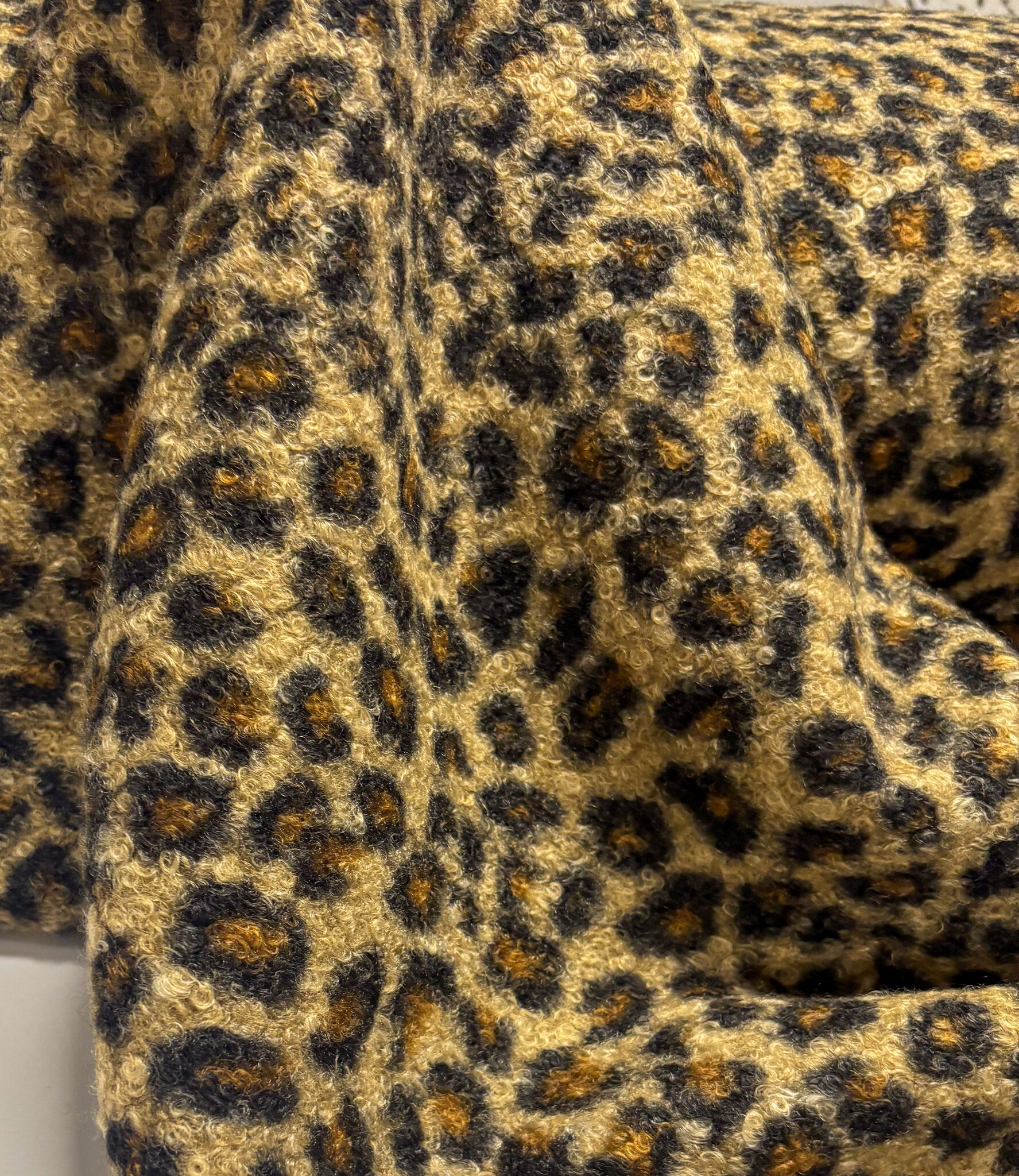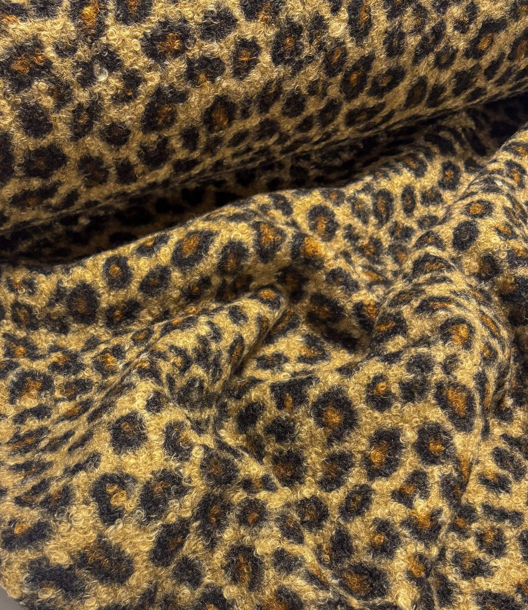 Een prachtige boucle mantelstof met luipaardmotief van A la Ville stoffen. Perfect voor de Junna vest van Bel Etoile en voor de Julia sweater van Atelier Jupe.