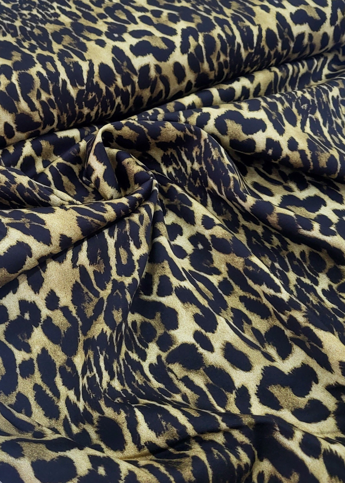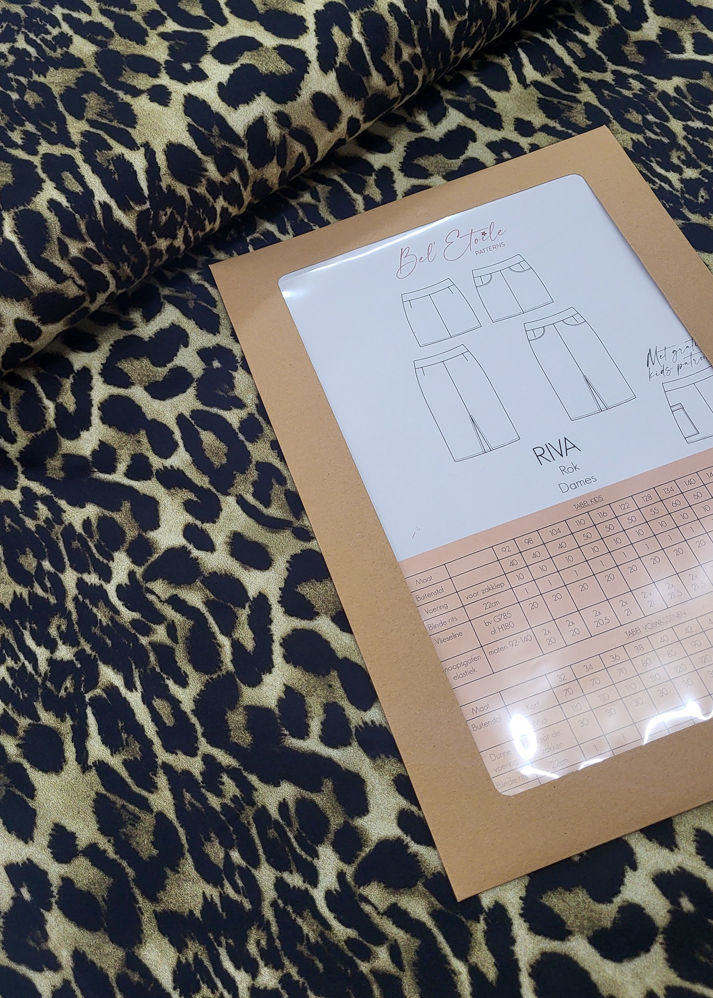 Een hele mooie kwaliteit stretchkatoen met leopard print. Komt mooi terug in vorm. Ideaal voor een rechte rok (Riva rok) of jeansbroek. Een ideaal gewicht, zalig om te verwerken en om te dragen.