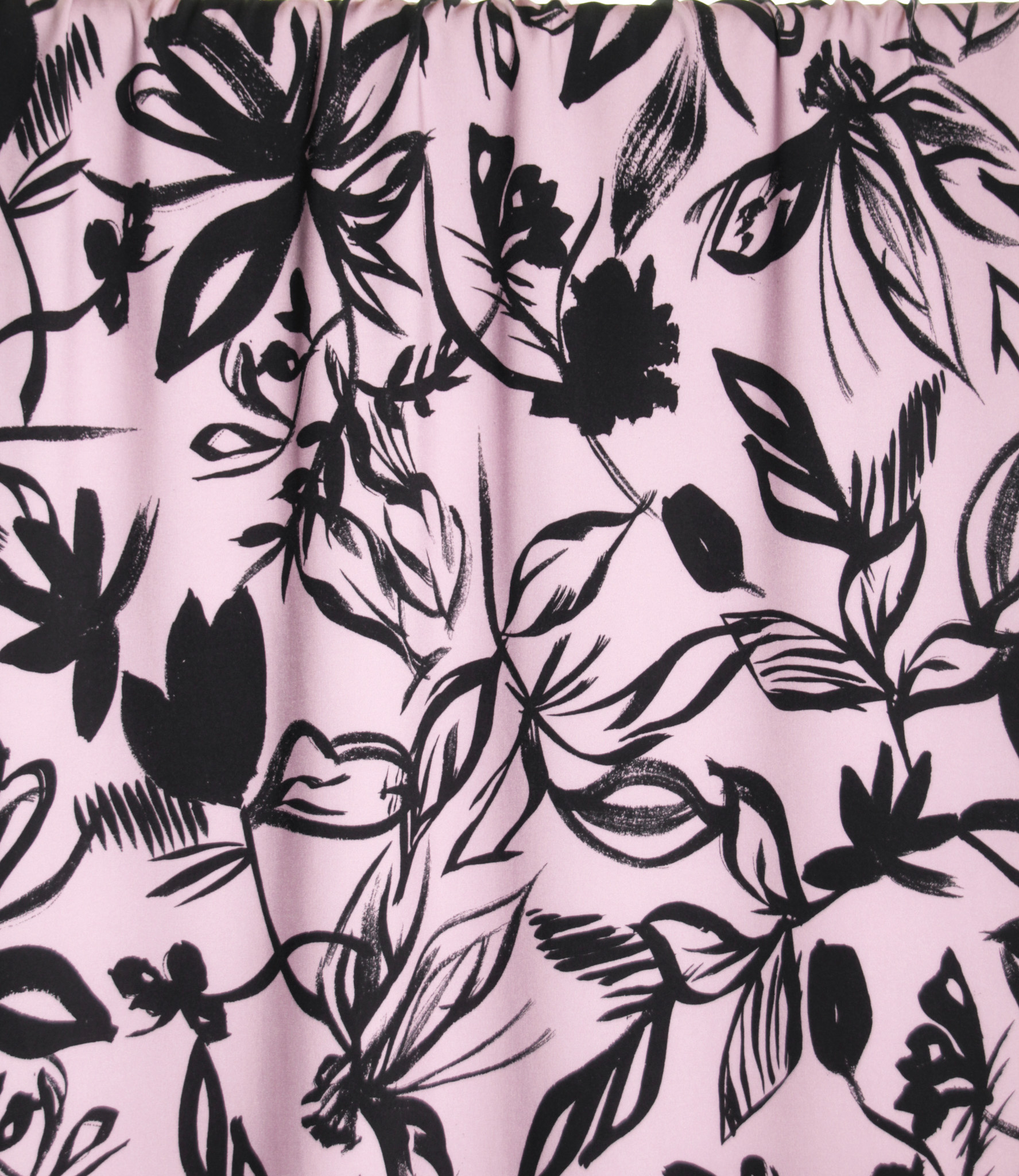 Een lila viscose met zwarte bloemenprint. Deze stof is geschikt voor blouses, jurken, rokken,...