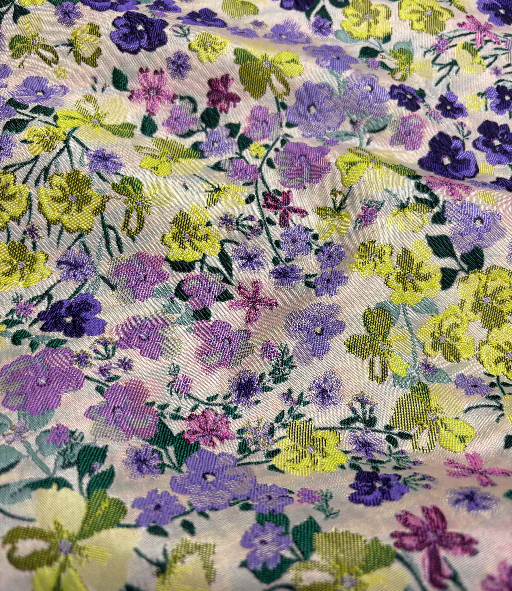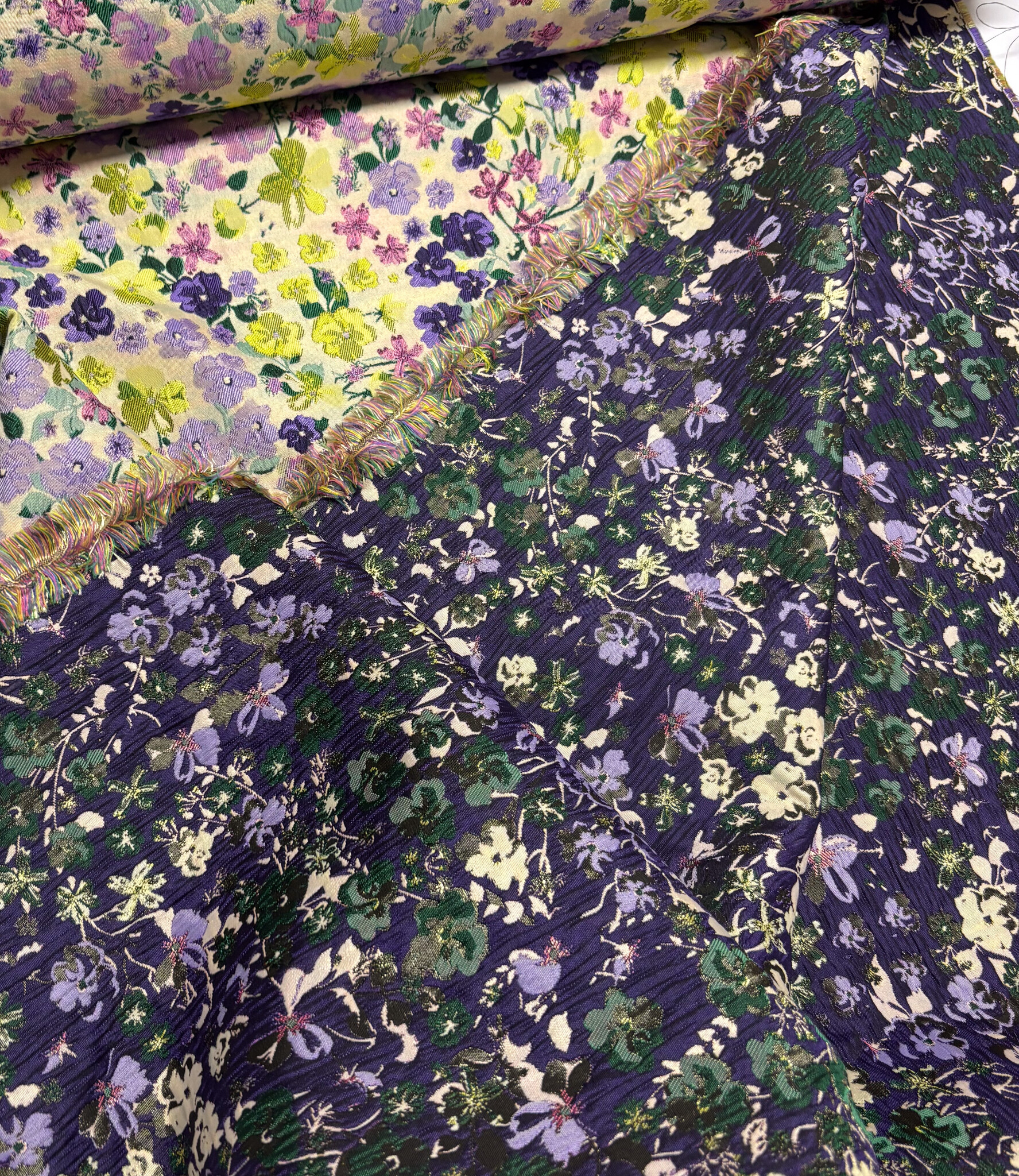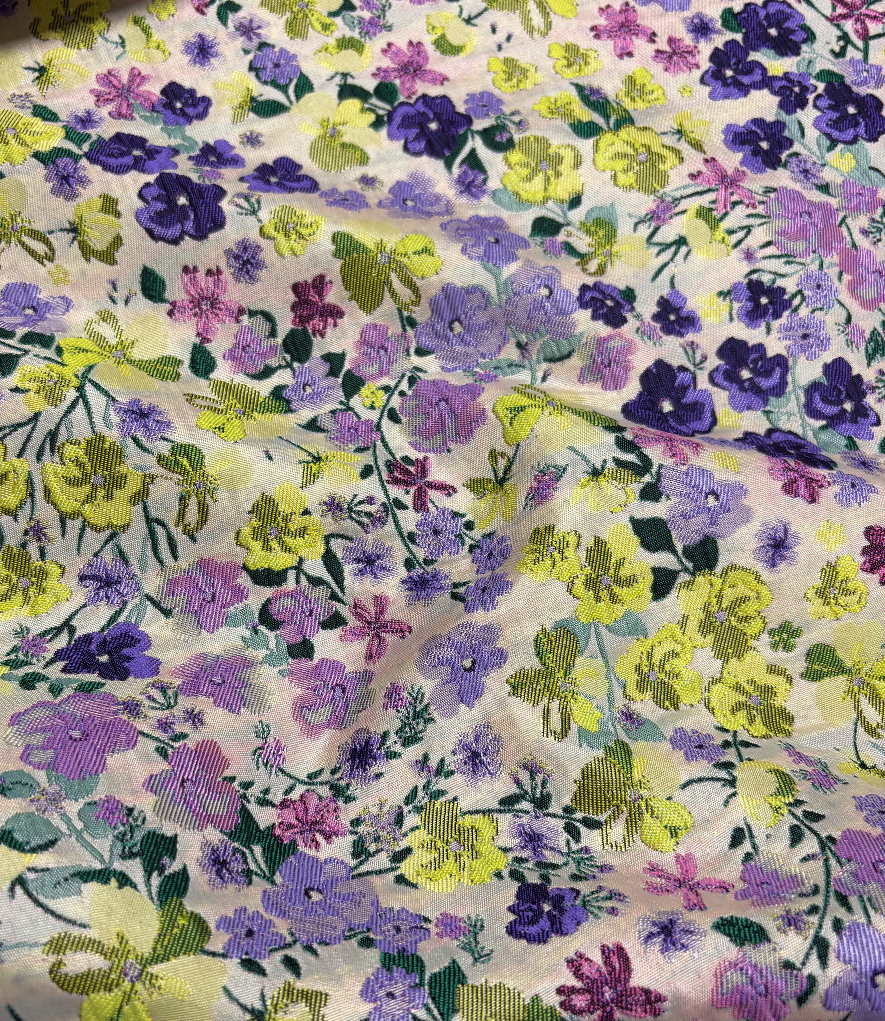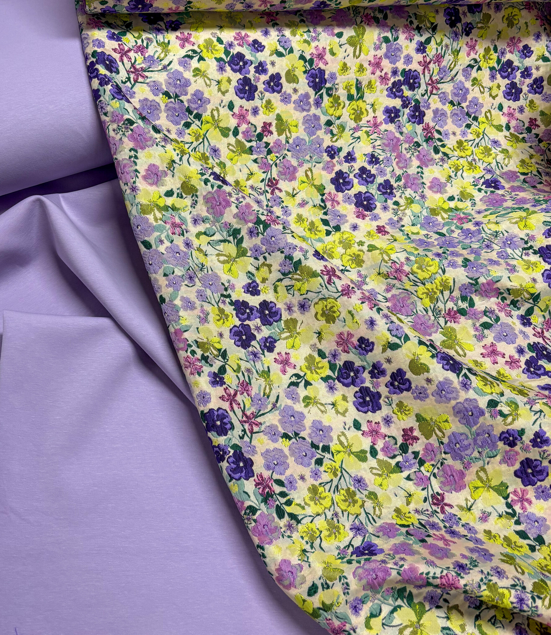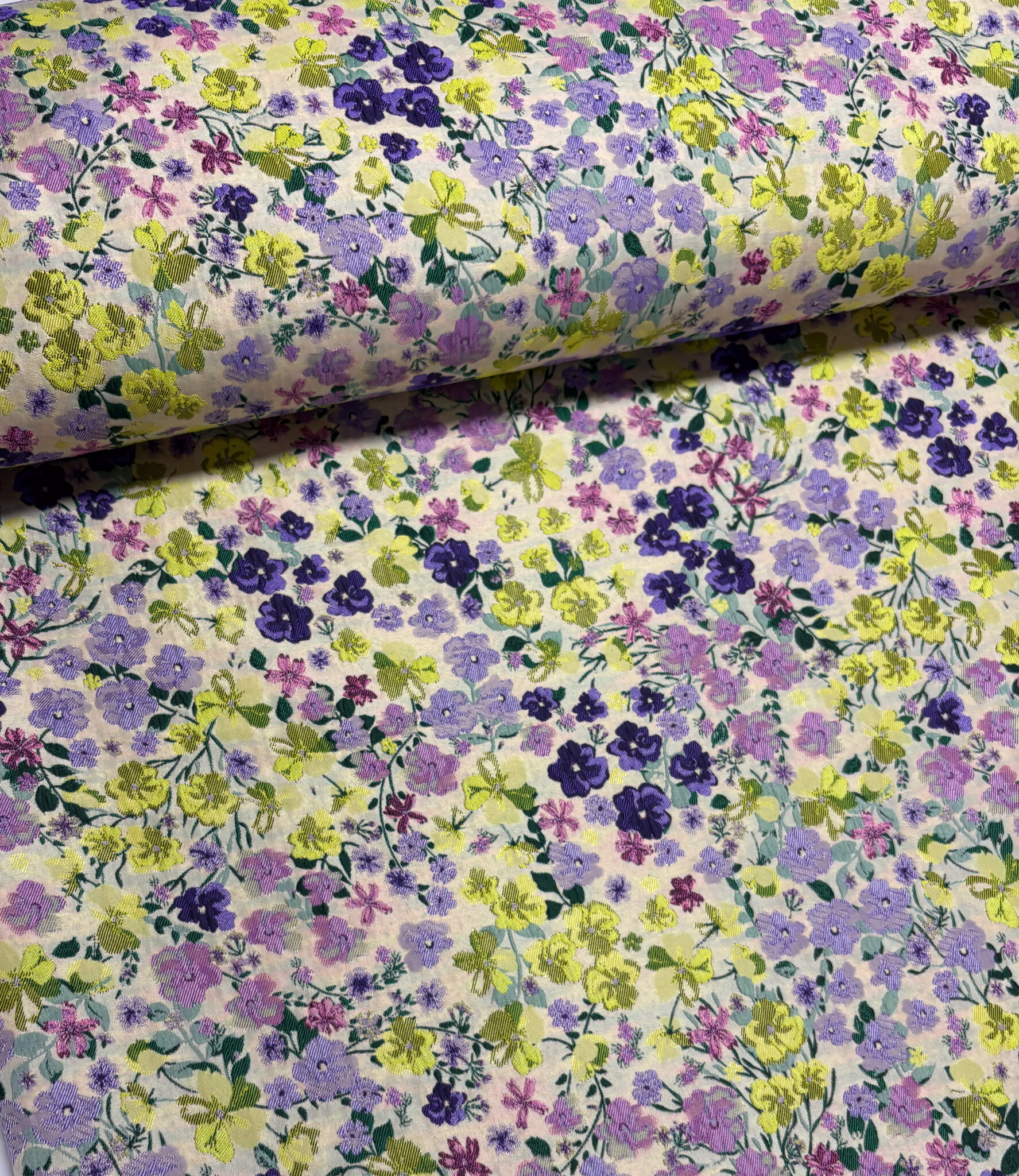 Een prachtige geweven jacquard met bloemen. Deze jacquard is licht en soepel. De stof tussen de bloemen is licht transparant. Dat maakt de stof ideaal voor feestelijke blouses en tops. Heel mooi effect! Als accentmouw in een bloesje of sweater kan deze stof zeker ook.