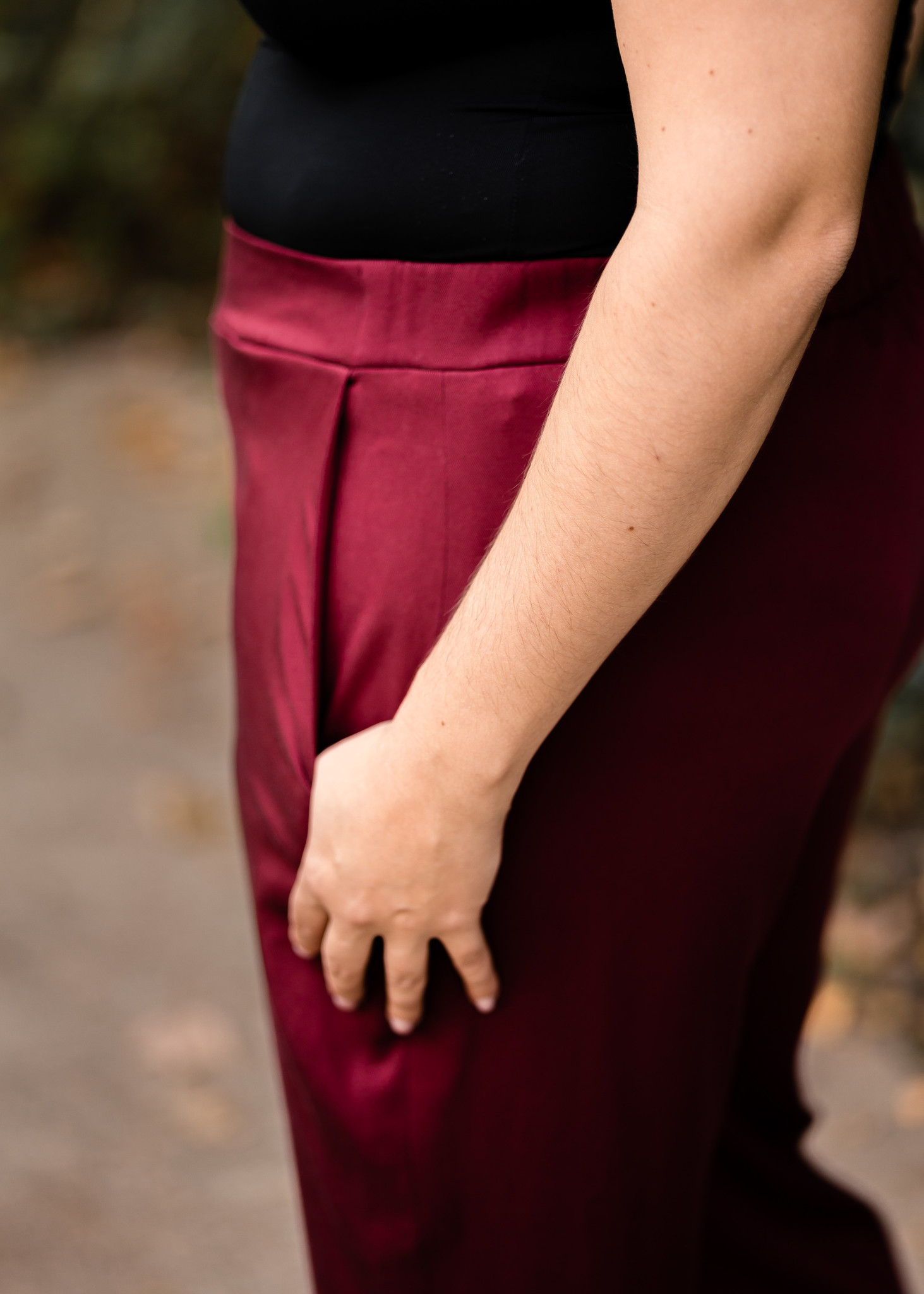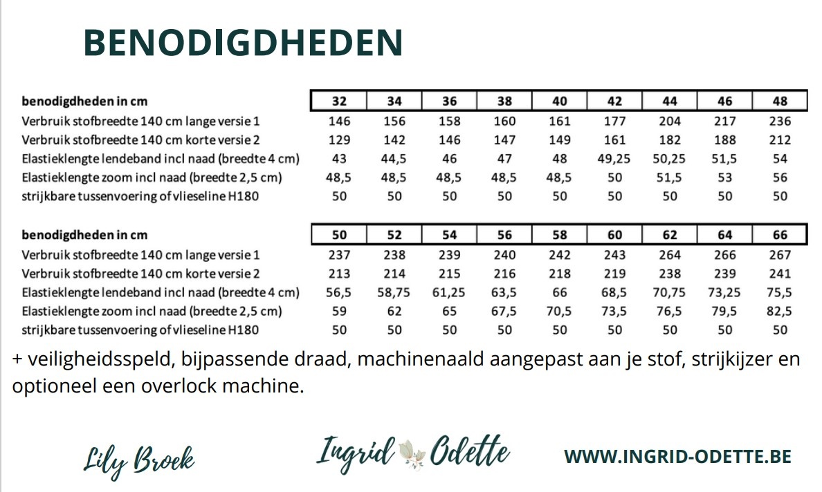 Stofkeuze? De Lily broek is gemaakt voor soepele, goed doorvallende stoffen zoals viscose, crêpe, satijn, tencel. Je kan ook stoffen nemen met een licht stretchpercentage (max 5%). Een middelzware stof zoals ribflueel, linnen is ook mogelijk maar daardoor zal de broek wat stijver staan.