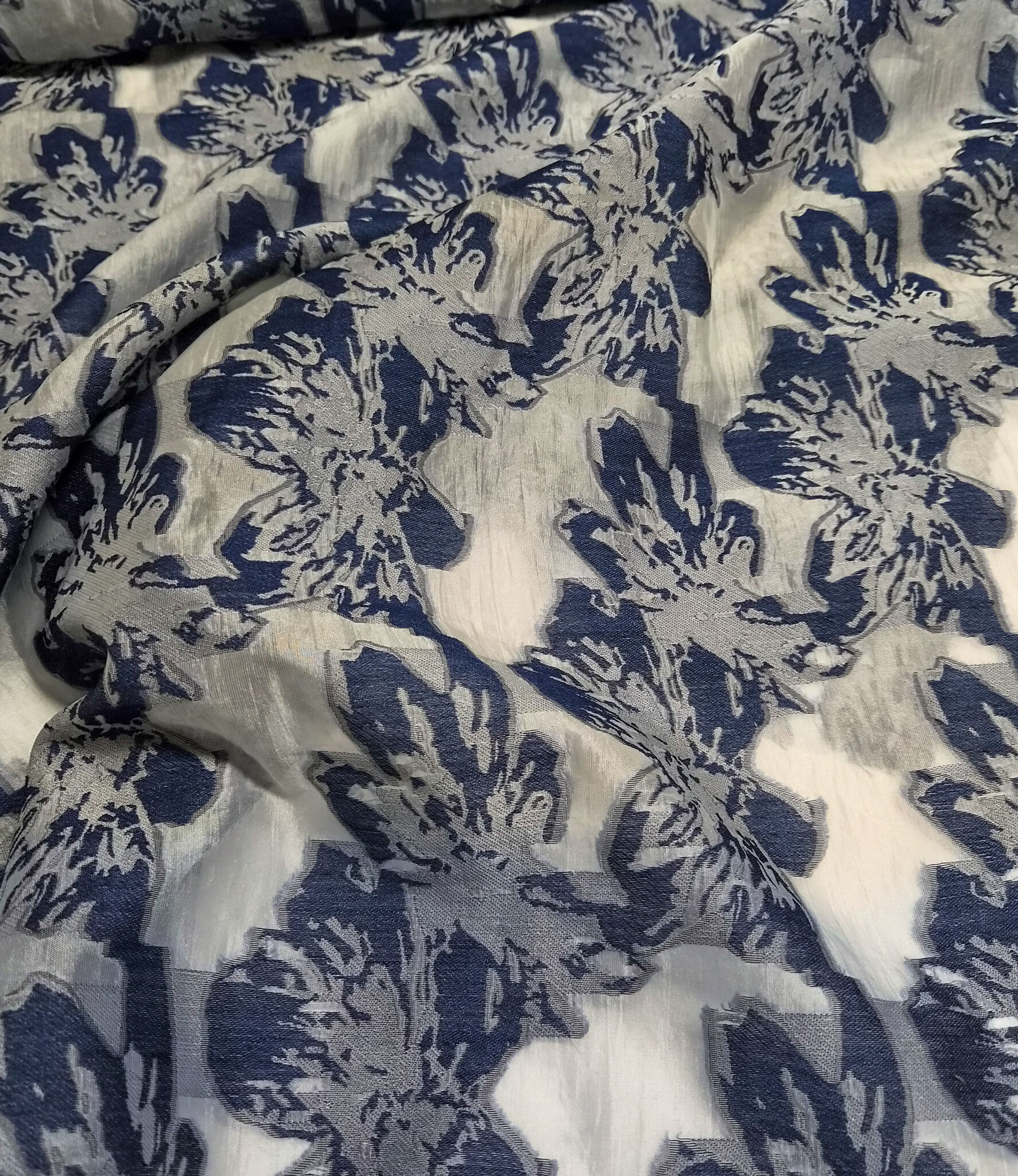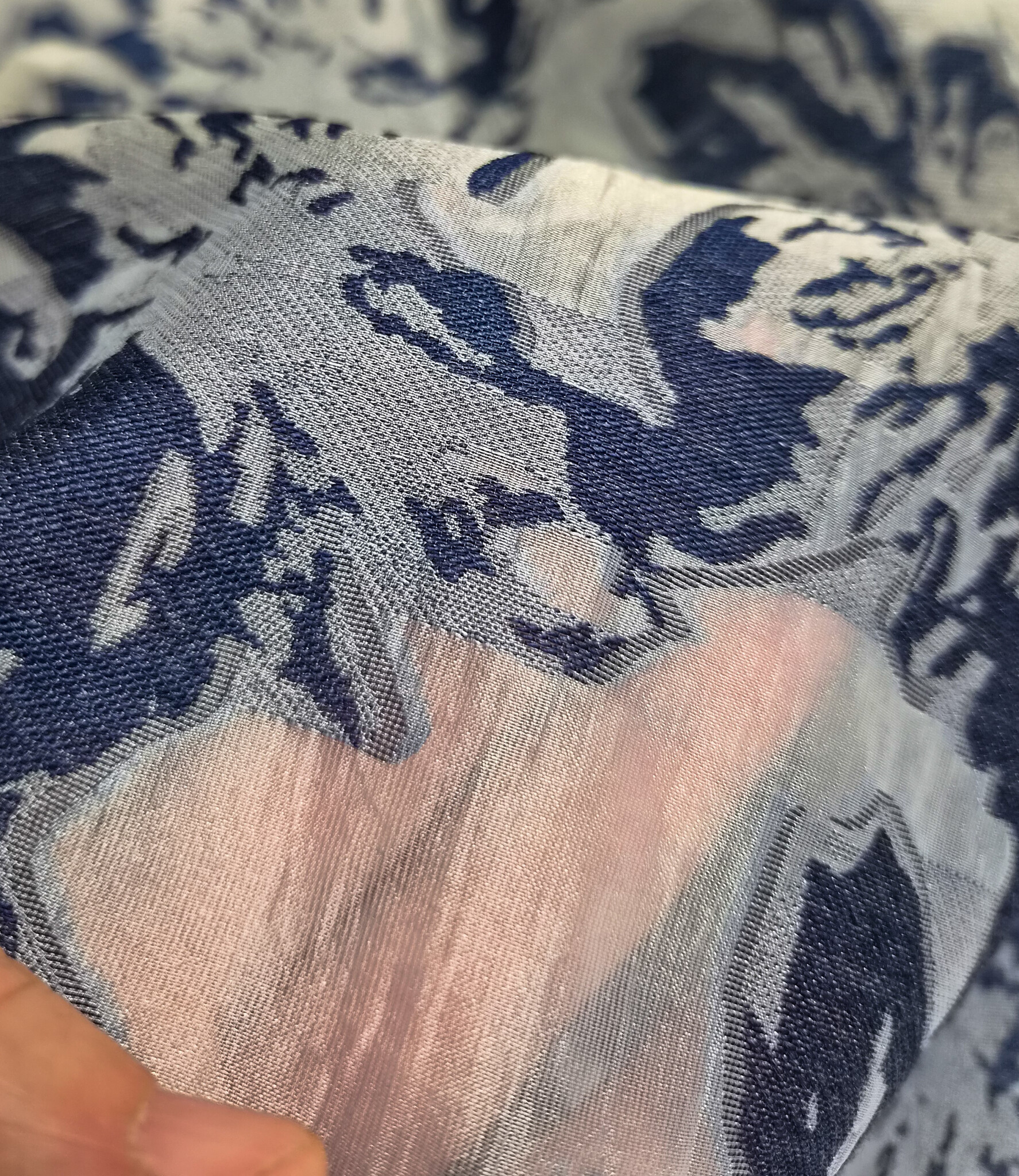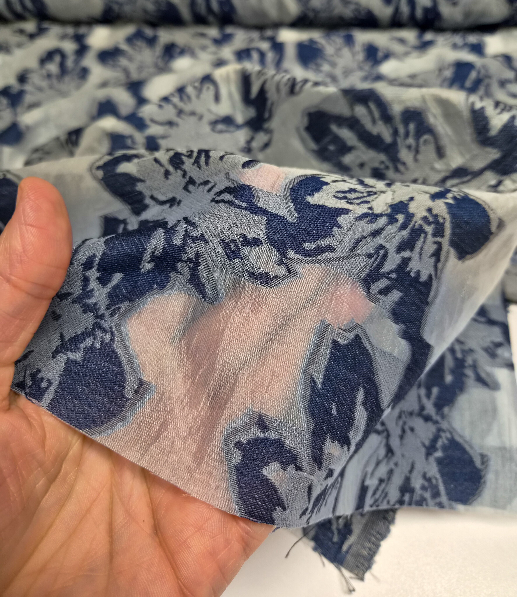 Katoenmix, voile stof. Doorschijnend, behalve op de plaatsen waar de bloemen geweven zijn. Heel mooi!