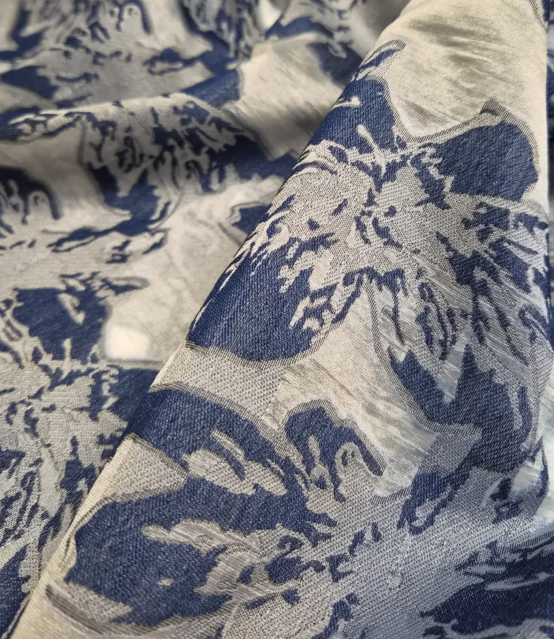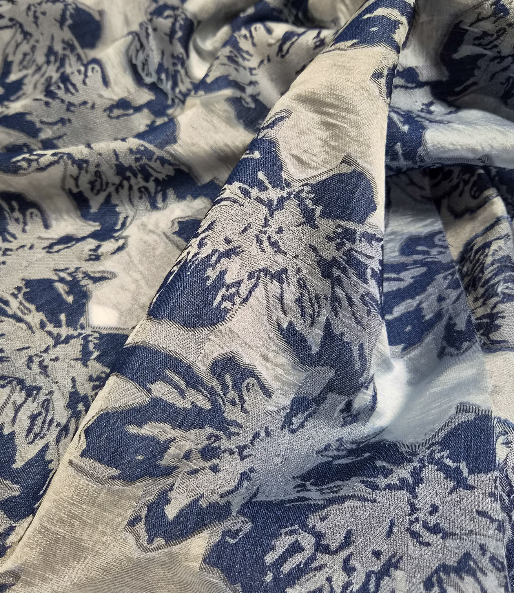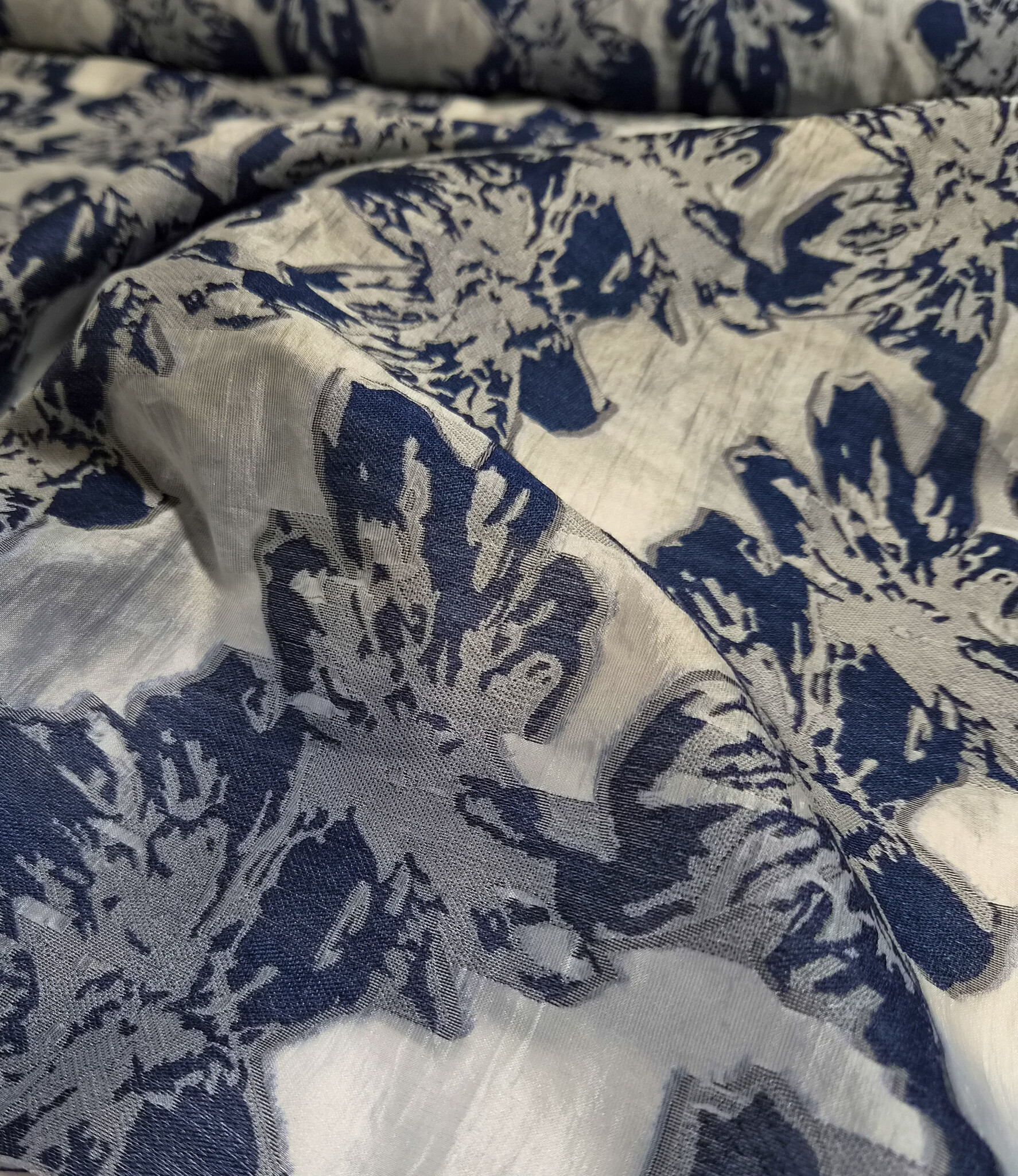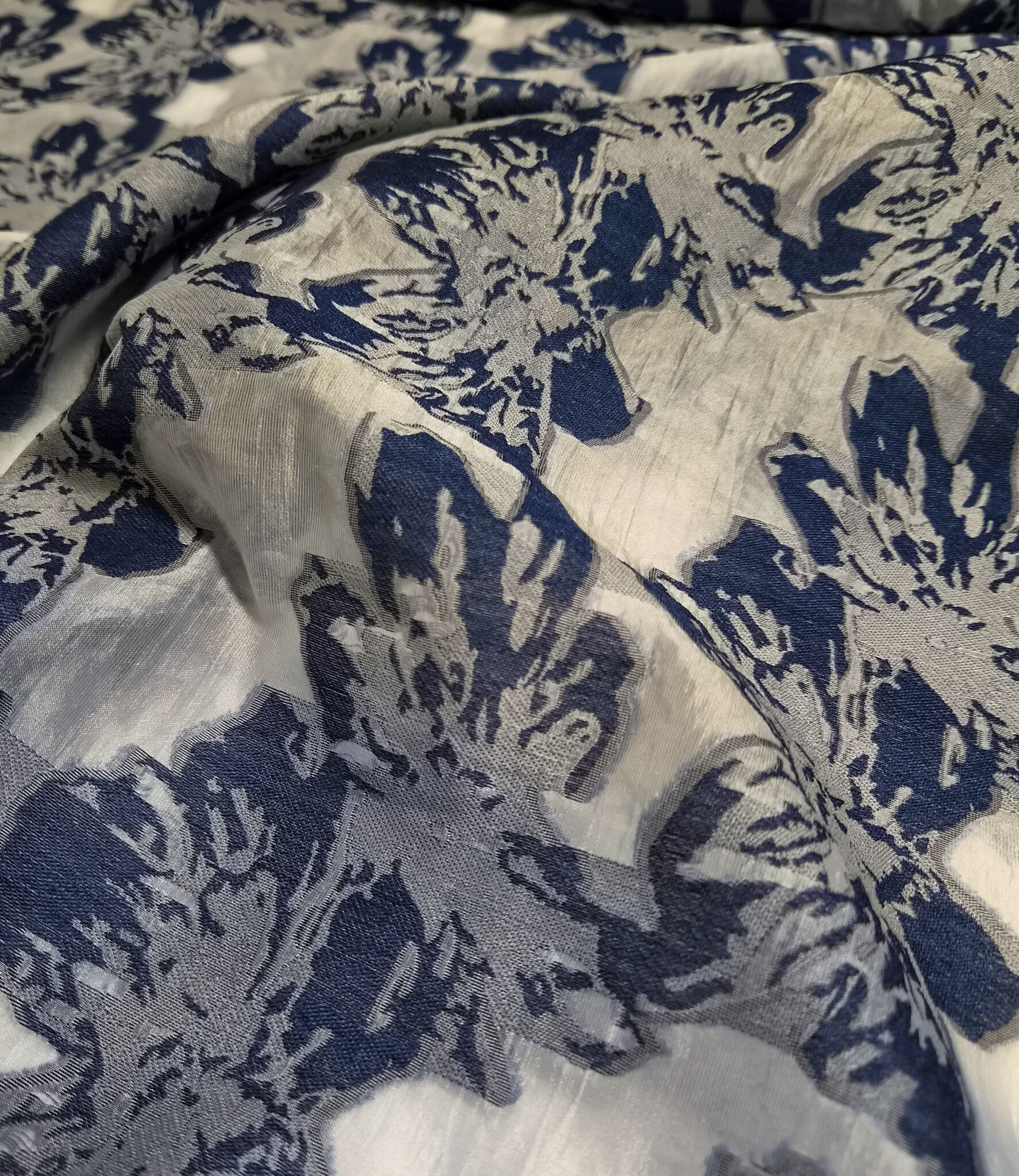 Katoenmix, voile stof. Doorschijnend, behalve op de plaatsen waar de bloemen geweven zijn. Heel mooi!