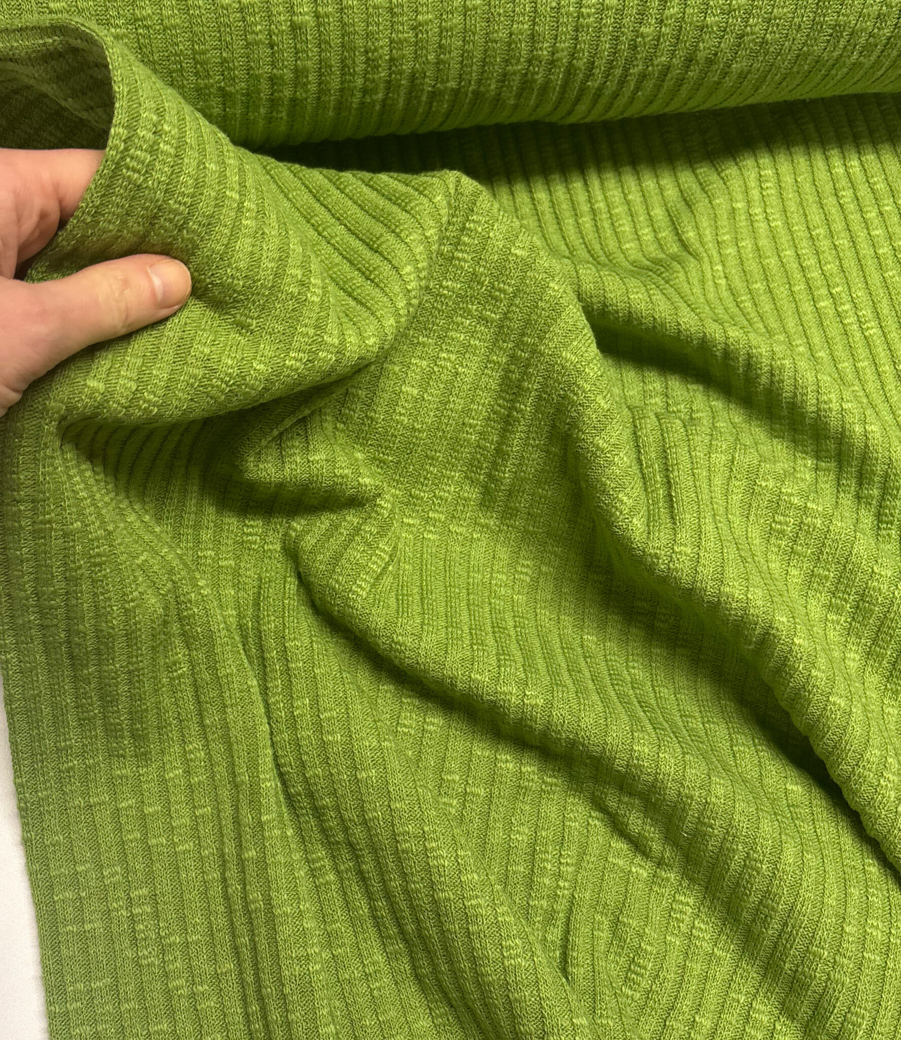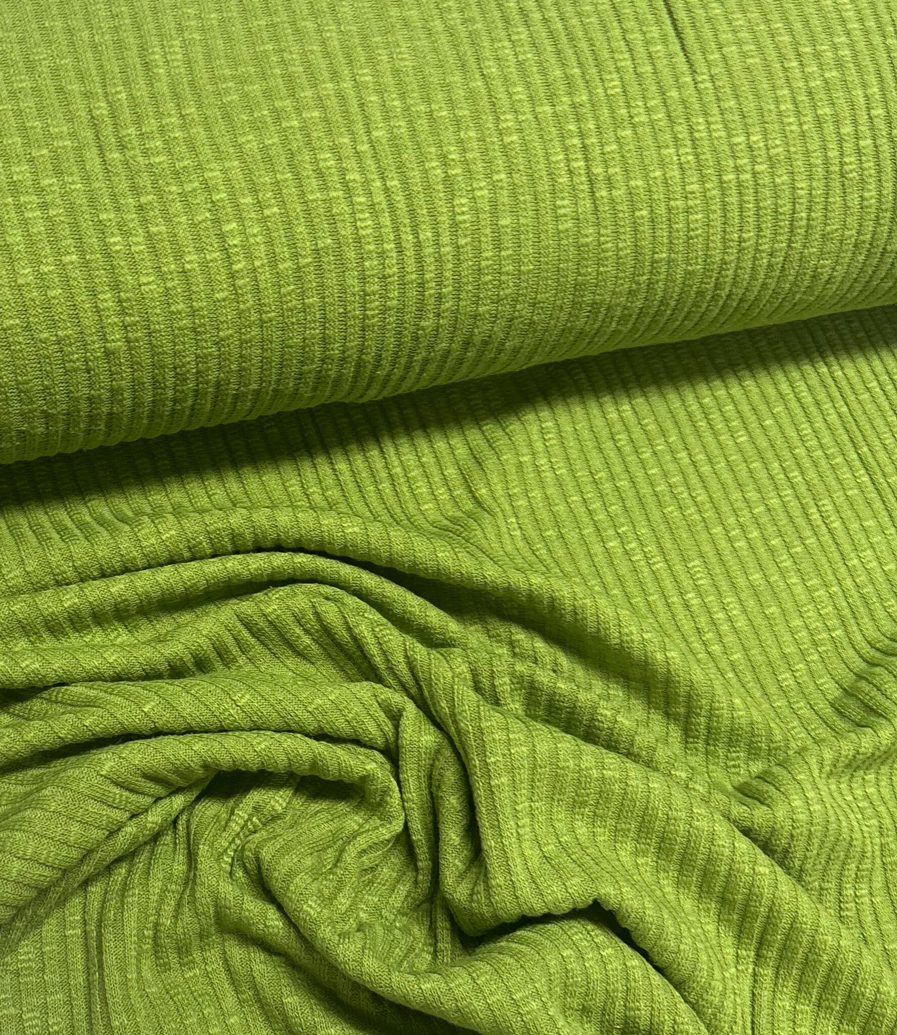 lime groen- katoen gebreid met ribbel - prachtige vormvaste stof - Madeline de stoffenmadam - Stoffenwinkel Lier ( Antwerpen )