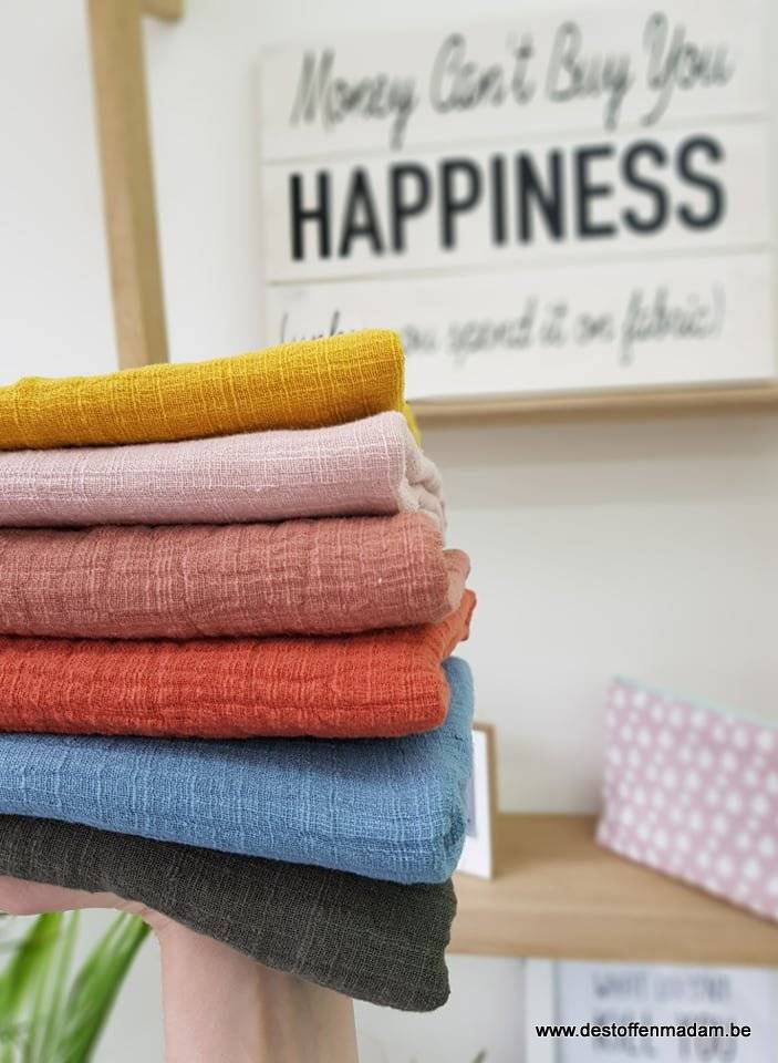 Een superzachte katoen met linnen look. Deze katoen linnen mix is een double gauze. Een double gauze stof heeft twee dunne laagjes katoen aan elkaar geweven.